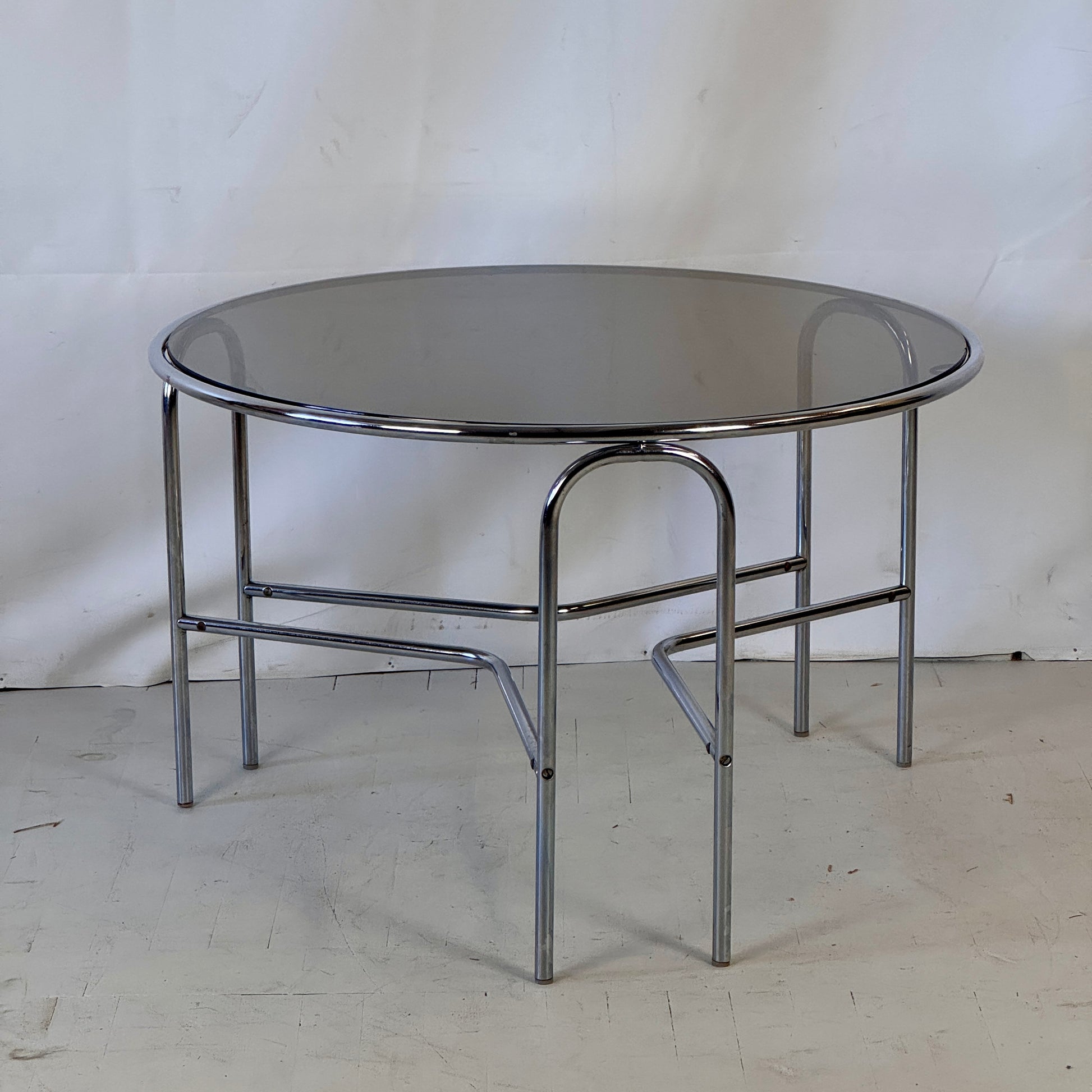 Elegant round Bauhaus-style coffee table featuring a black glass top and tubular steel frame. The table is in good vintage condition, though slightly loose due to age — easily restorable if desired. A great example of functional and minimalist Bauhaus design.