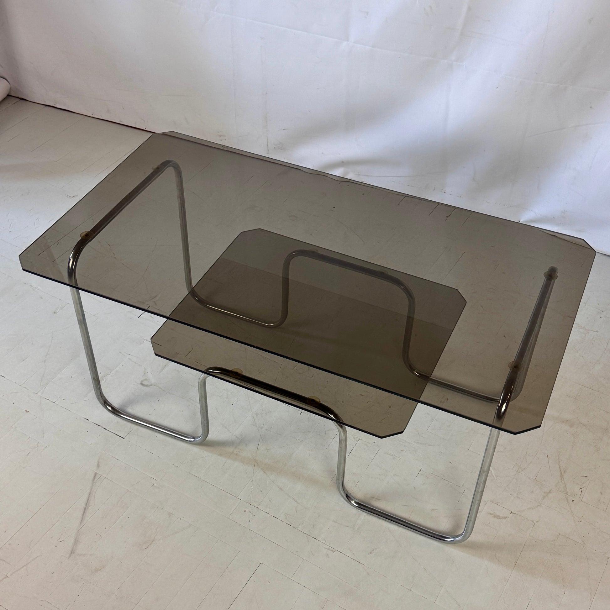 Elegant Bauhaus-style coffee table from the 1960s, featuring a dark smoked glass top and a sleek minimalist frame. A timeless mid-century piece that combines functionality with sophisticated design, perfect as a centerpiece in any modern interior.