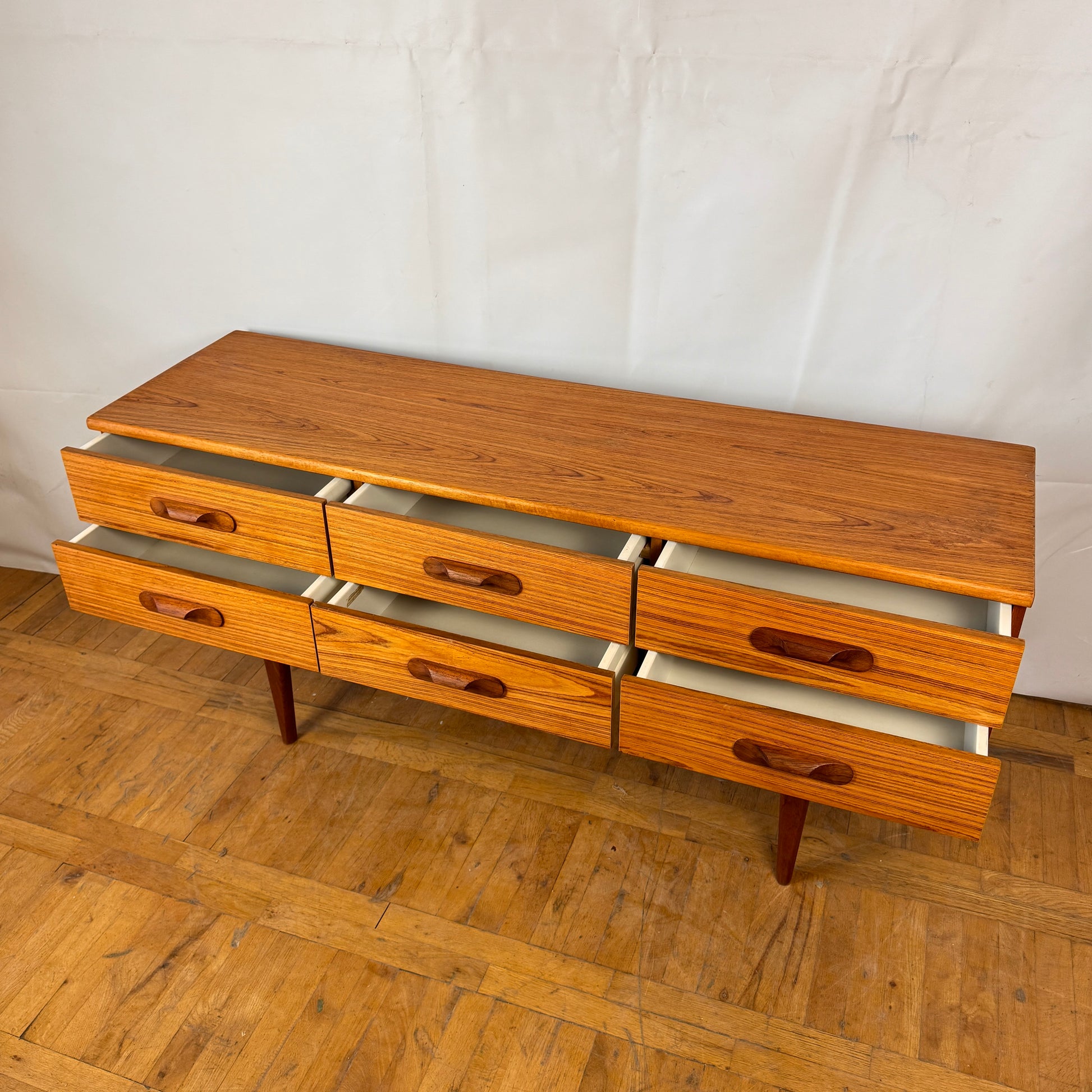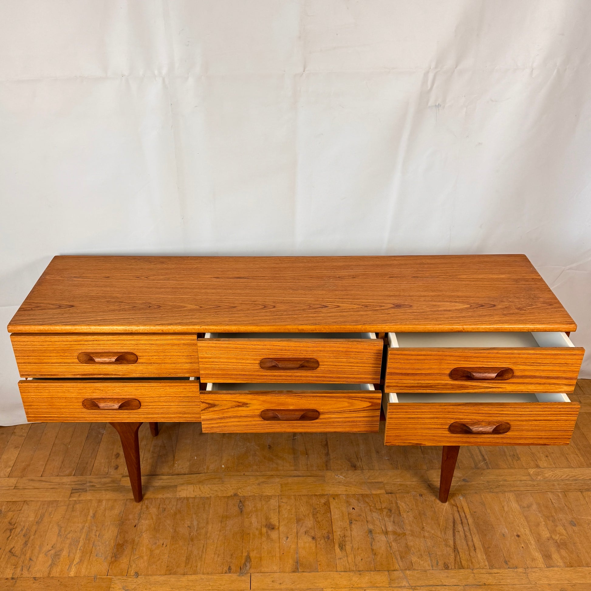 Crafted from teak in the UK during the 1970s, this sleek sideboard by Austinsuite features six spacious drawers, offering ample storage while maintaining a clean, minimalist profile. A fine example of British mid-century modern design, ideal for both living and dining spaces.