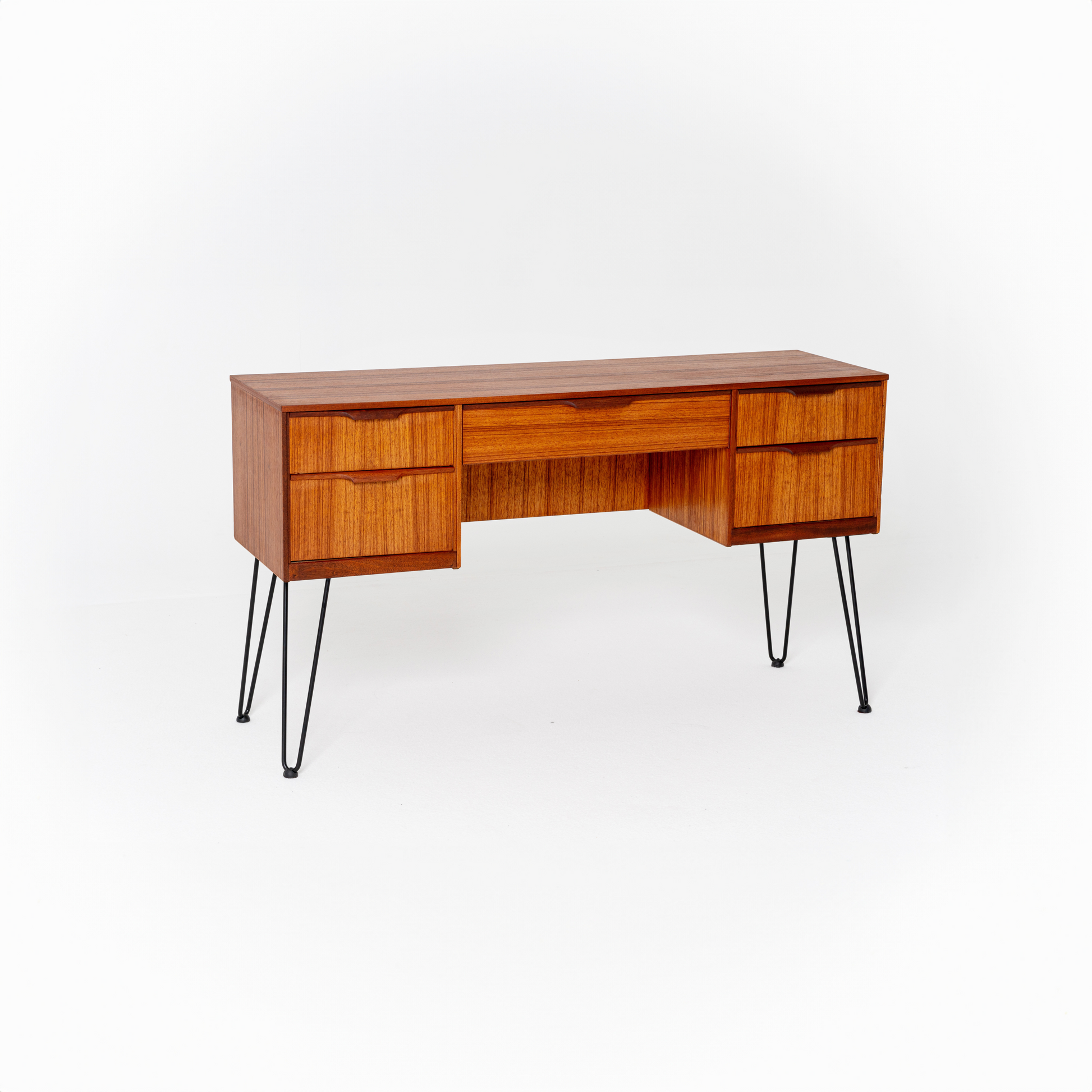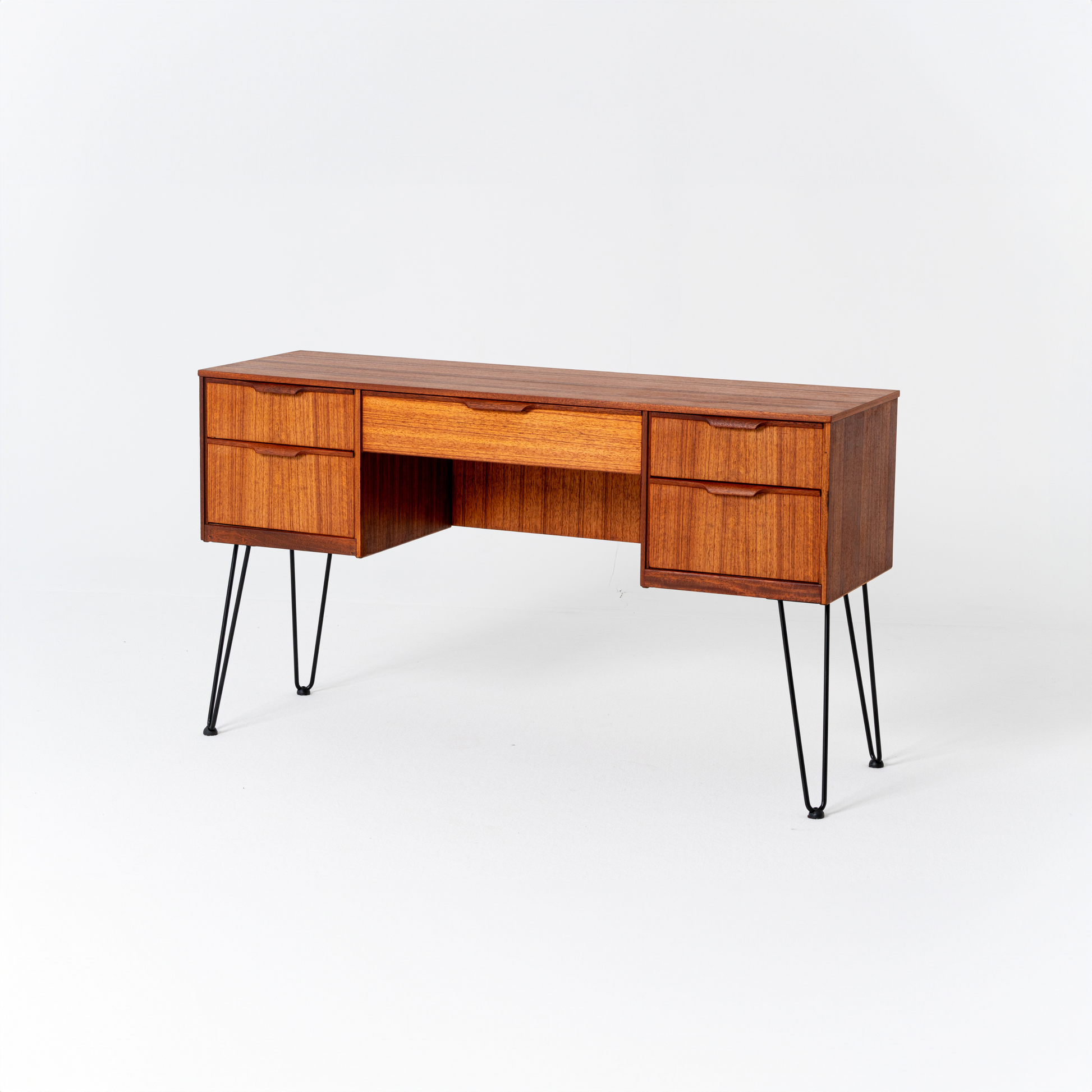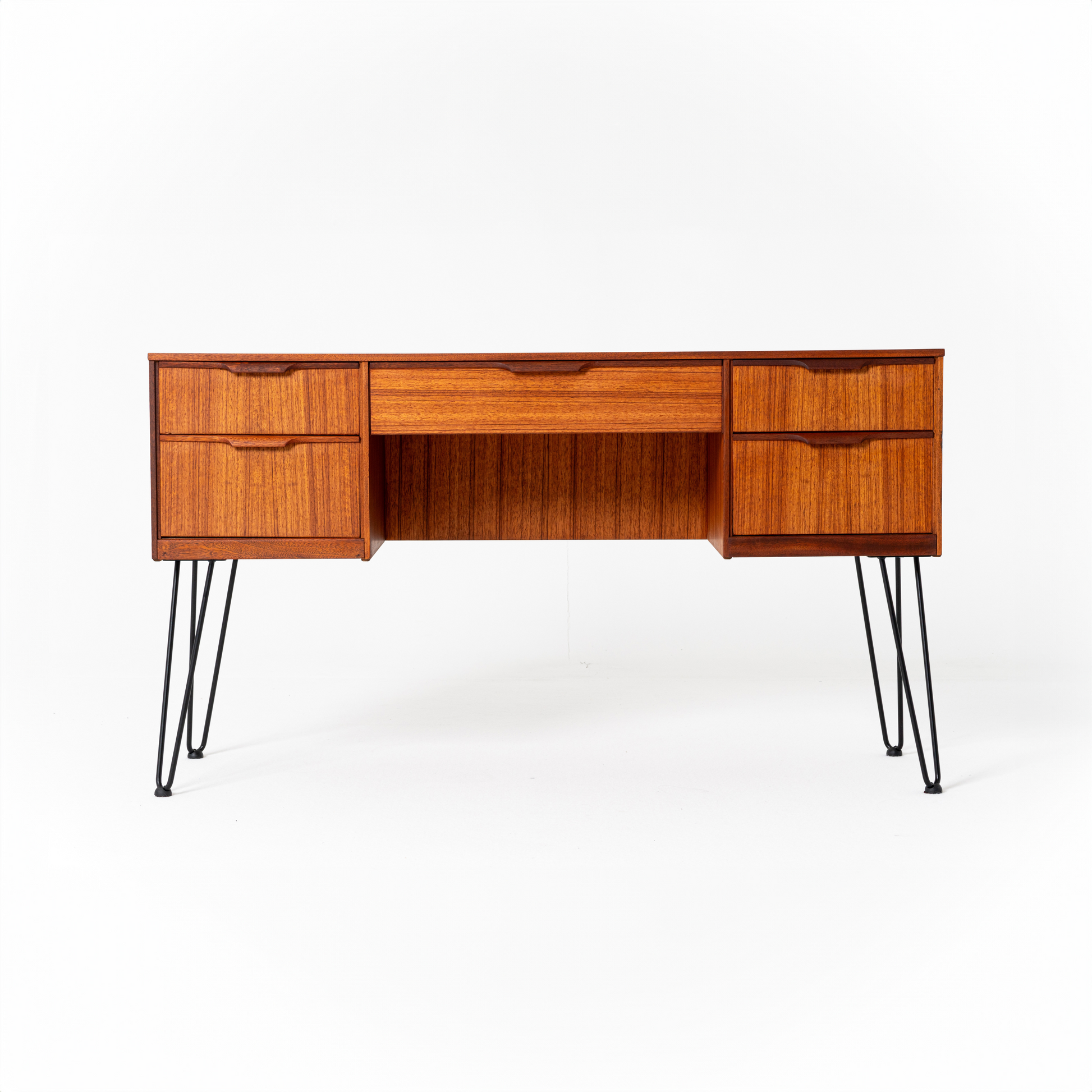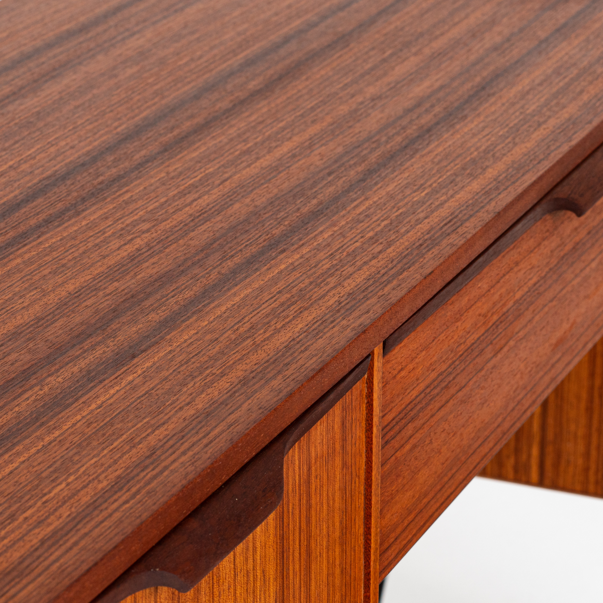 This is a fully refurbished British teak writing desk manufactured by GRANGE (UK). We gently sanded an treated with natural oil to reach this smooth surface.