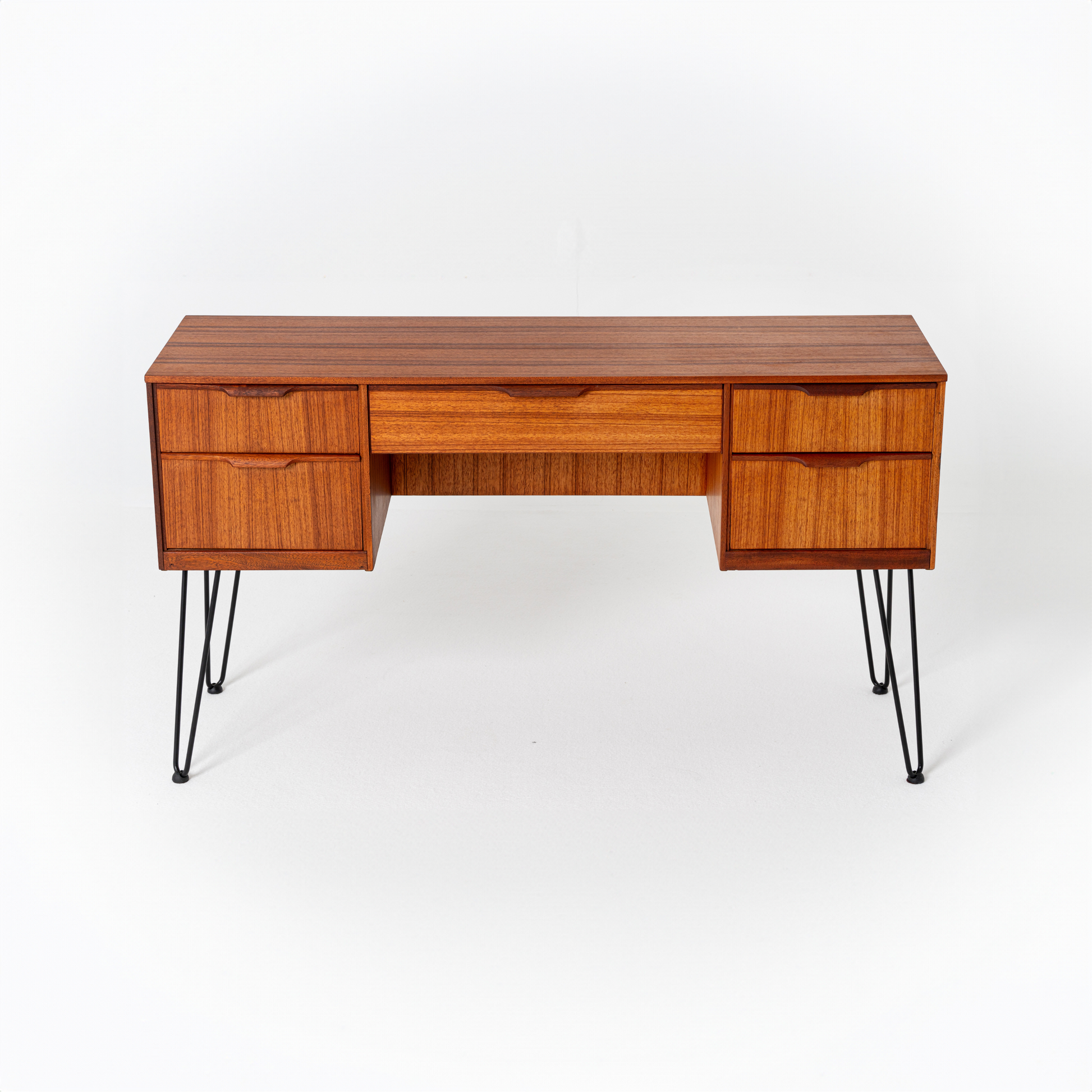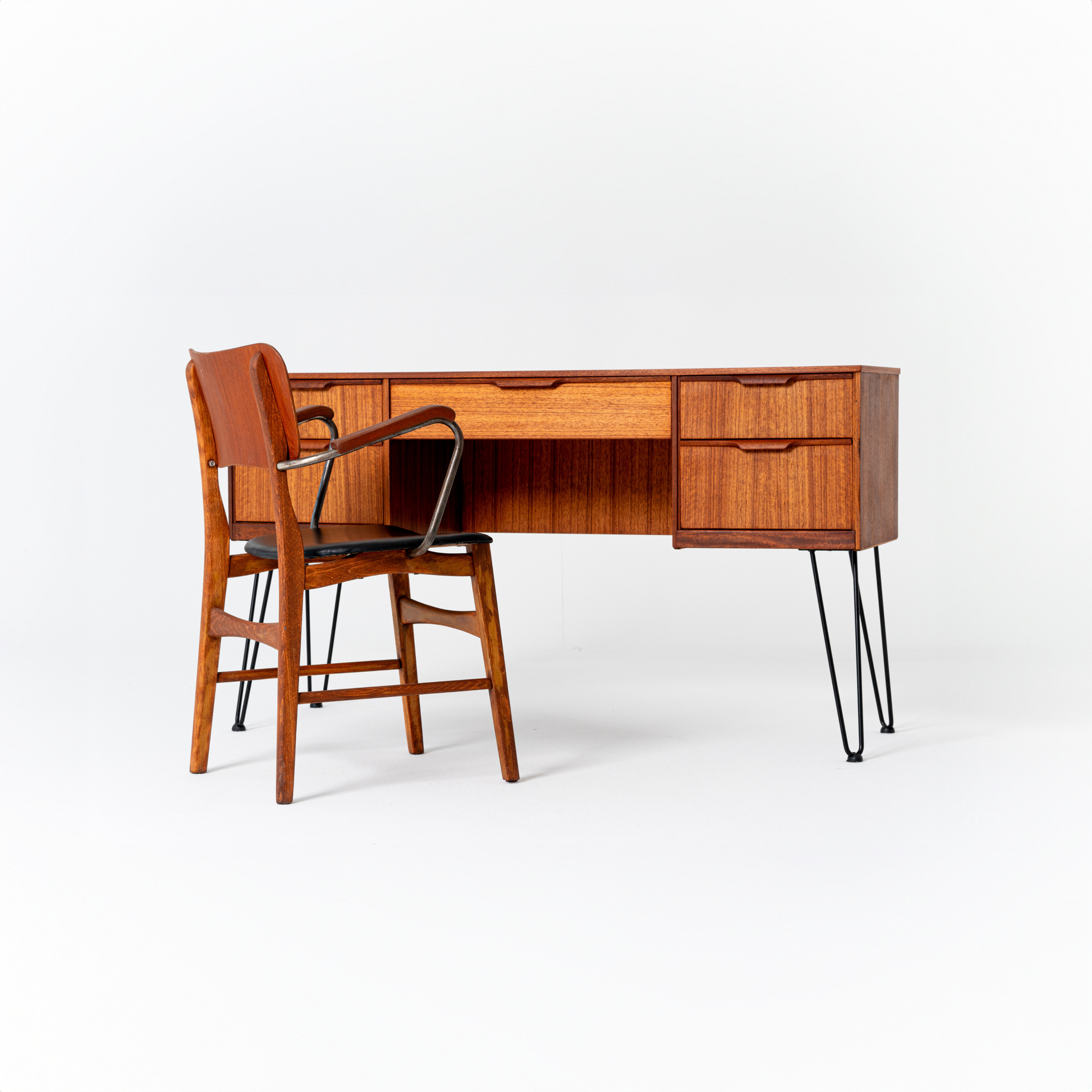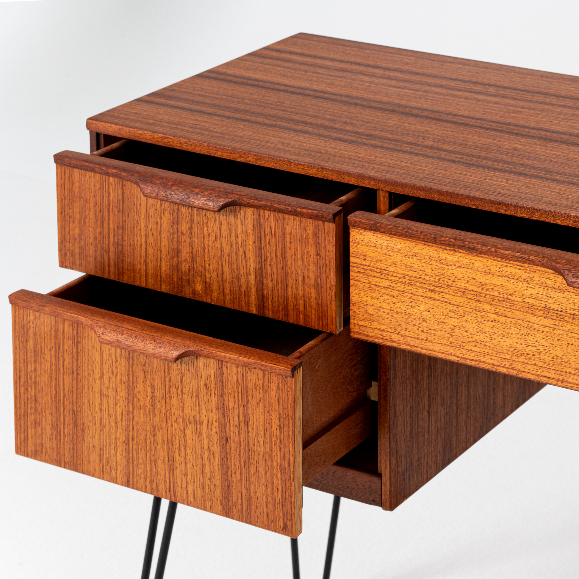 This is a fully refurbished British teak writing desk manufactured by GRANGE (UK). We gently sanded an treated with natural oil to reach this smooth surface.