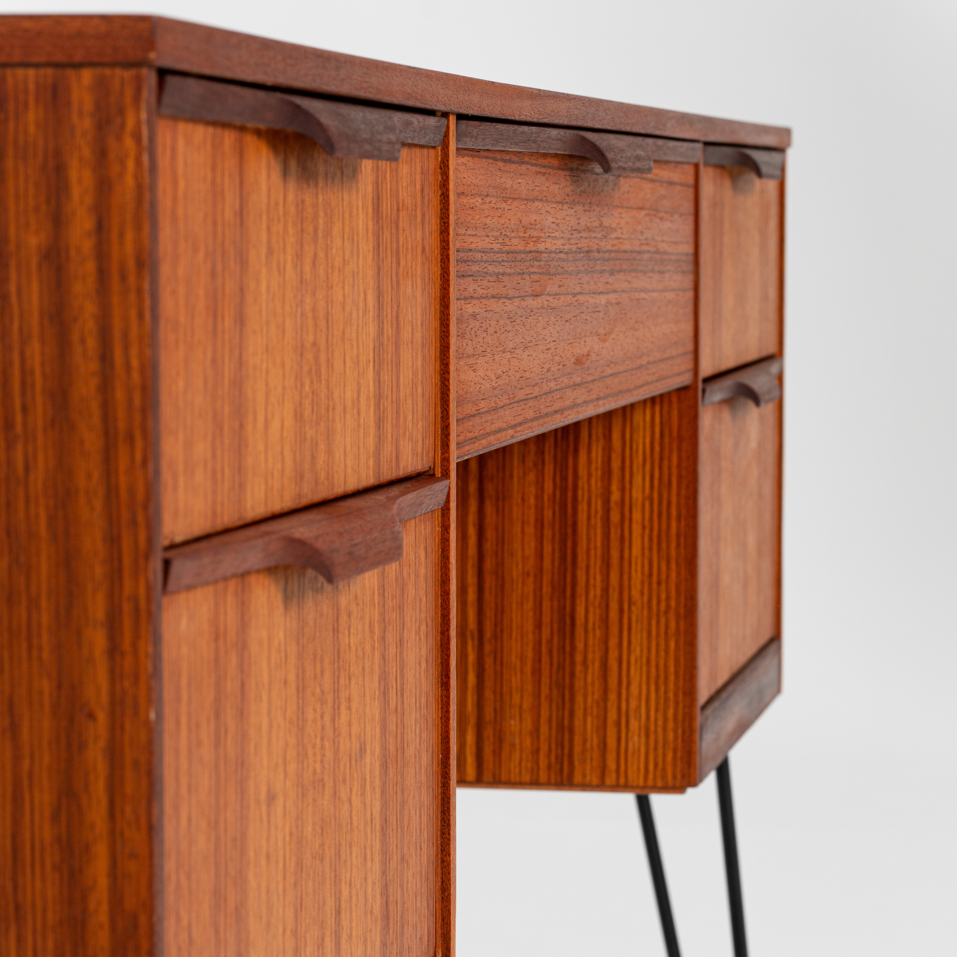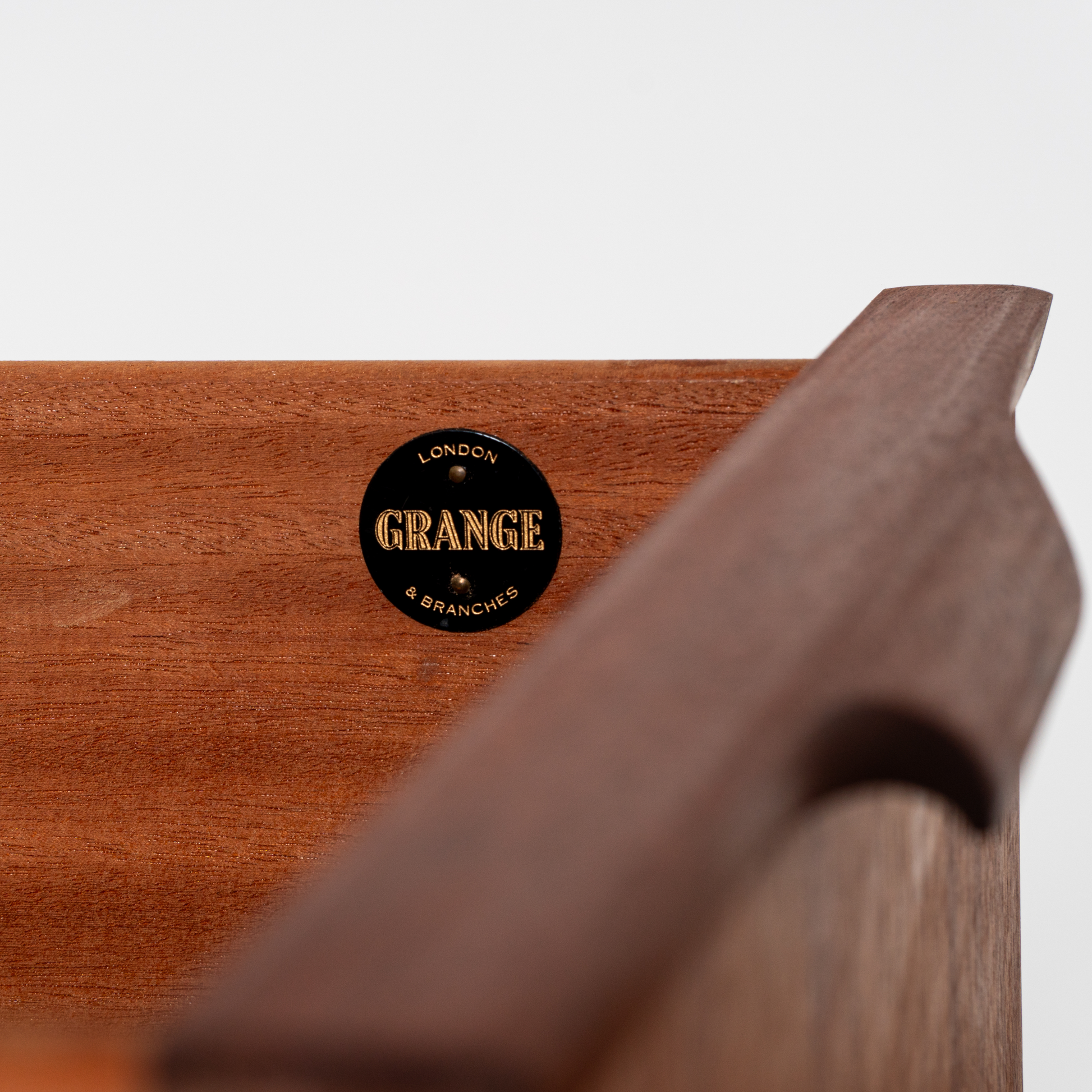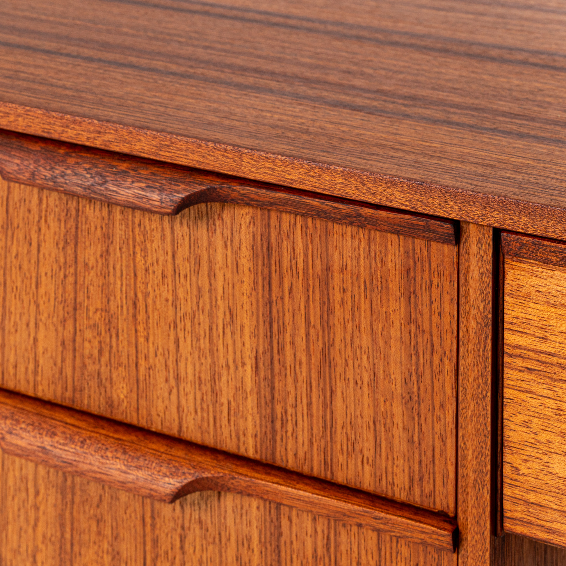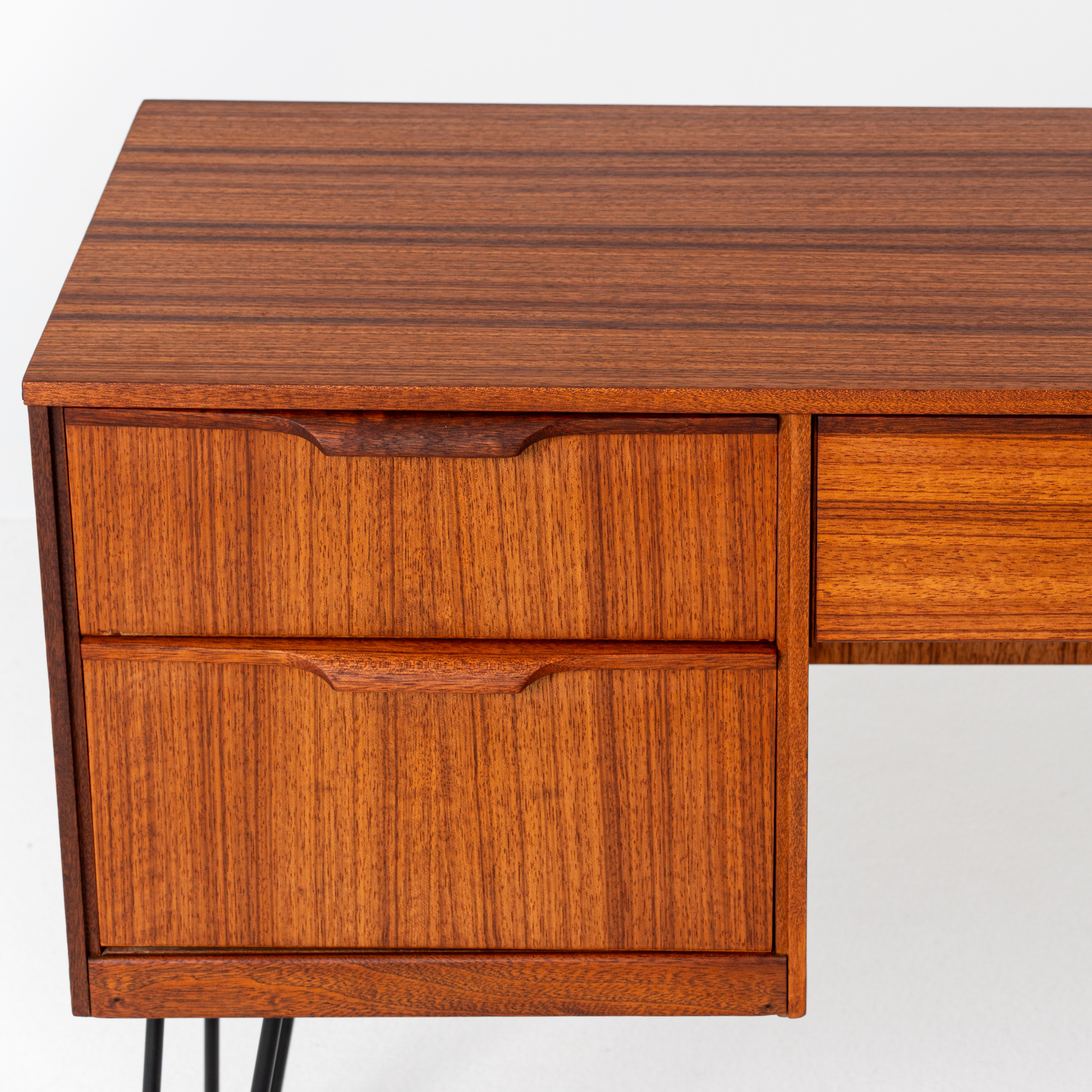 This is a fully refurbished British teak writing desk manufactured by GRANGE (UK). We gently sanded an treated with natural oil to reach this smooth surface.