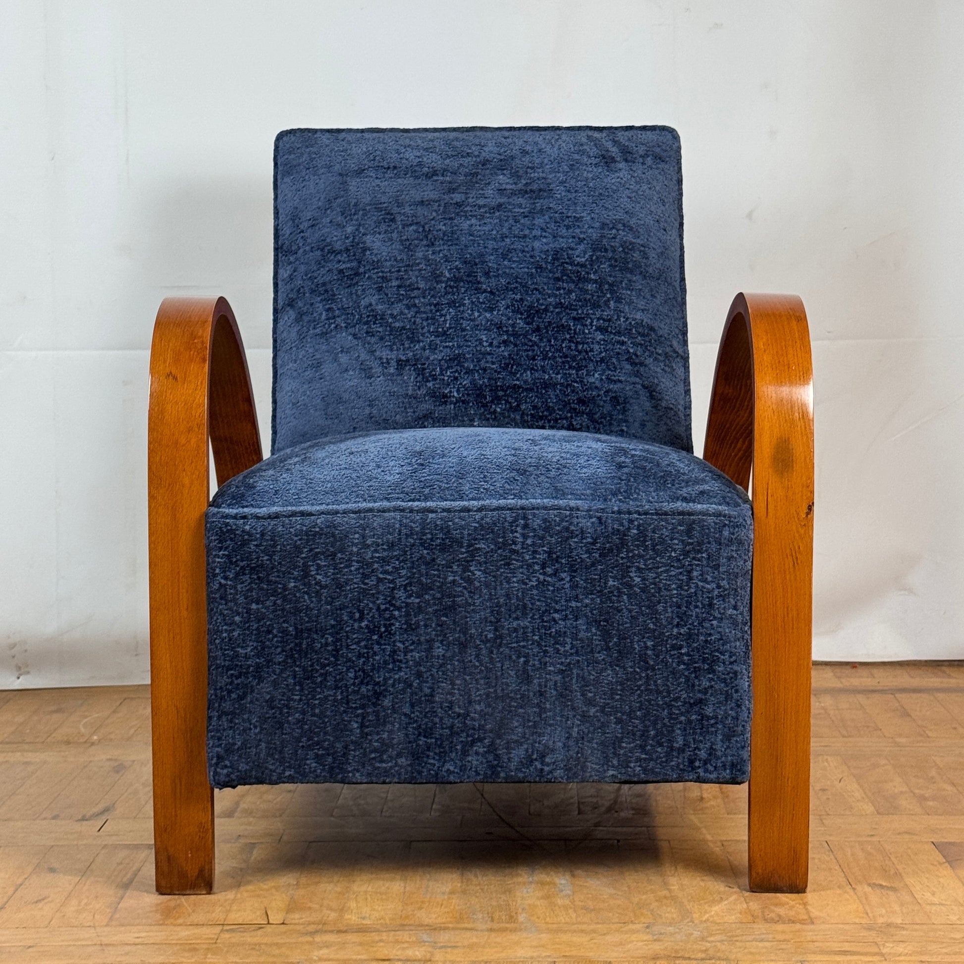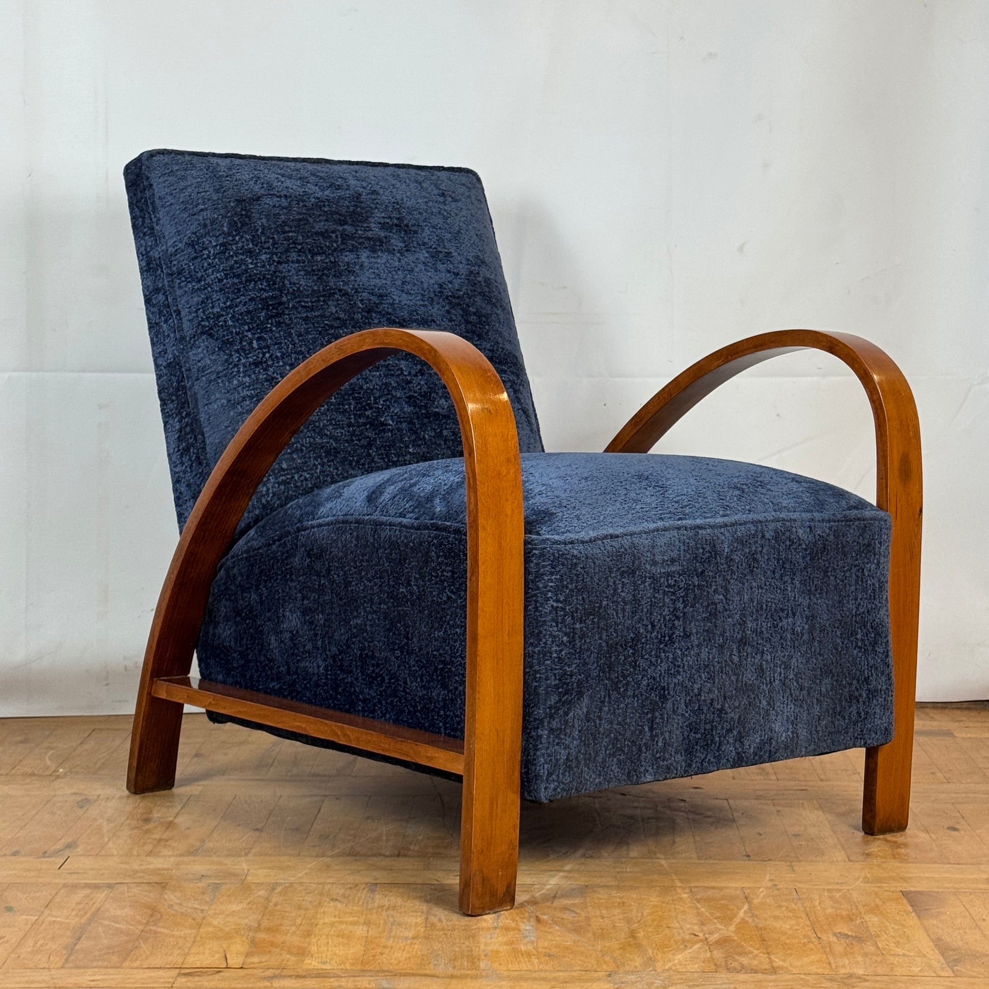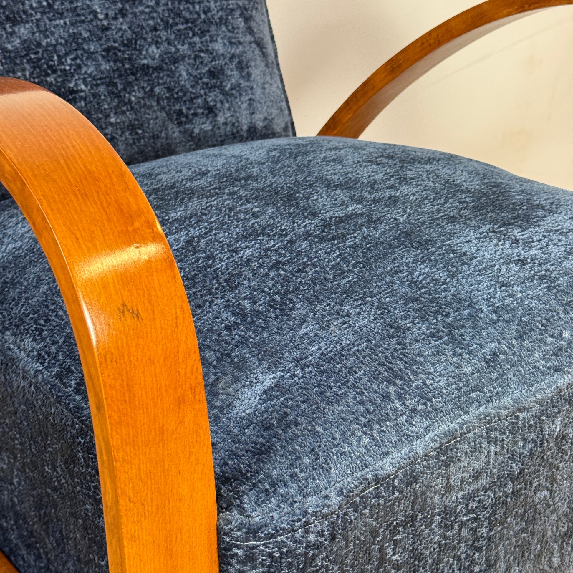 French Art Deco–style armchair from the 1960s, featuring a beautifully bent beechwood arm that supports its sculptural frame. Fully restored to bring out its original charm.