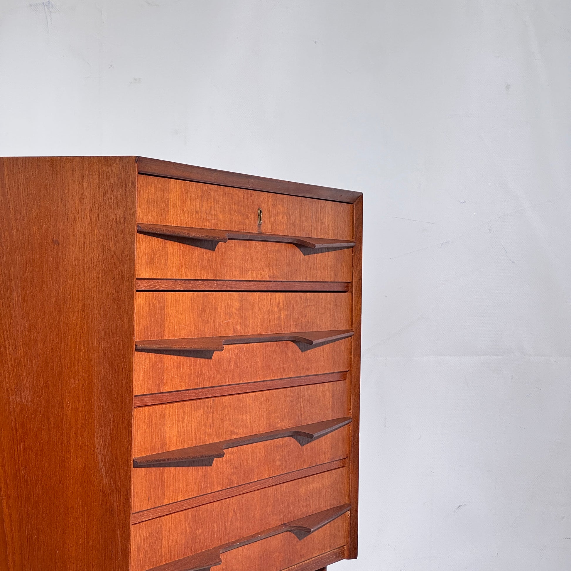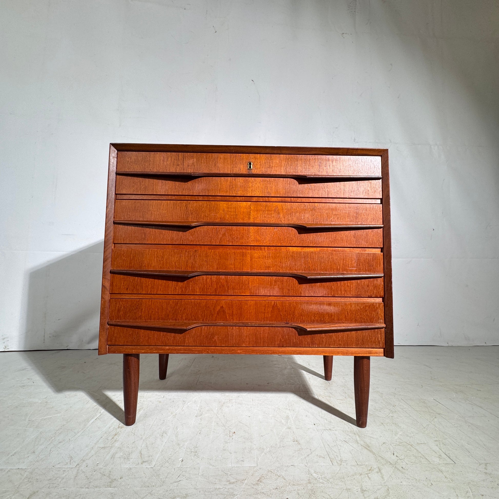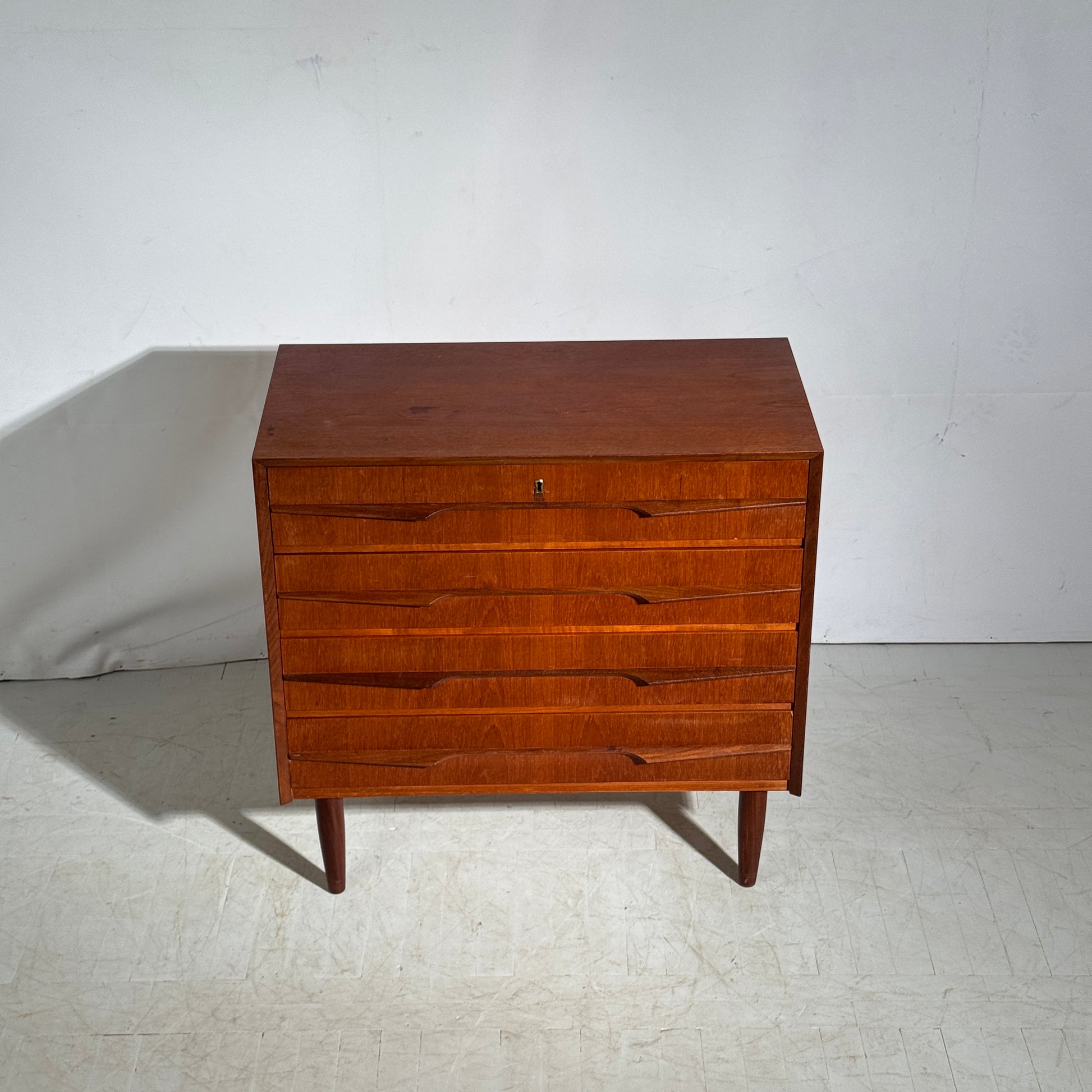 Vintage teak sideboard by G.J. Möbler, featuring four spacious drawers and a clean mid-century design. The piece is in vintage condition, showing signs of age and use as seen in the photos. A compact and functional storage solution with timeless Scandinavian style.