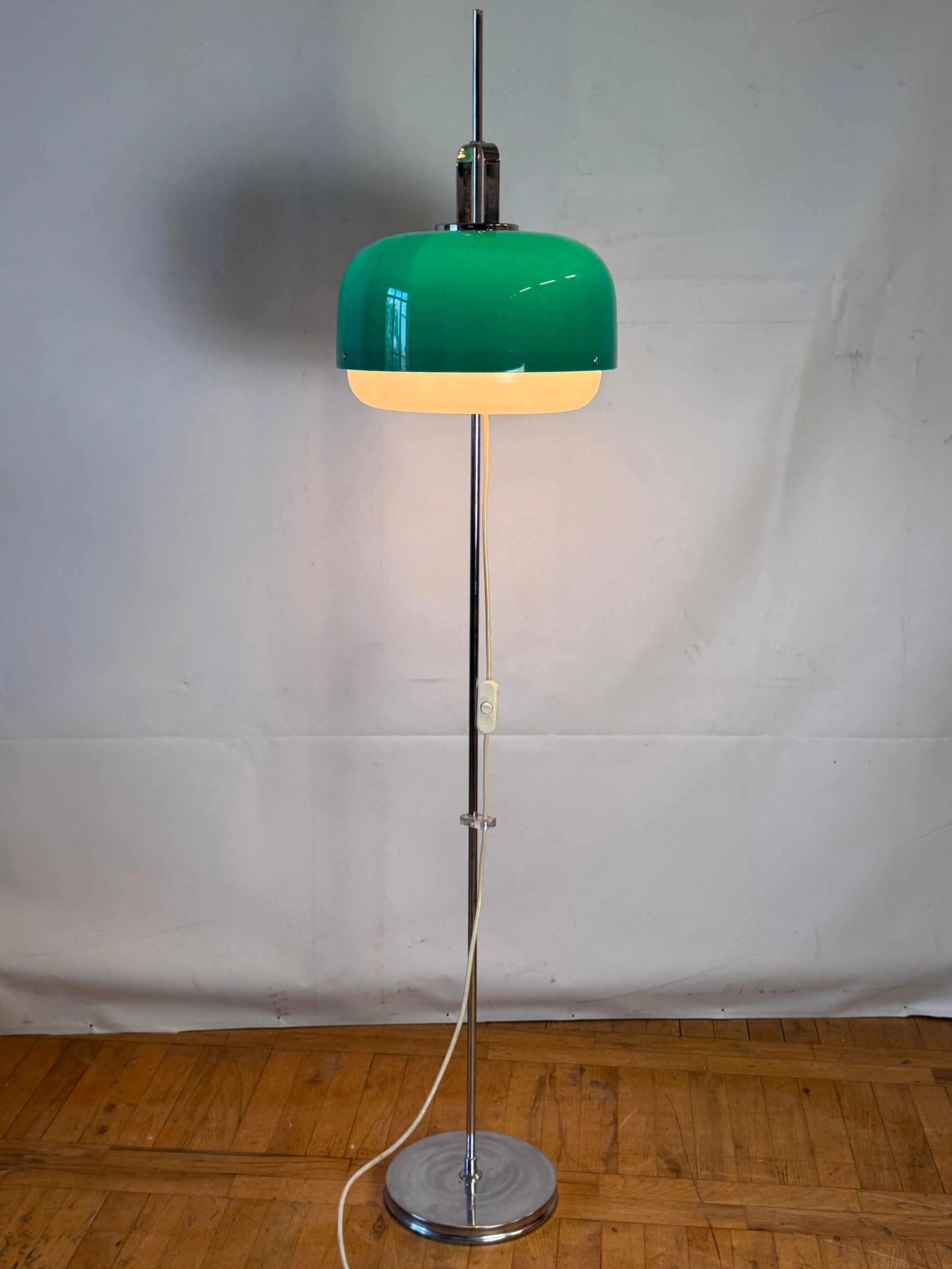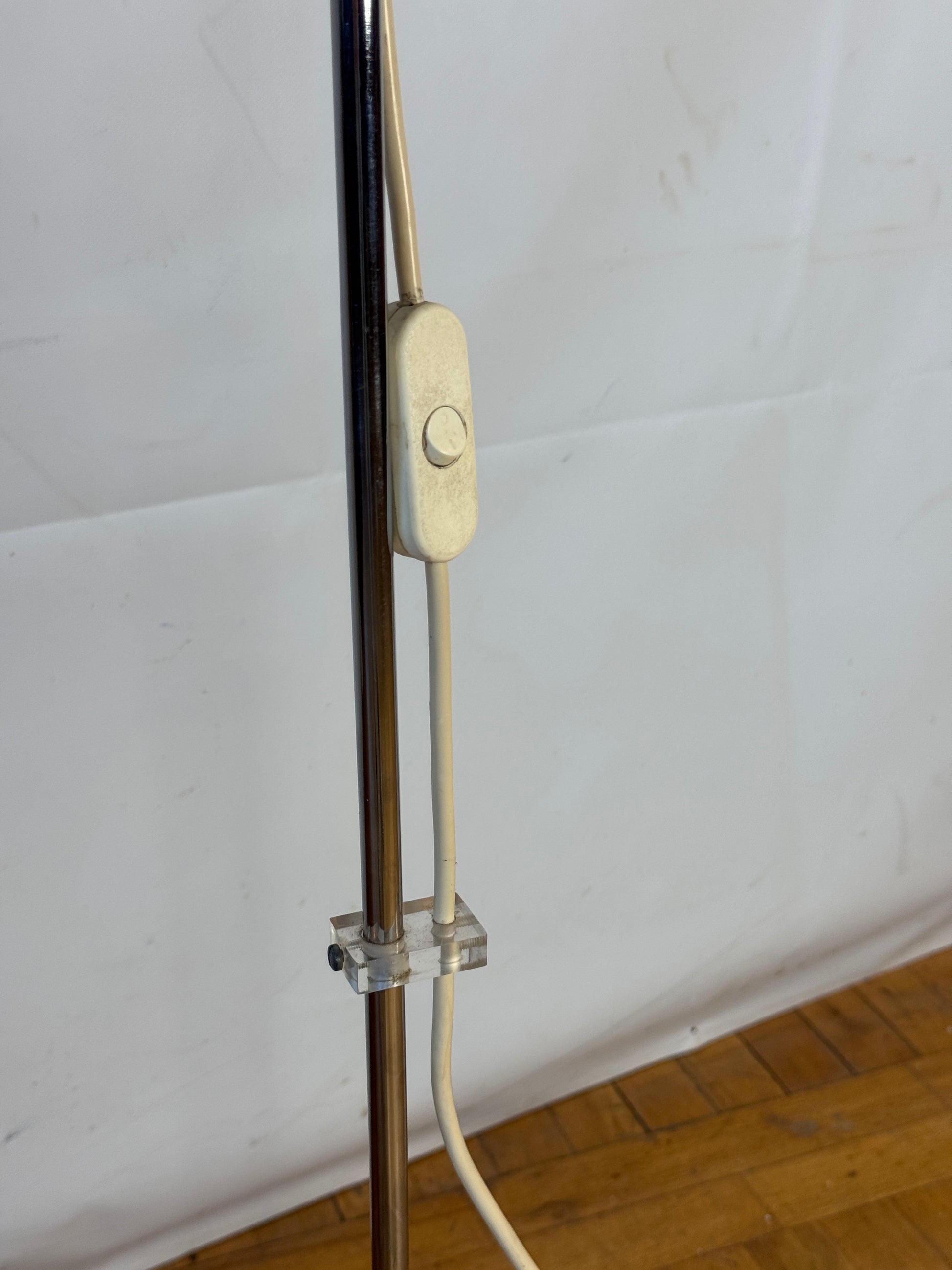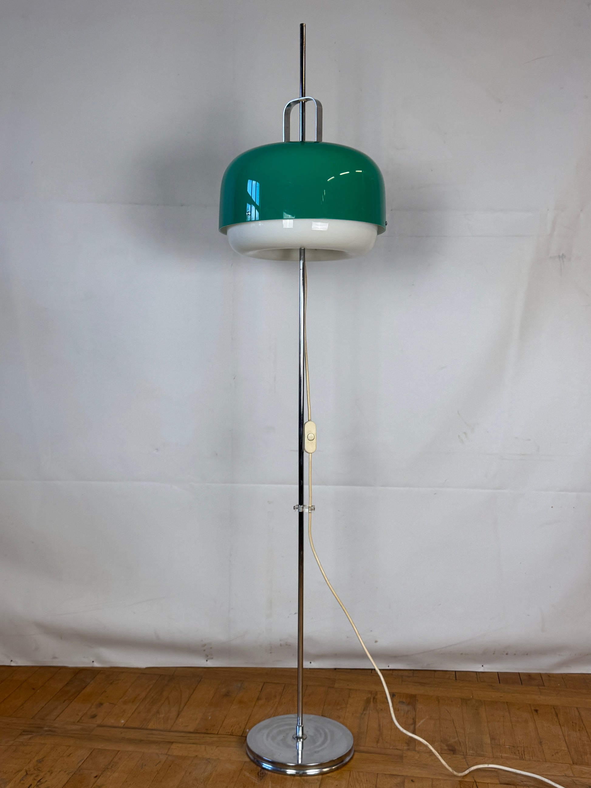 Very nice standing lamp designed by Harvey Guzzini for Meblo Italy. This lamp is in its original condition. The white part of the plastic shade has a crack, which is not visible from outdide. The chrome stand has few small signs of use (scratches, wear). It works with two E14 bulb. It is 150cm in hight and 35cm diameter.