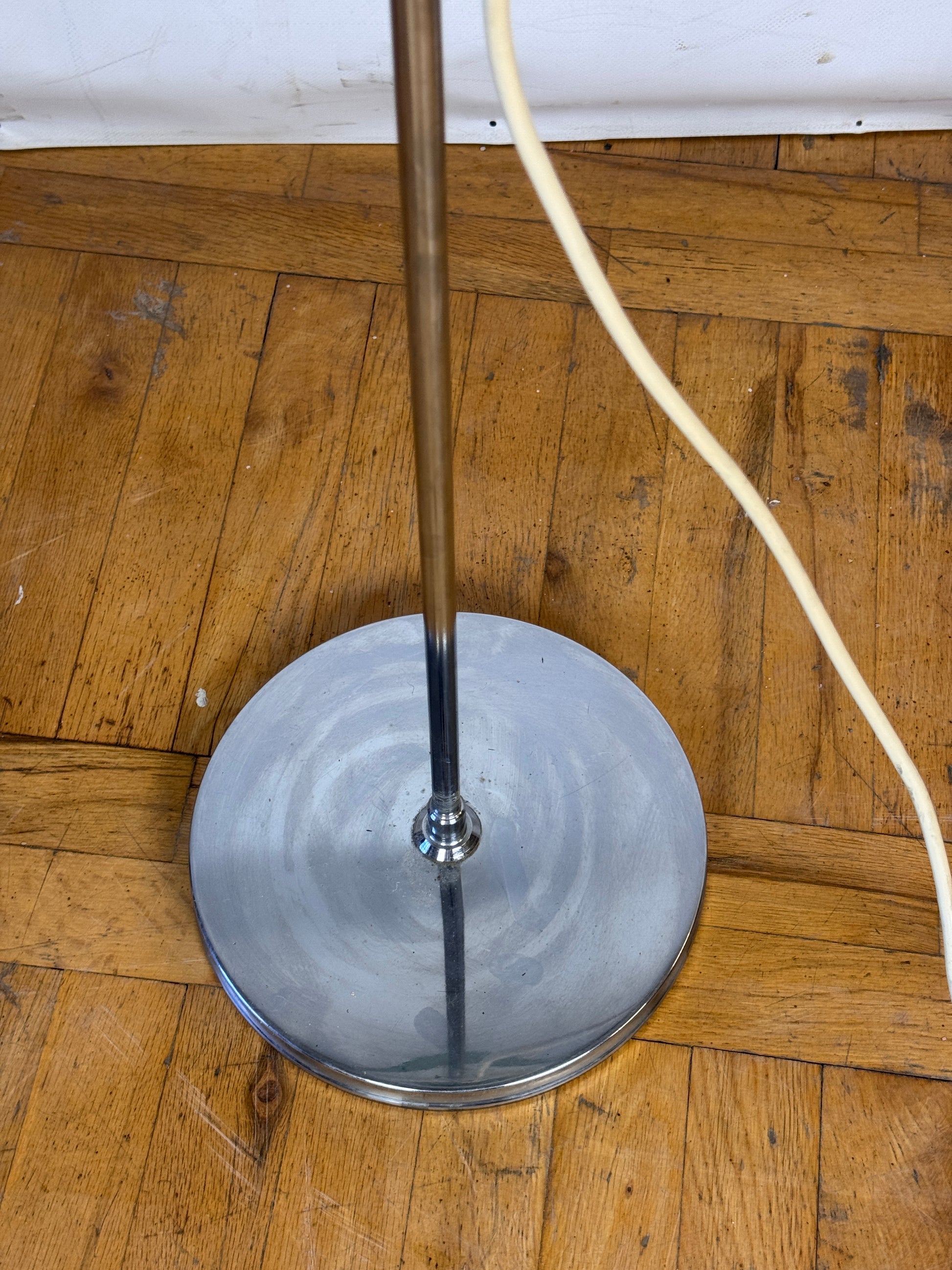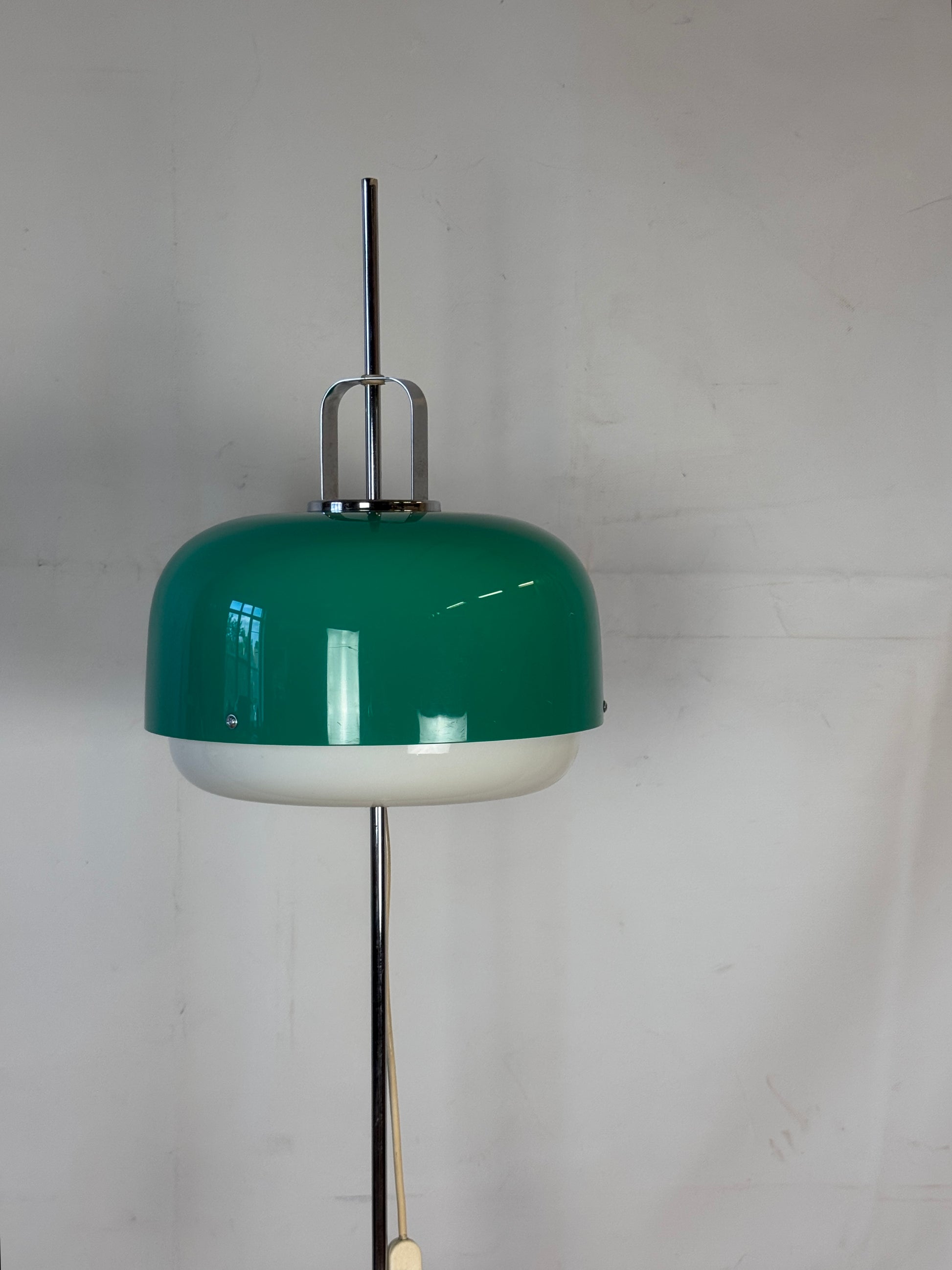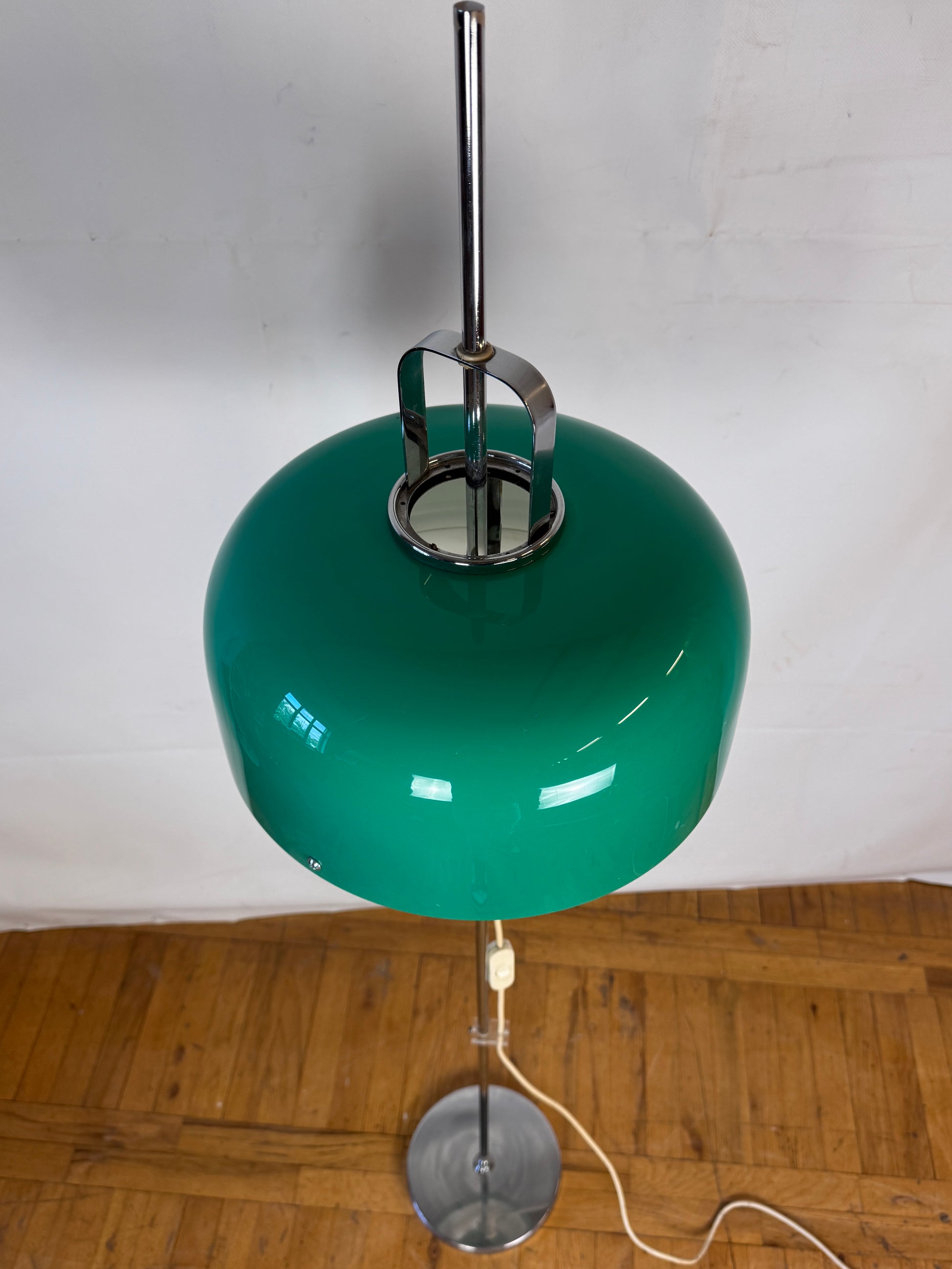 Very nice standing lamp designed by Harvey Guzzini for Meblo Italy. This lamp is in its original condition. The white part of the plastic shade has a crack, which is not visible from outdide. The chrome stand has few small signs of use (scratches, wear). It works with two E14 bulb. It is 150cm in hight and 35cm diameter.
