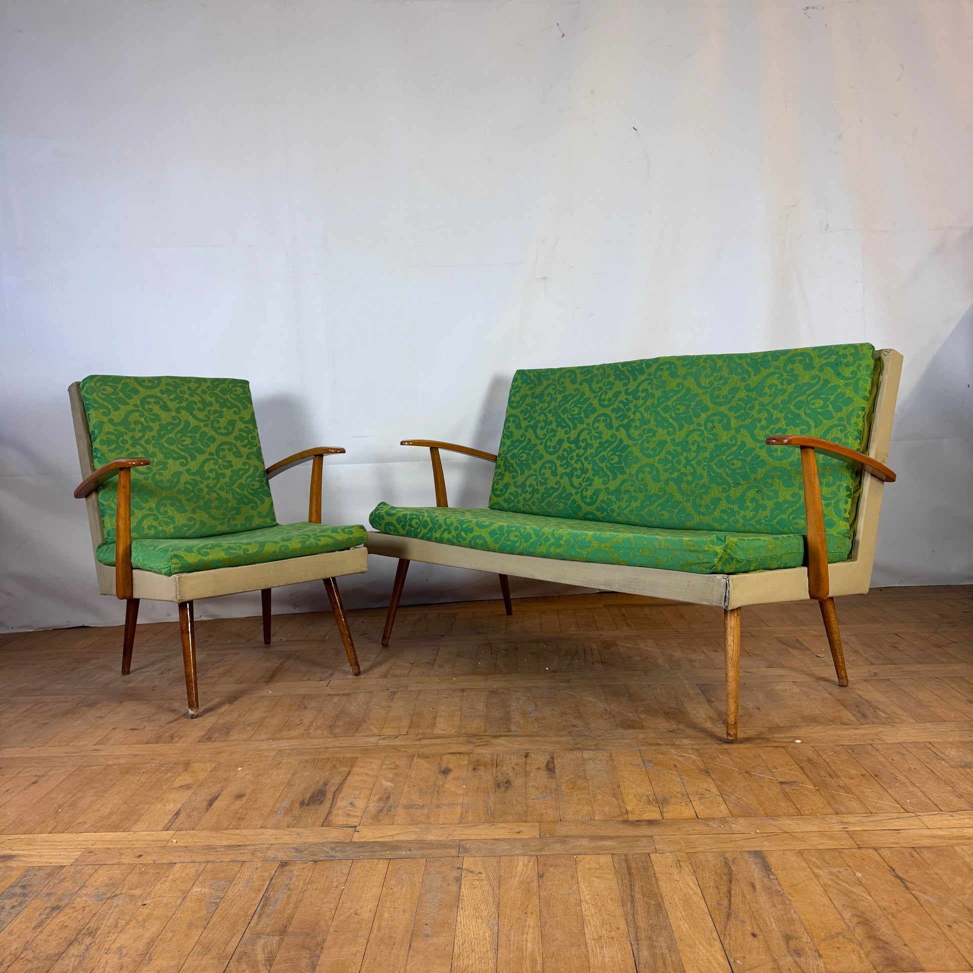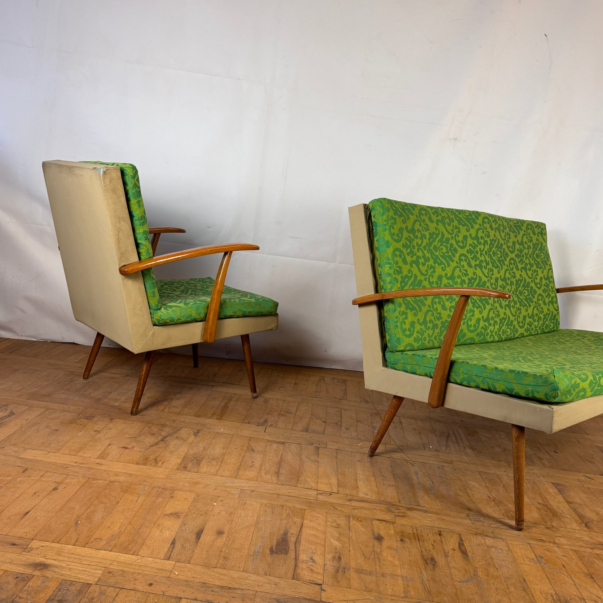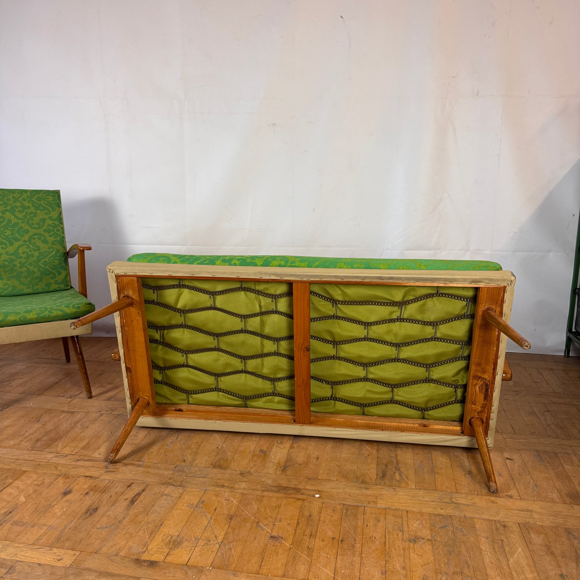 This living room set consist of one sofa and 1 armchair designed and manufactured in Hungary in 1960s. The cushions are with strong springs. The sponge and fabric needs a change. The beech wood structure is solid, but need some sanding and treatment.