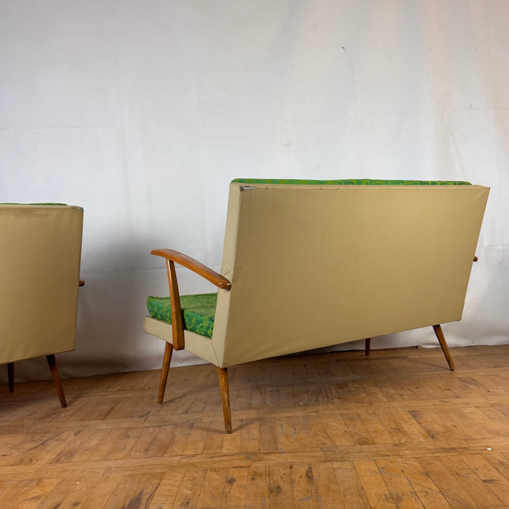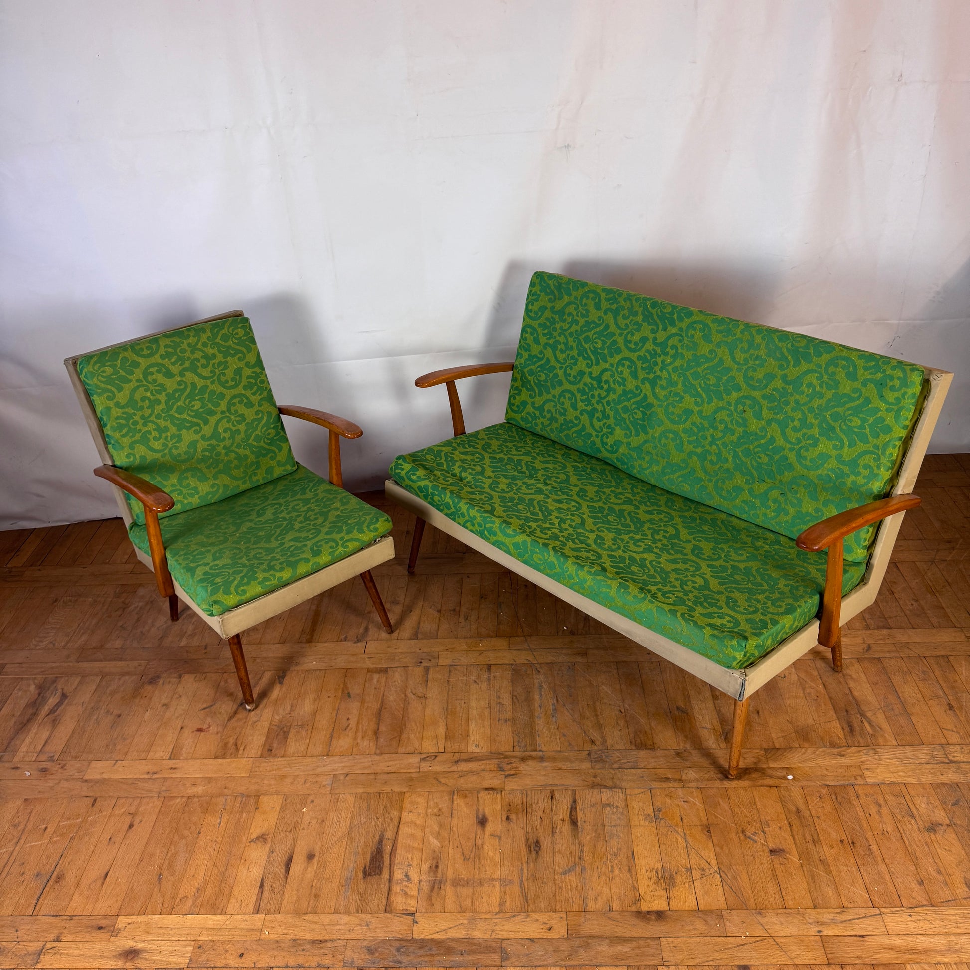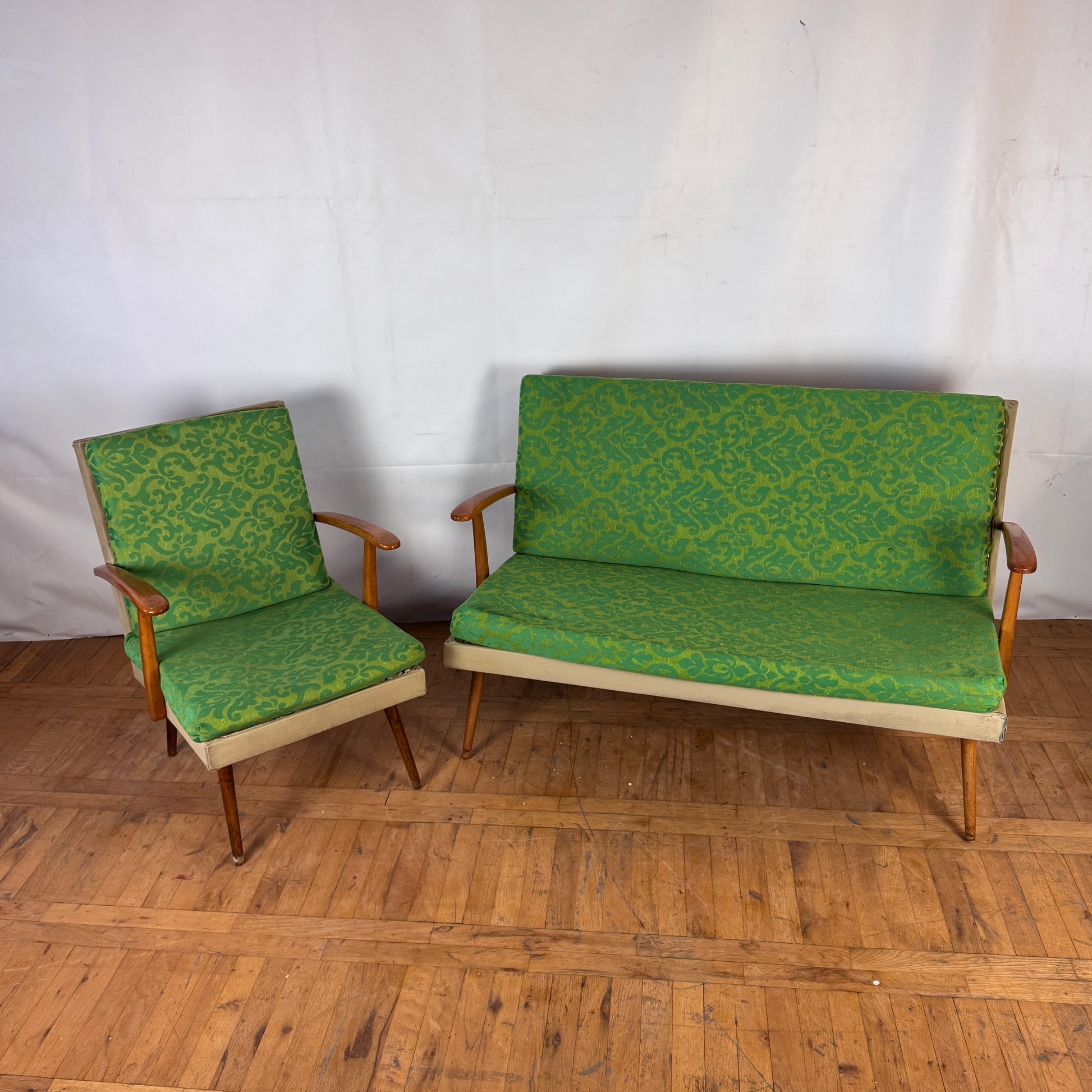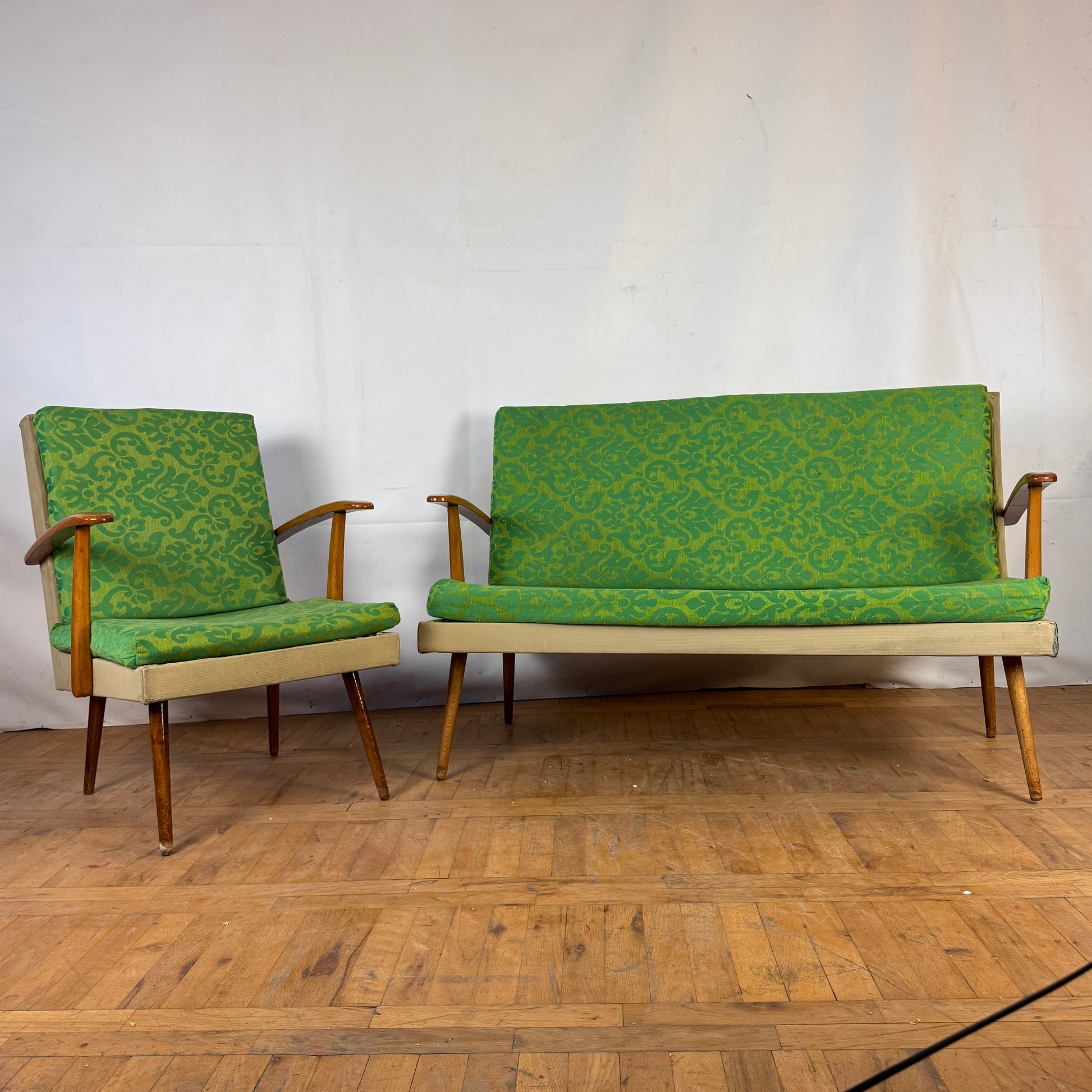 This living room set consist of one sofa and 1 armchair designed and manufactured in Hungary in 1960s. The cushions are with strong springs. The sponge and fabric needs a change. The beech wood structure is solid, but need some sanding and treatment.