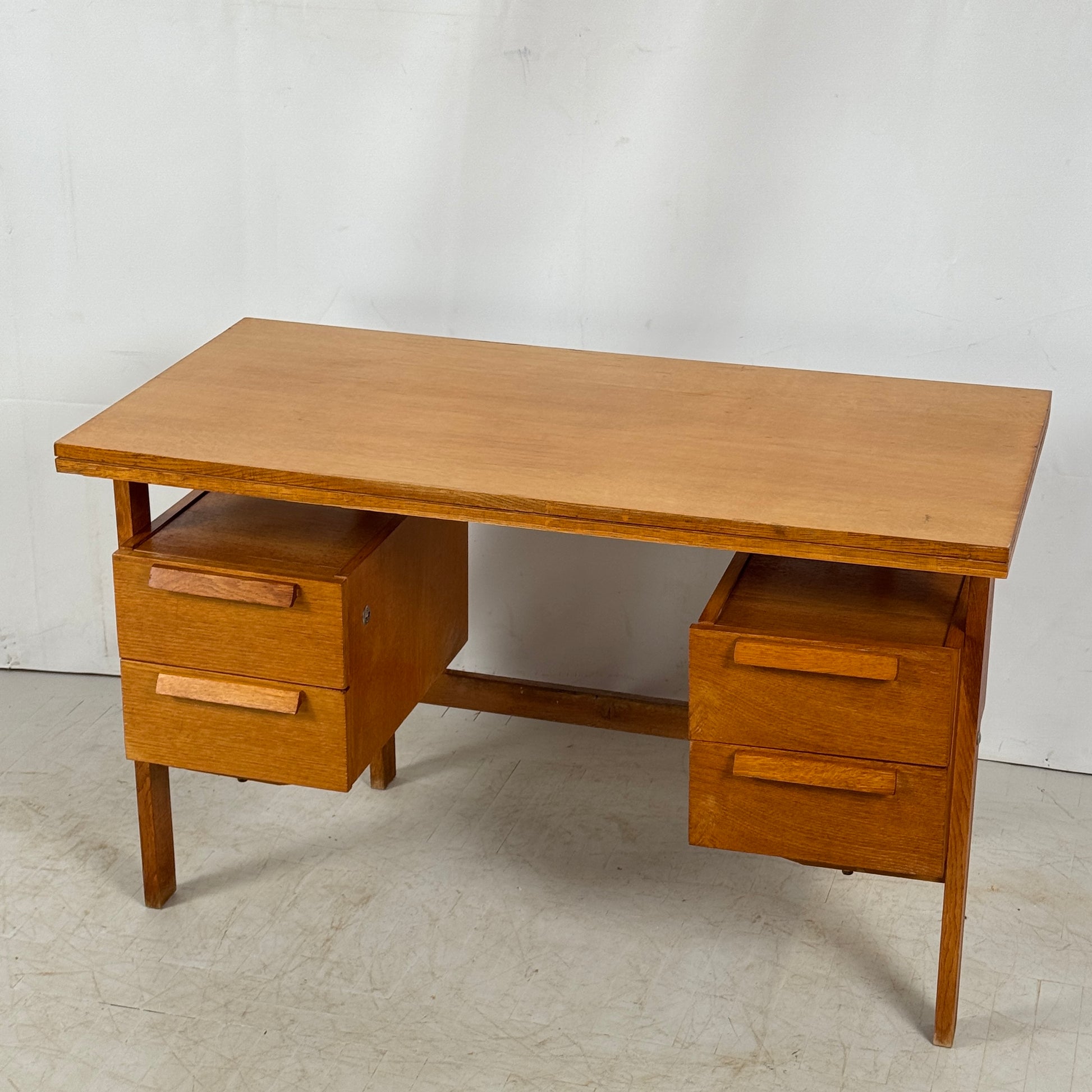 Solid oak desk from the 1960s with a clean, functional silhouette and four practical drawers. The piece shows wear and tear consistent with age, adding to its authentic mid-century character.