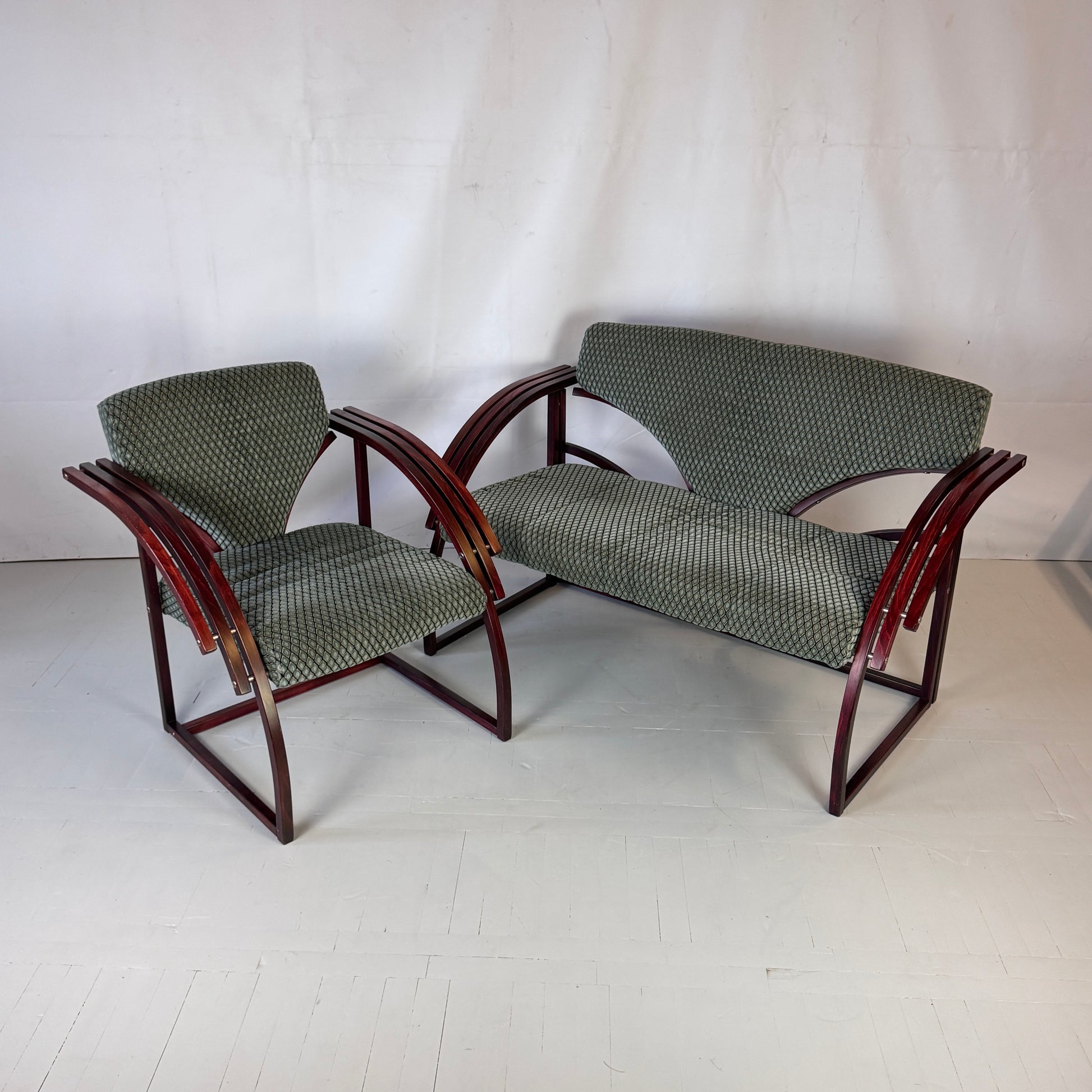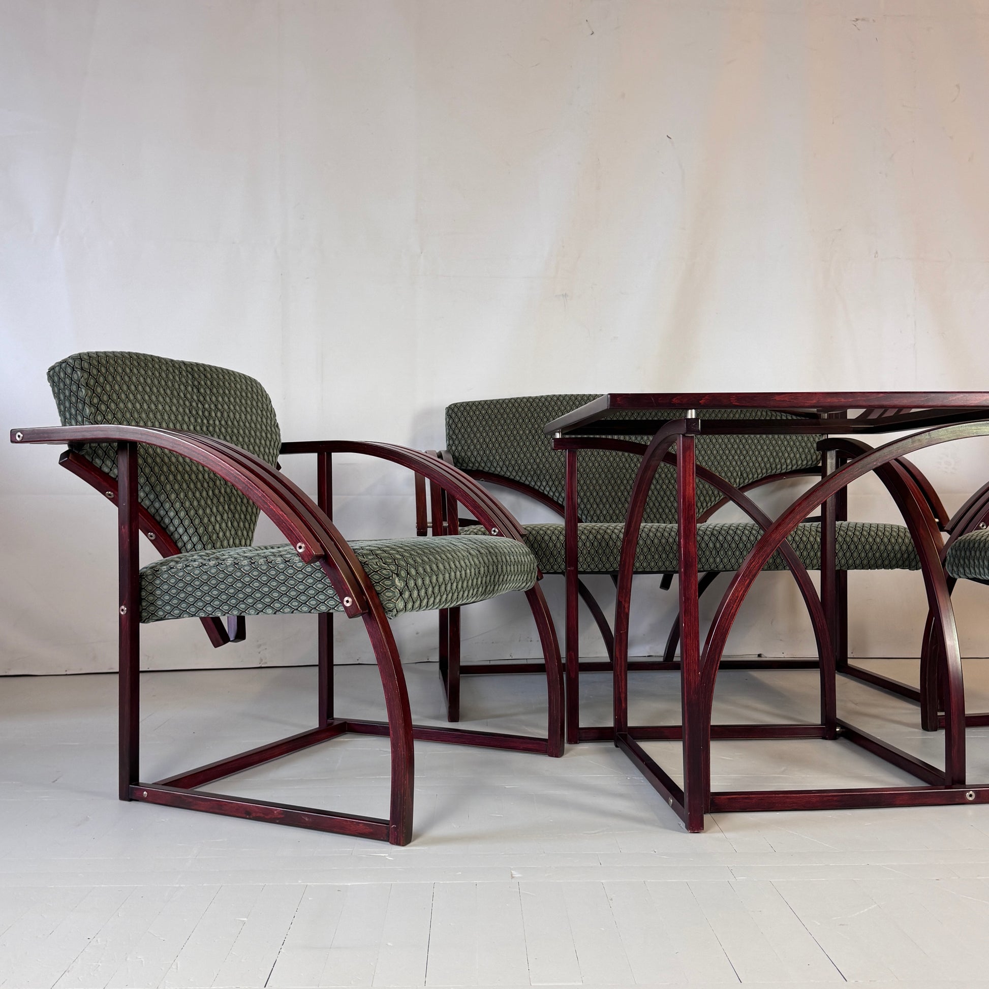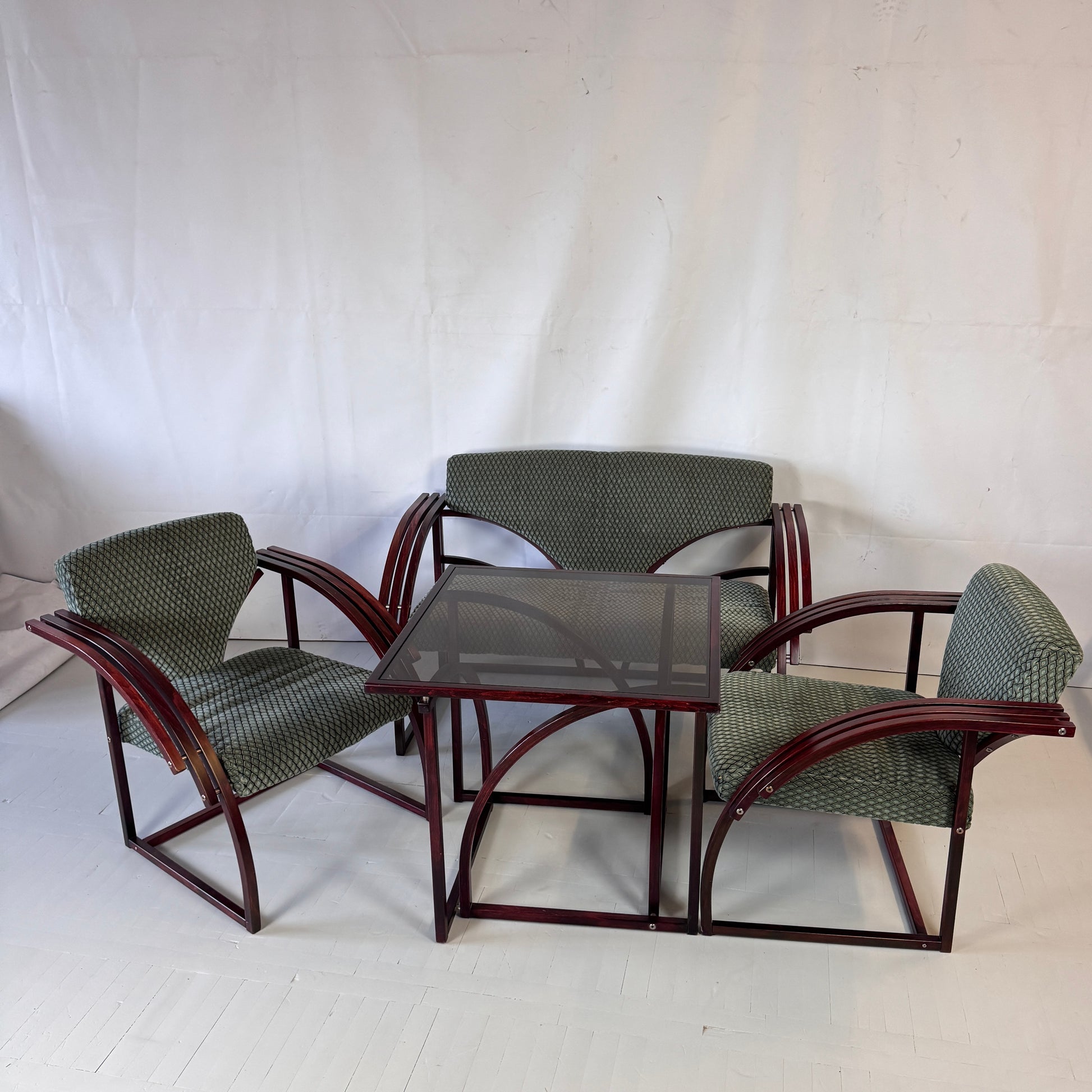 A striking postmodern set from Hungary, featuring a sofa, two matching armchairs, and a coffee table. Designed with bold forms and comfortable proportions, this set embodies the playful and functional aesthetic of Hungarian 1970s design.