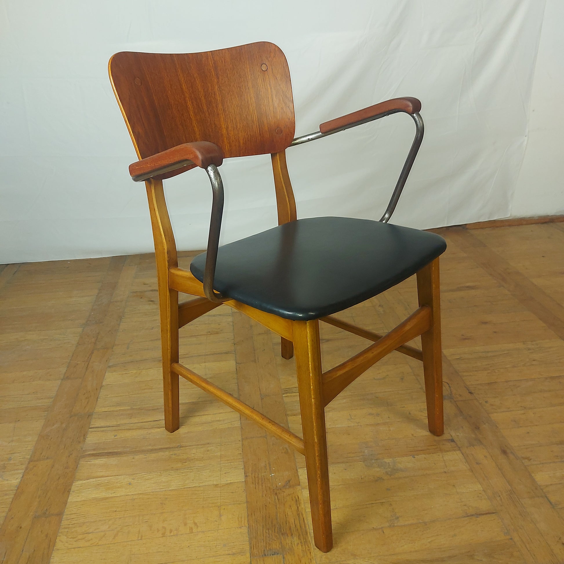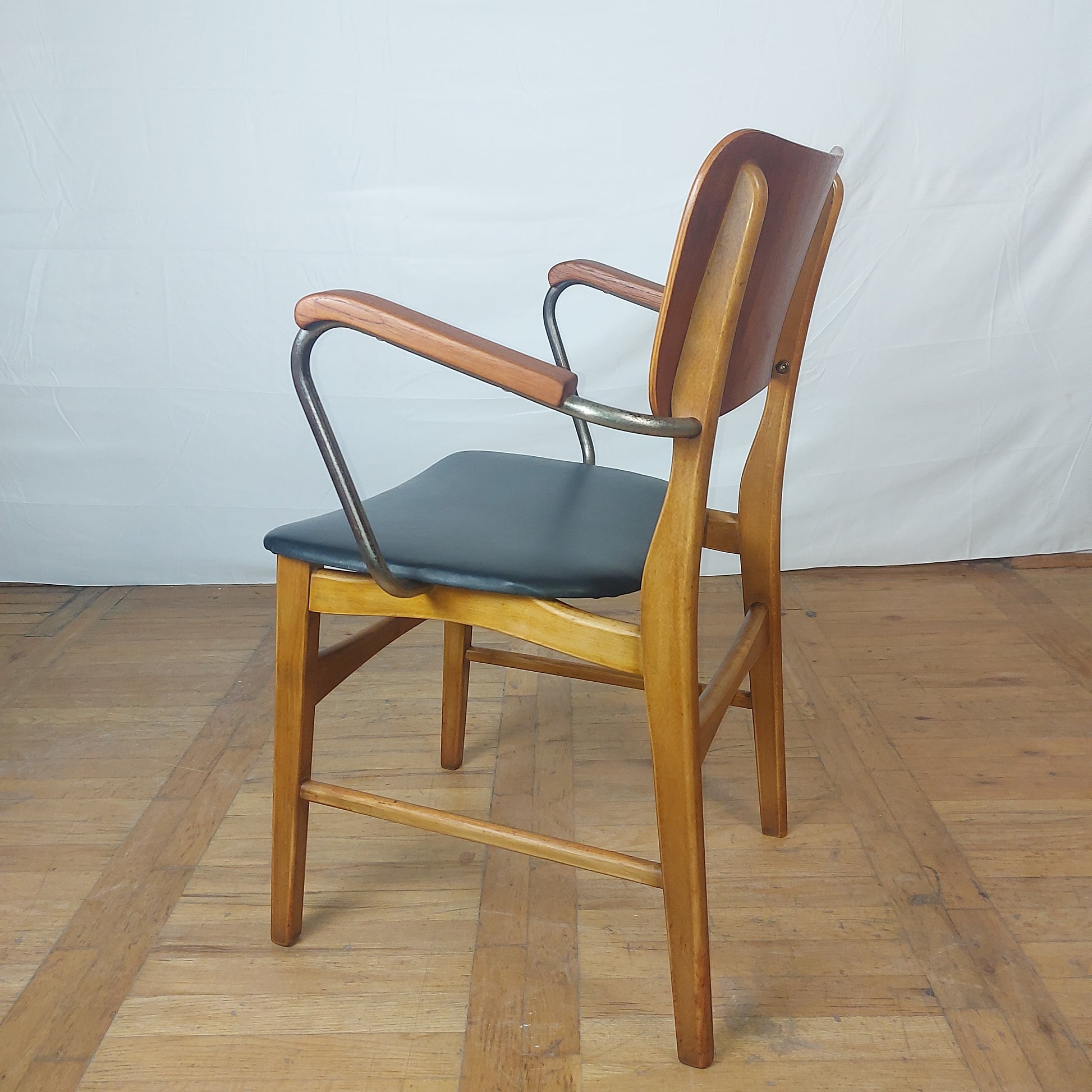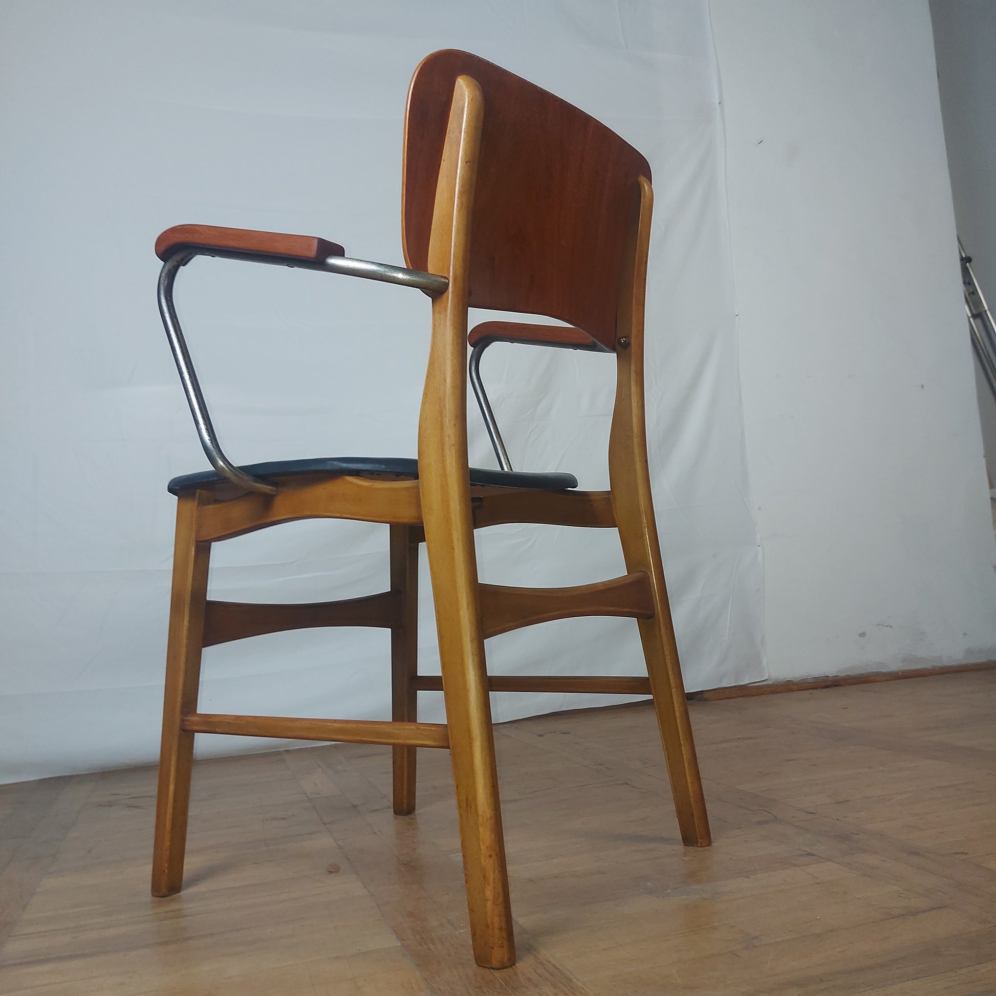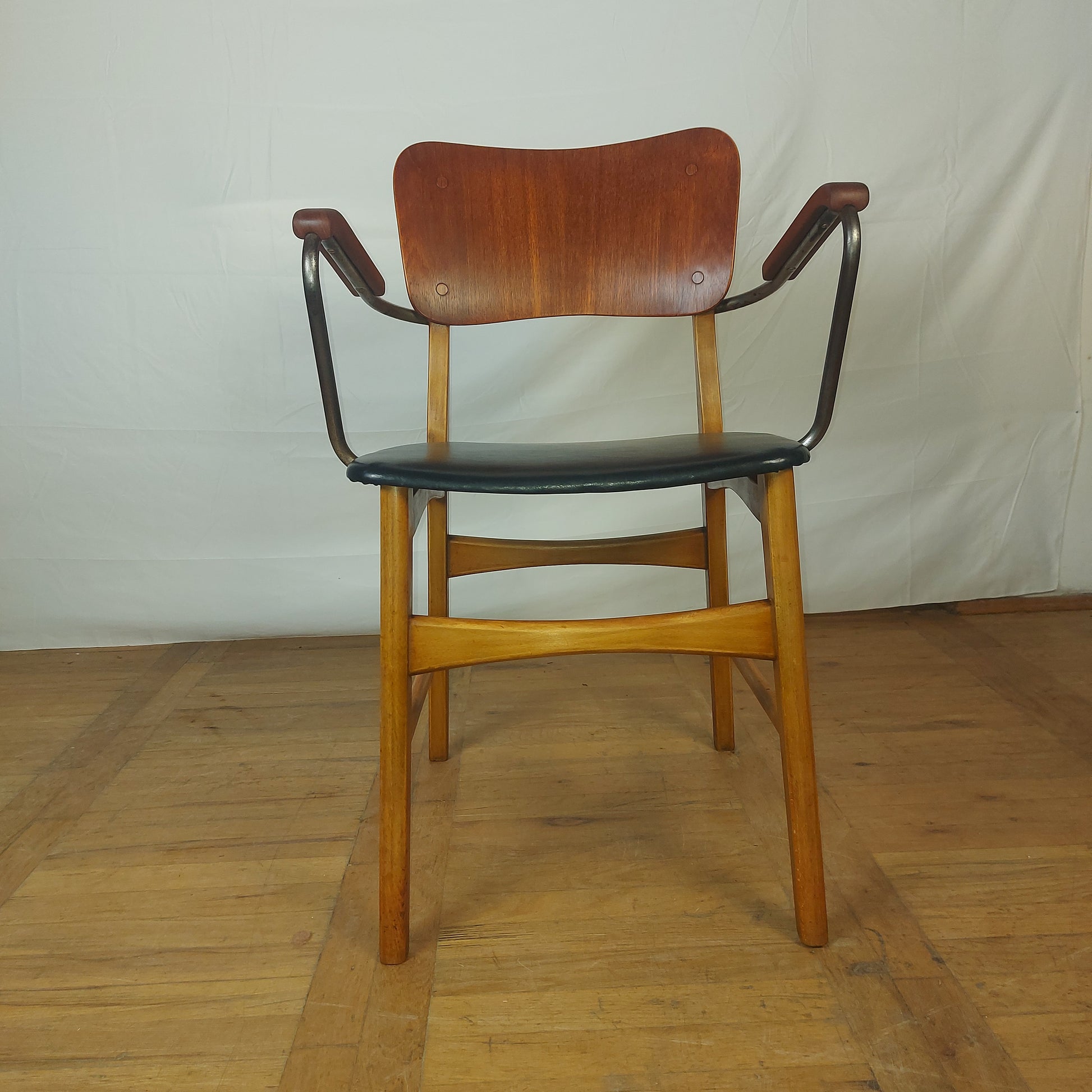 Designed by renowned Danish designer Ib Kofod-Larsen, this set of four chairs showcases his signature blend of elegance and functionality. The backrests and armrests are crafted from teak, while the frames are made of solid beech wood. These chairs remain in original vintage condition, with visible signs of use and surface scratches consistent with age.