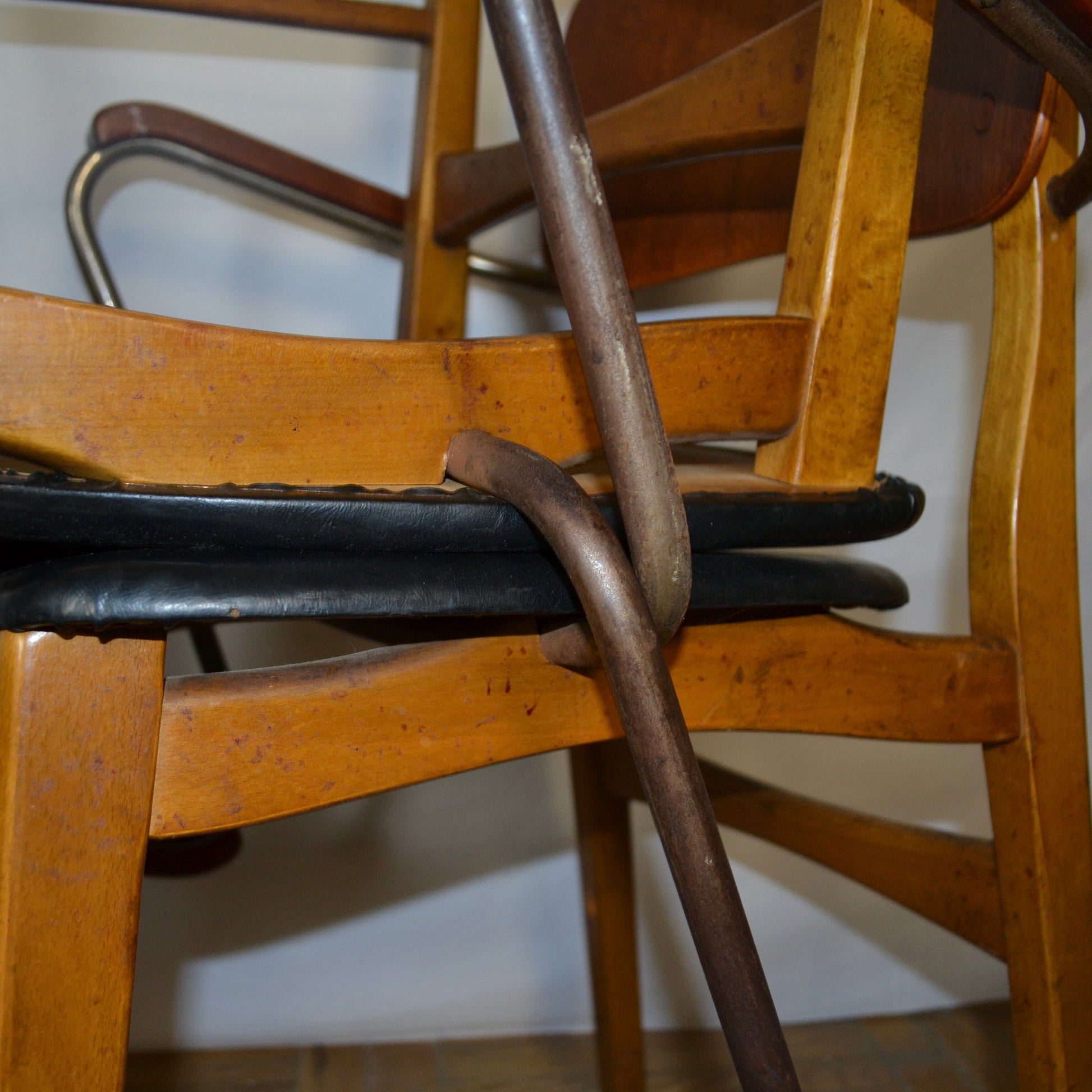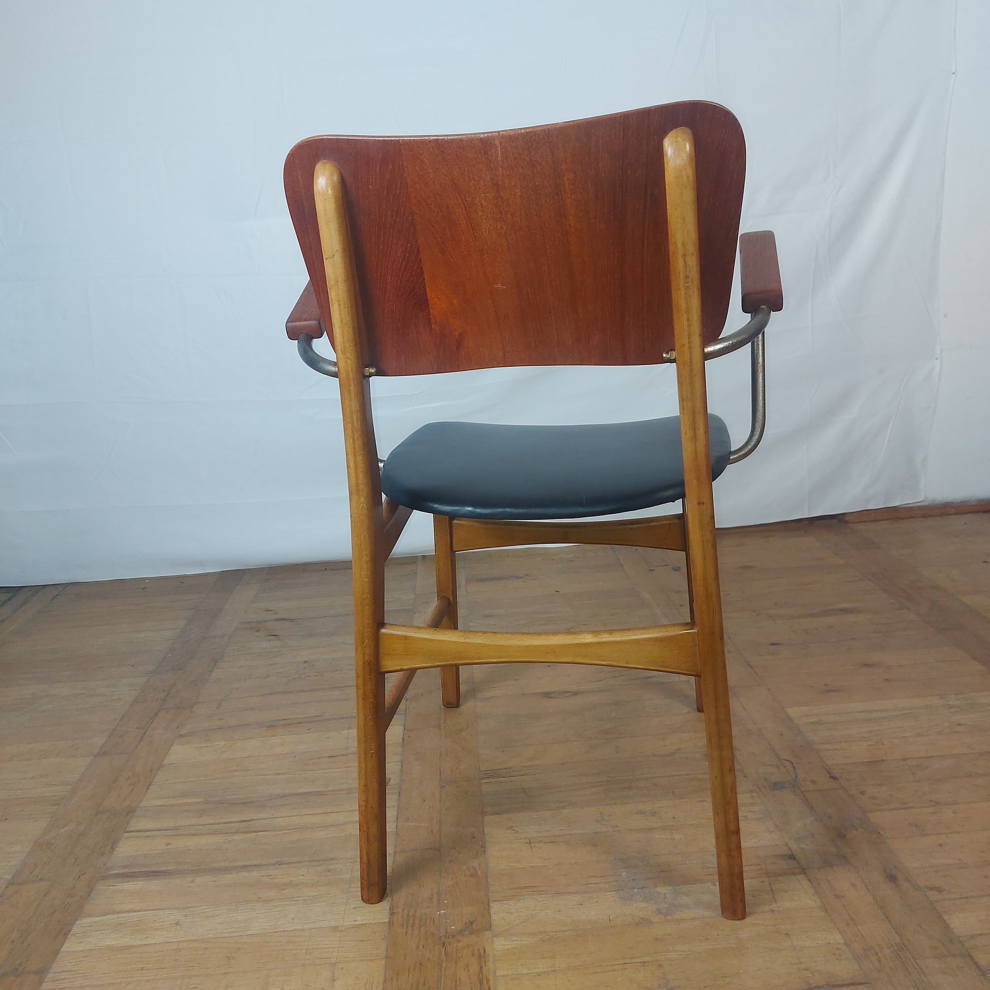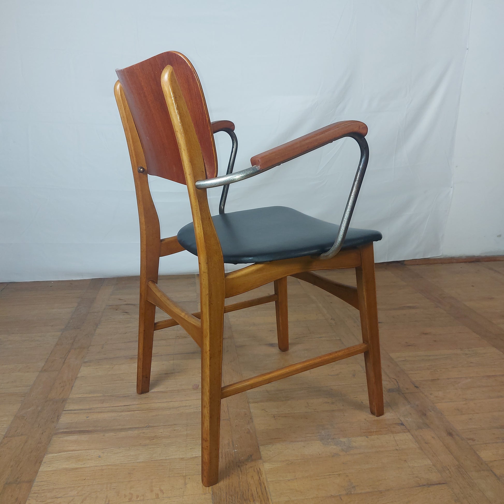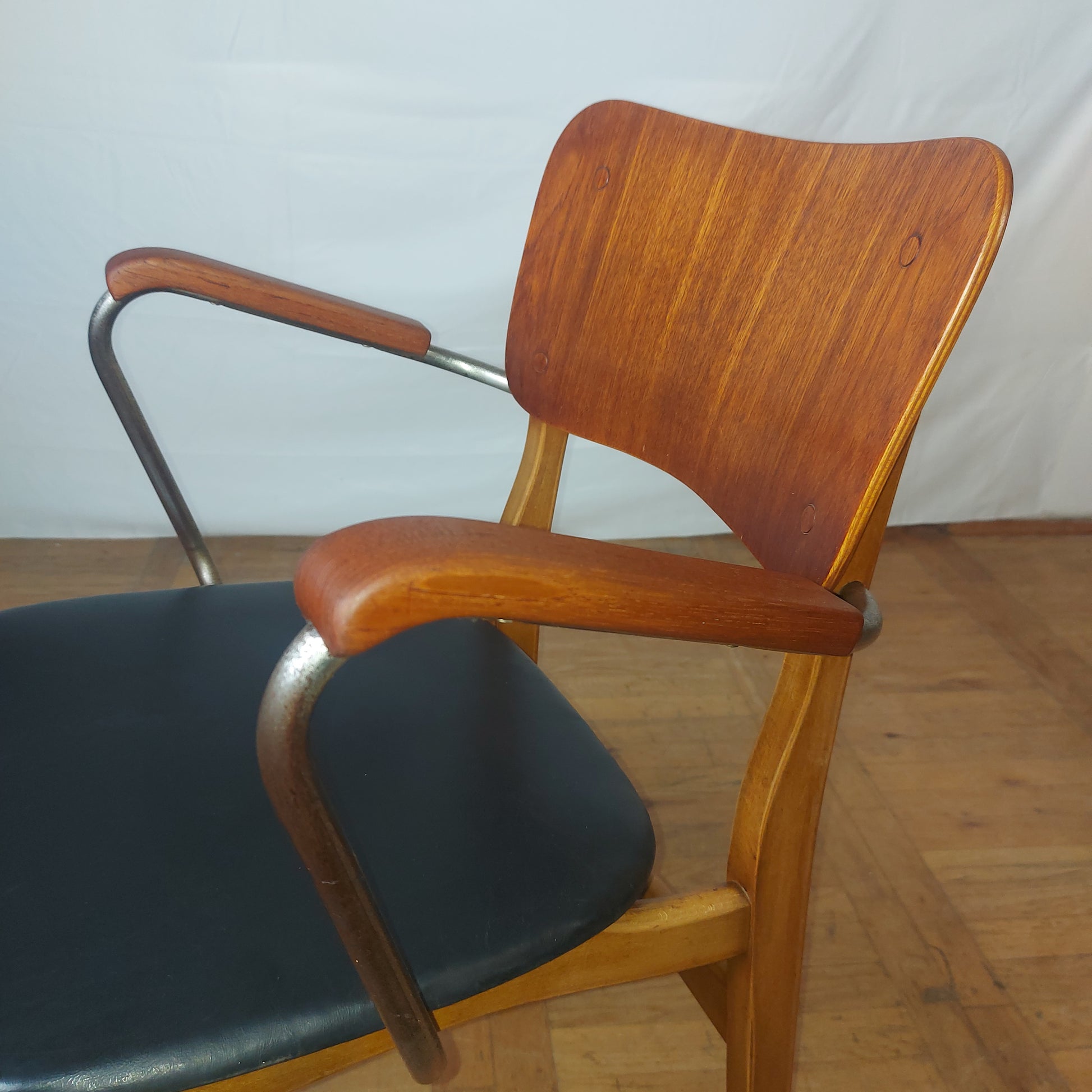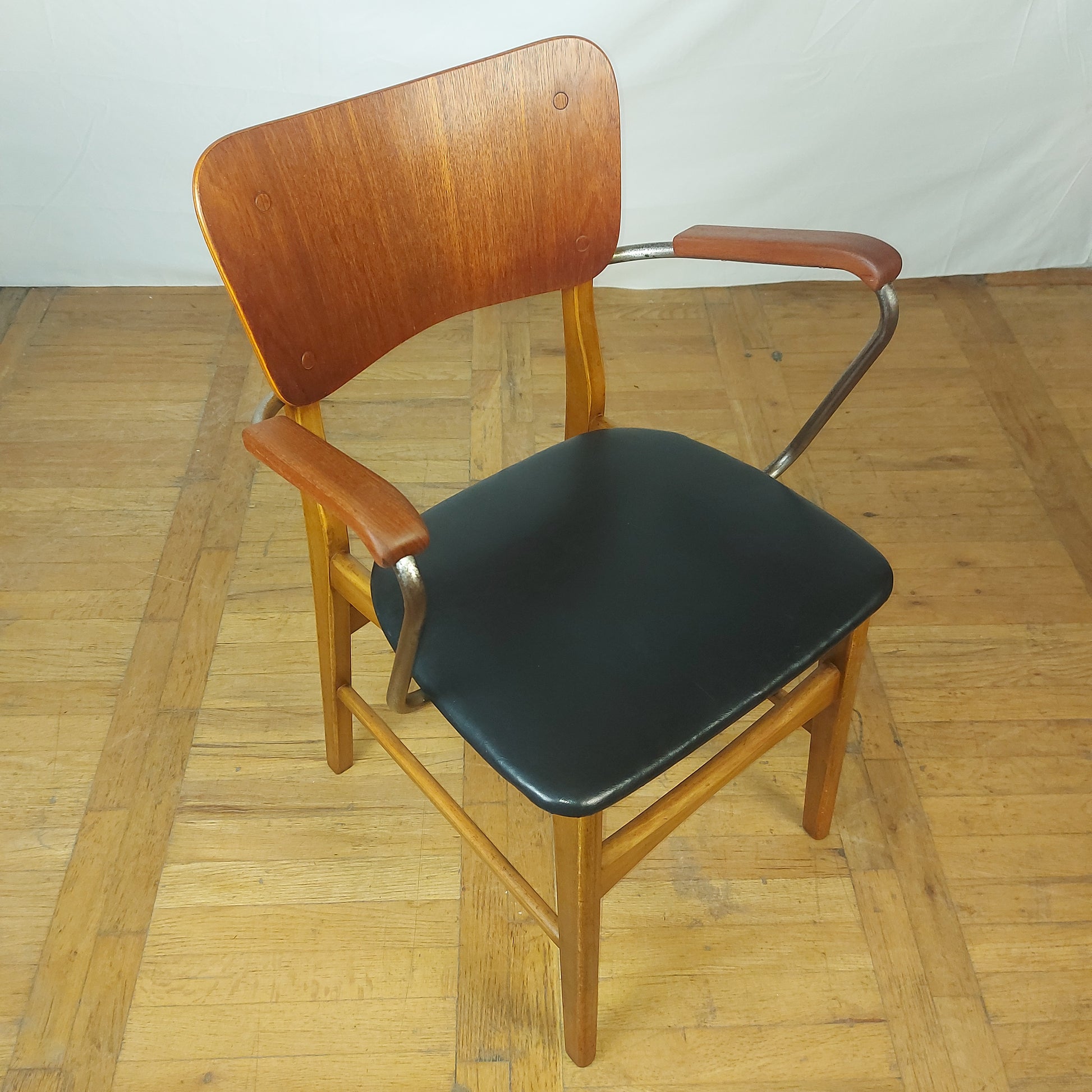 Designed by renowned Danish designer Ib Kofod-Larsen, this set of four chairs showcases his signature blend of elegance and functionality. The backrests and armrests are crafted from teak, while the frames are made of solid beech wood. These chairs remain in original vintage condition, with visible signs of use and surface scratches consistent with age.