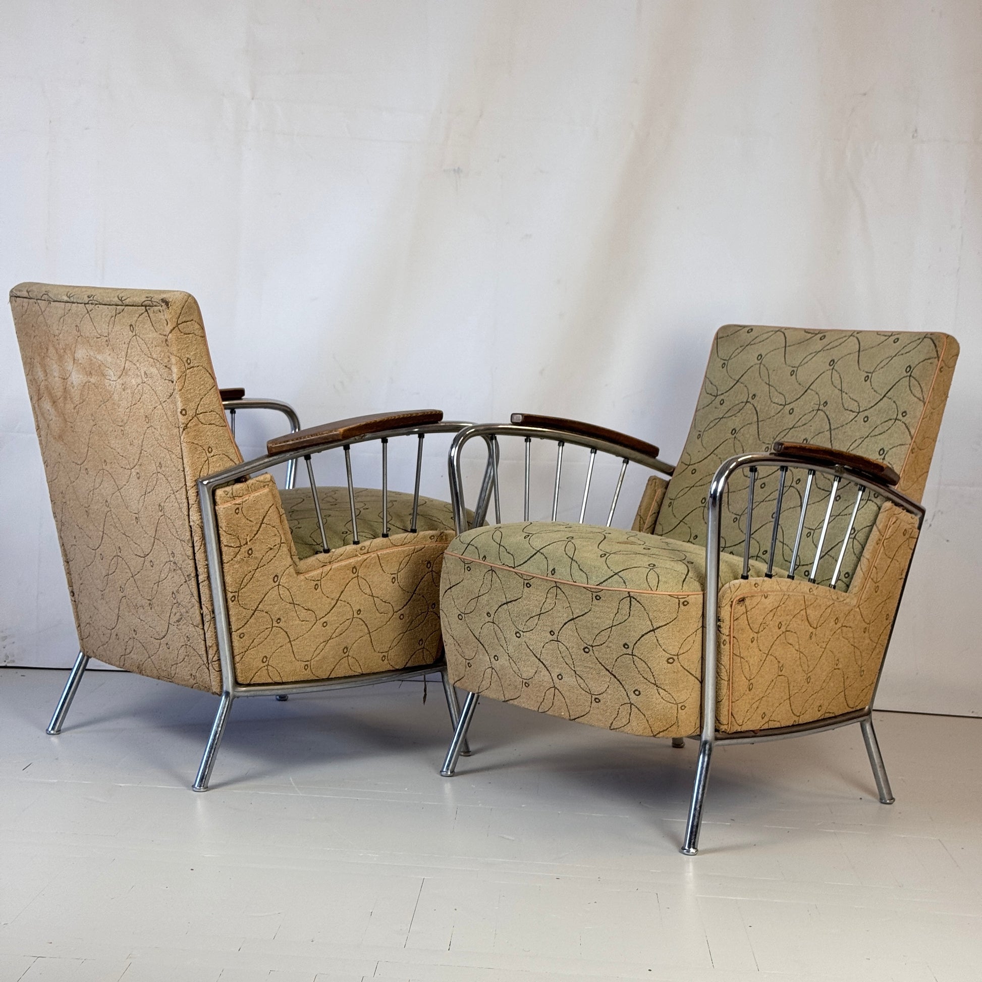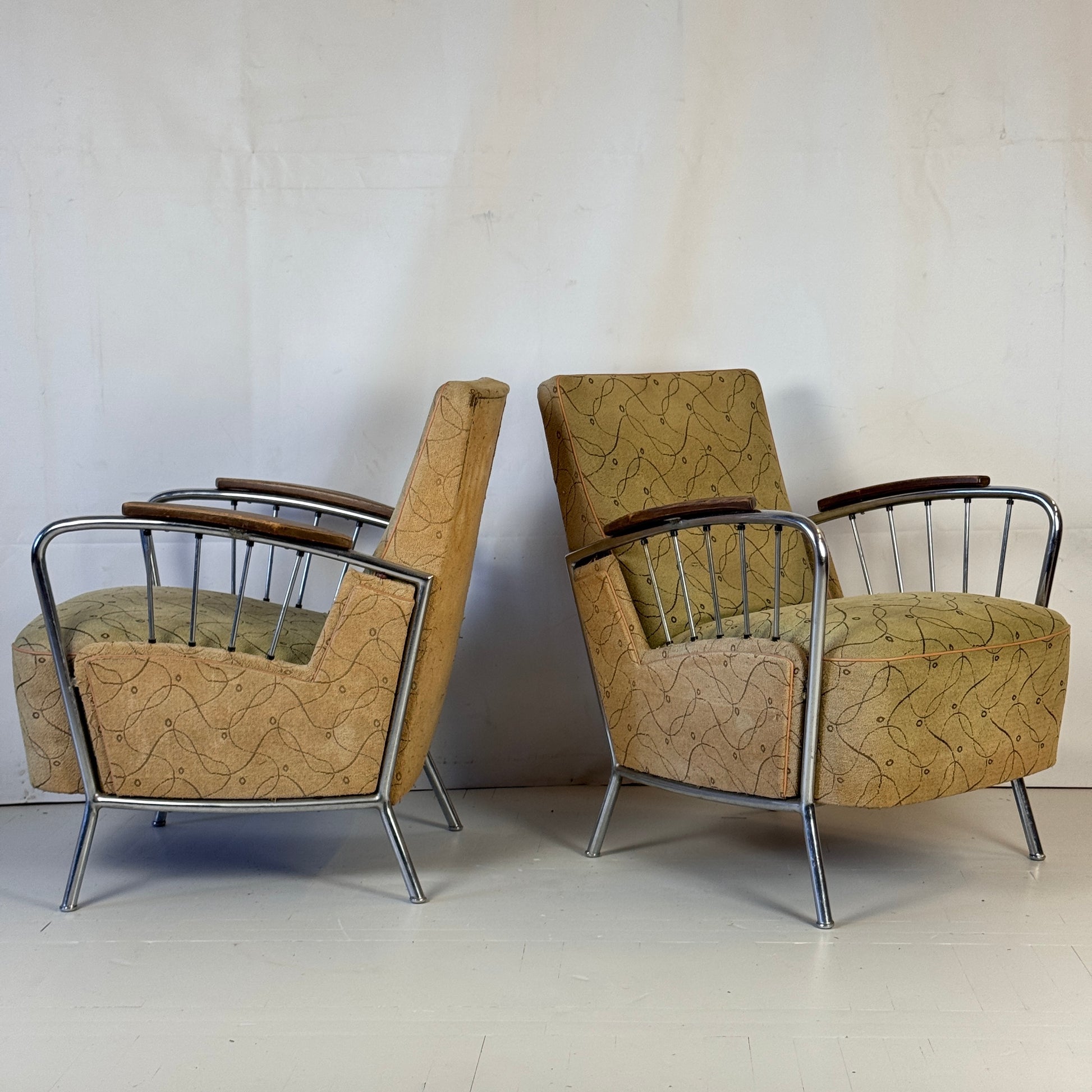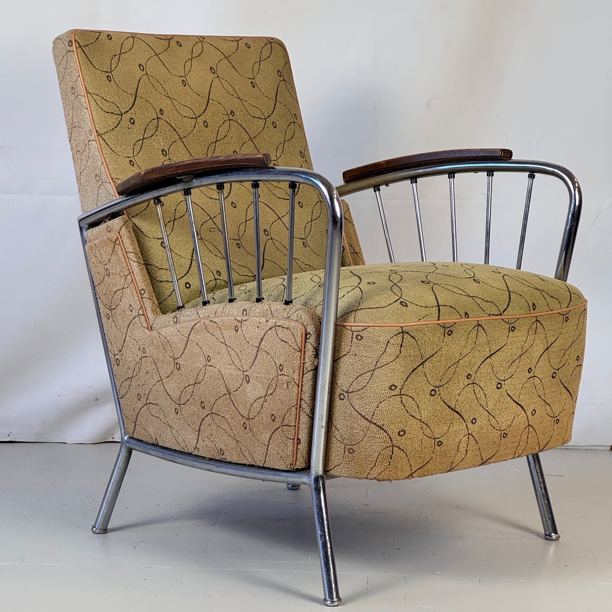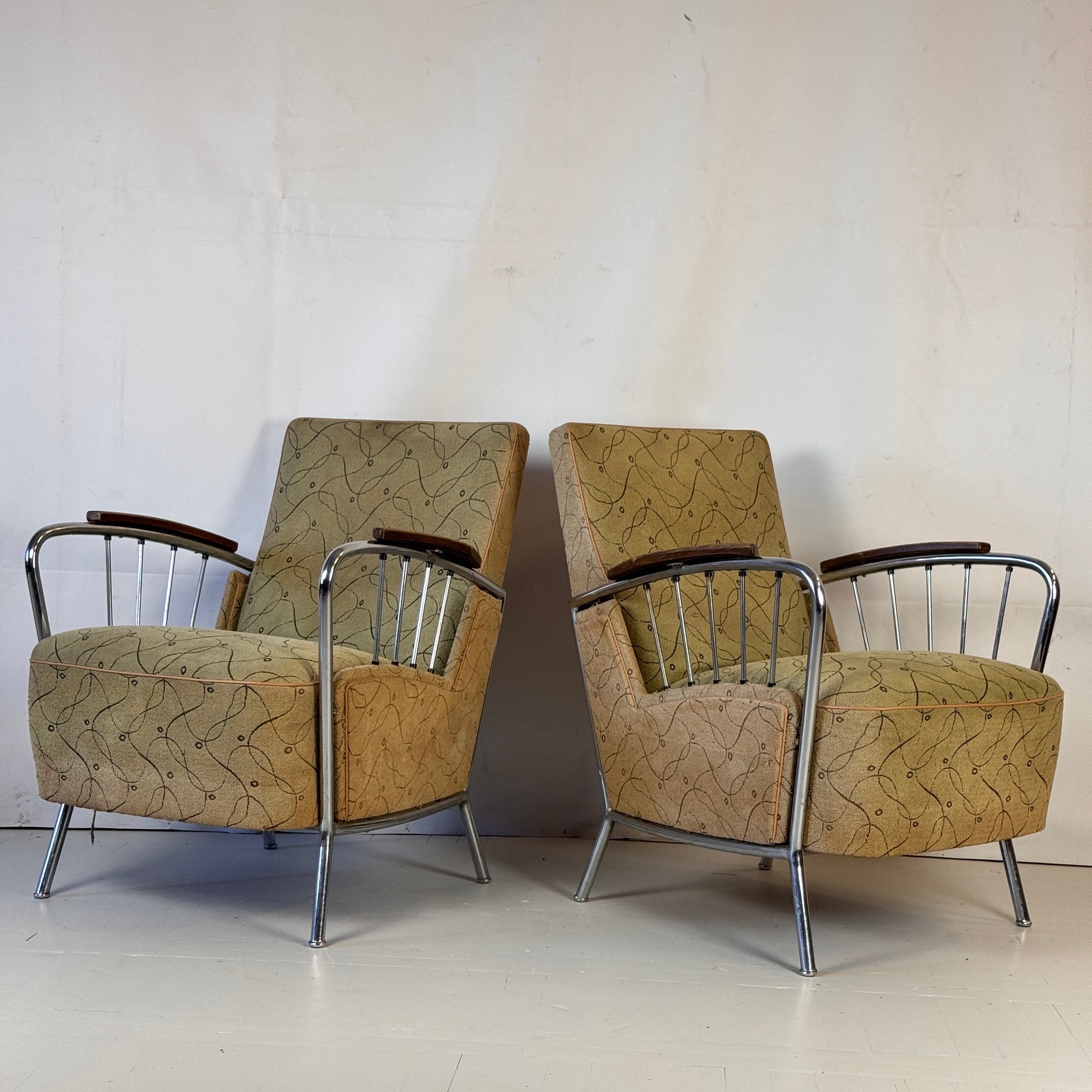 Original tubular armchair designed by József Peresztegi, one of the most rare Hungarian chairs from the 1960s. This comfortable and stable armchair measures W65 x D77 x H82 cm with a seat height of 44 cm. Please note: one of the chairs is missing two rods but remains stable and comfortable. It could benefit from some refurbishment, which we can offer if desired, tailored to your preferences.