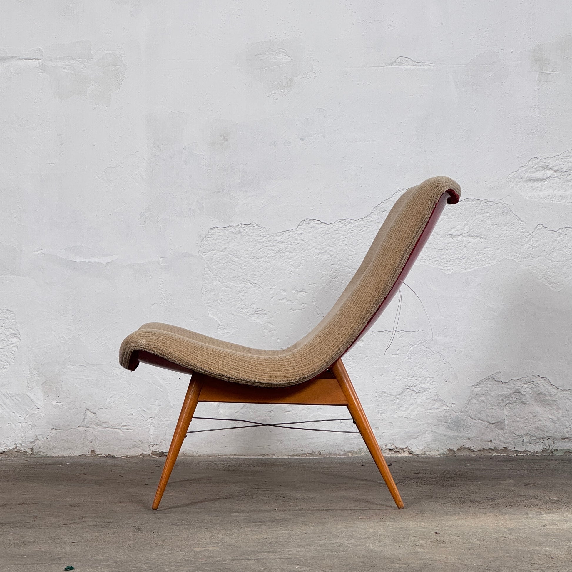 The chair's sculptural silhouette and reclined posture make it an excellent accent piece for any modernist interior, offering a perfect blend of post-war utility and timeless style.