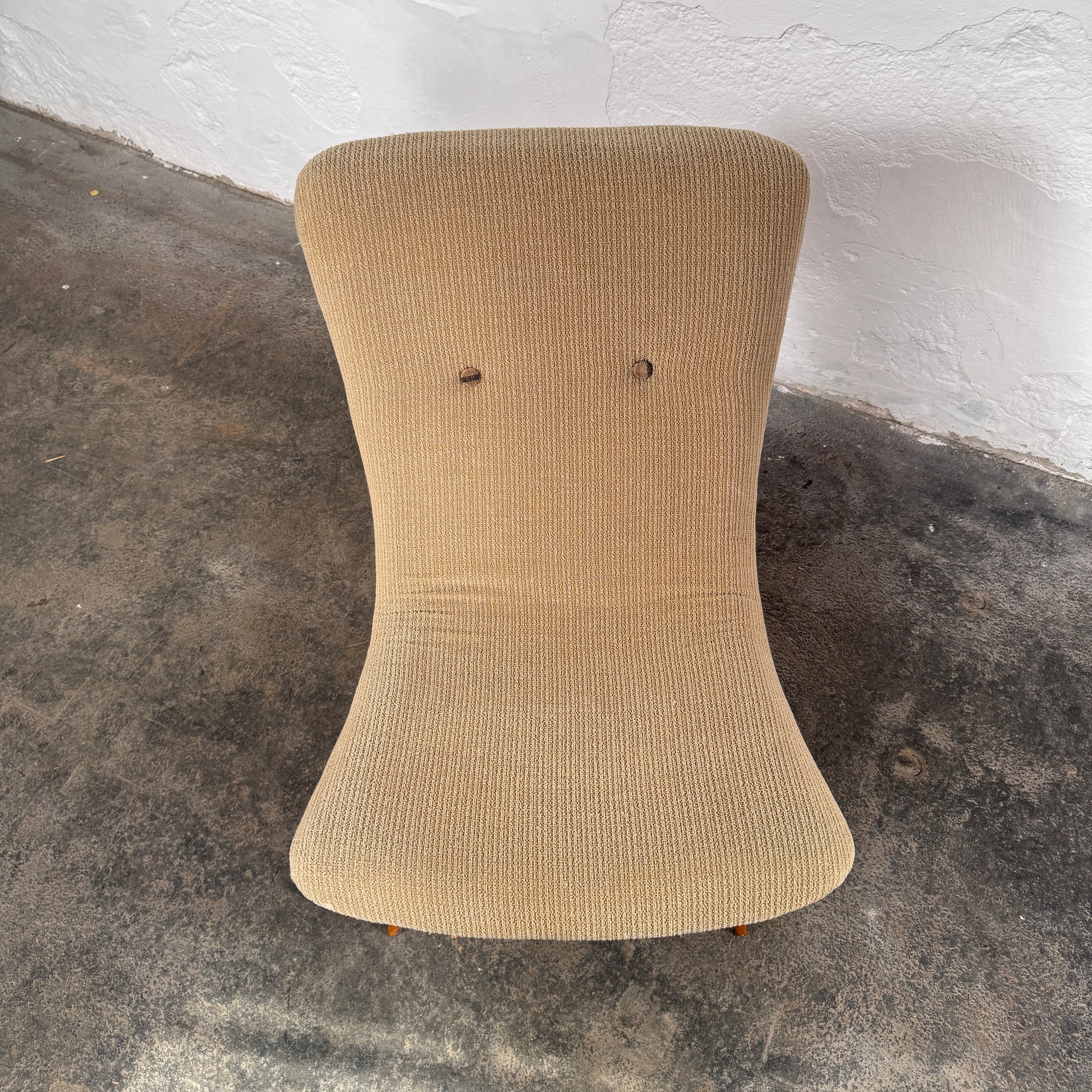 Upholstery: The chair has been over-upholstered in a beige textured fabric. Please review the photos carefully, as the back shows the underlying red vinyl and visible stitching from previous work.