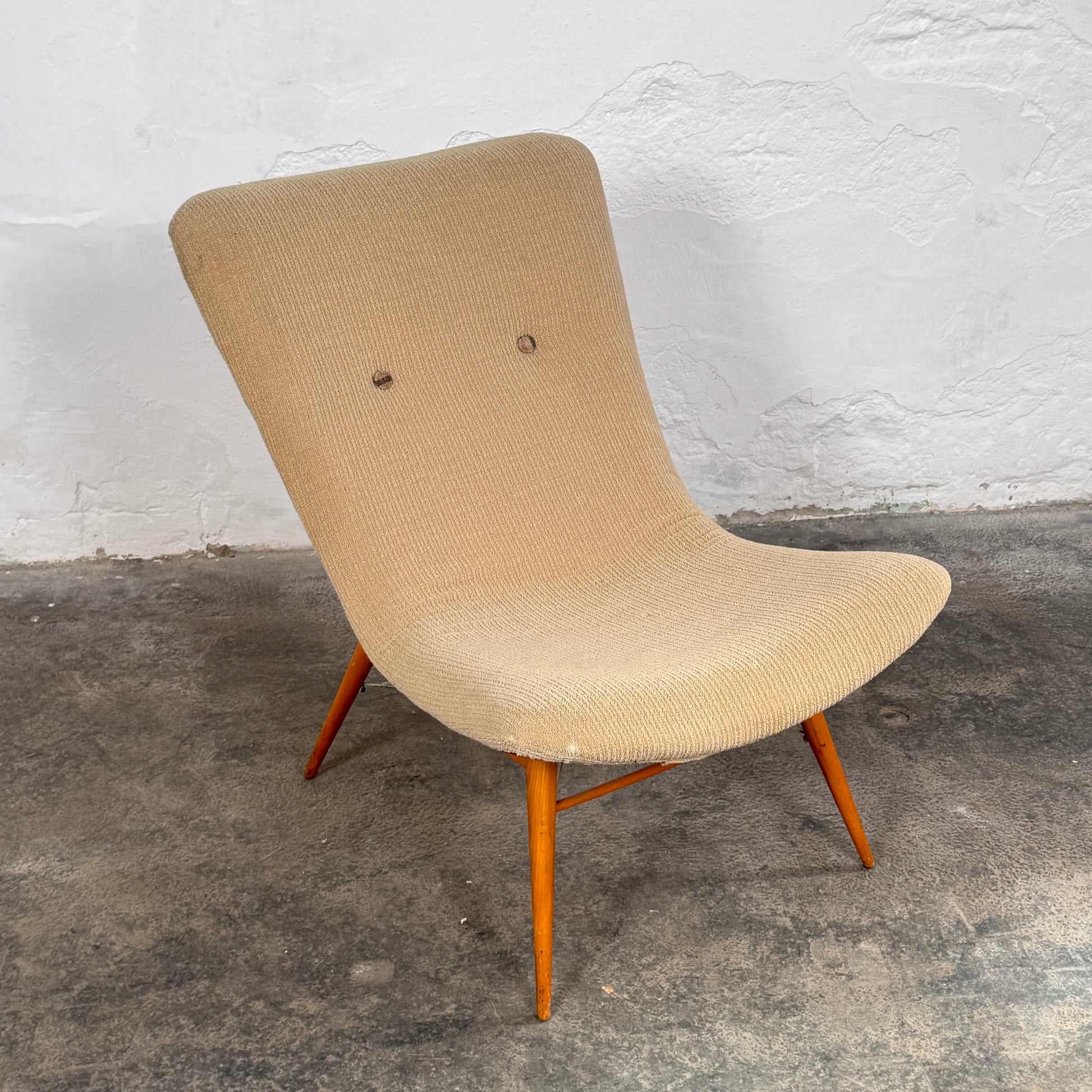 This vintage lounge chair (often referred to as a "Tabouret" in original catalogs) is a standout piece of Mid-Century Modern design by the renowned Jindřich Halabala for Český Nábytek. Produced in the 1950s, this model showcases Halabala’s transition into more organic, sleek forms, featuring a dynamic shell seat supported by elegant, tapered wooden legs.