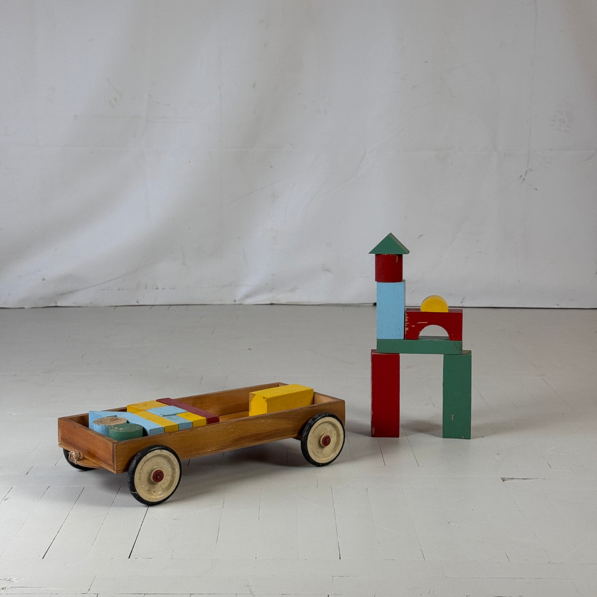 Mid-Century Kids Toy Colorful Building Bricks in Wooden Cart