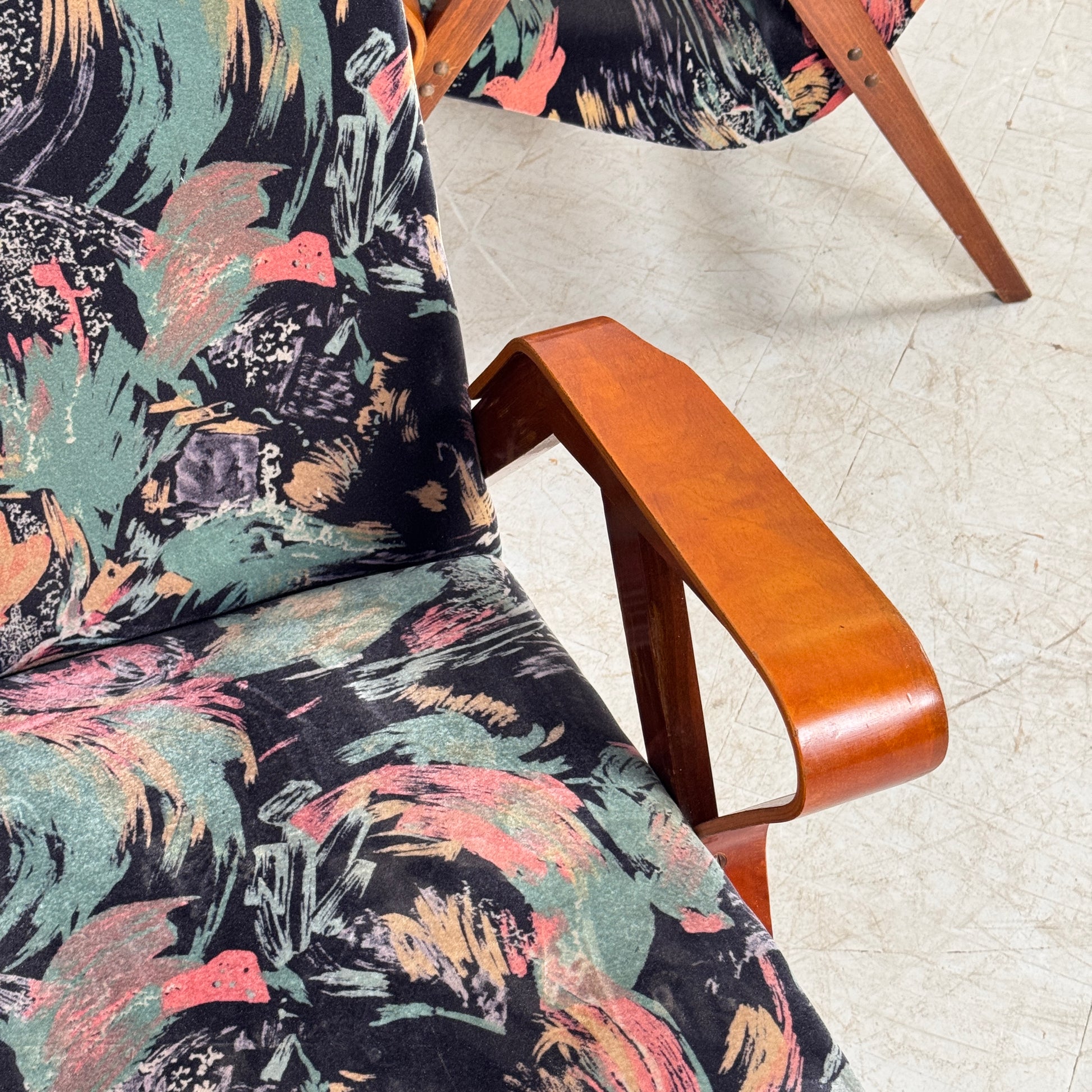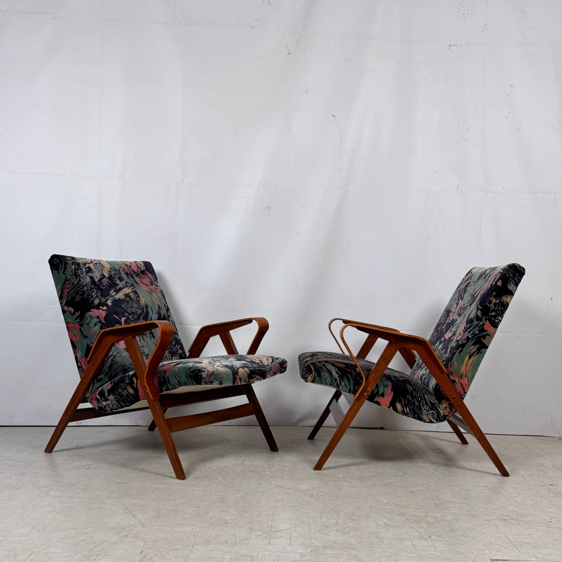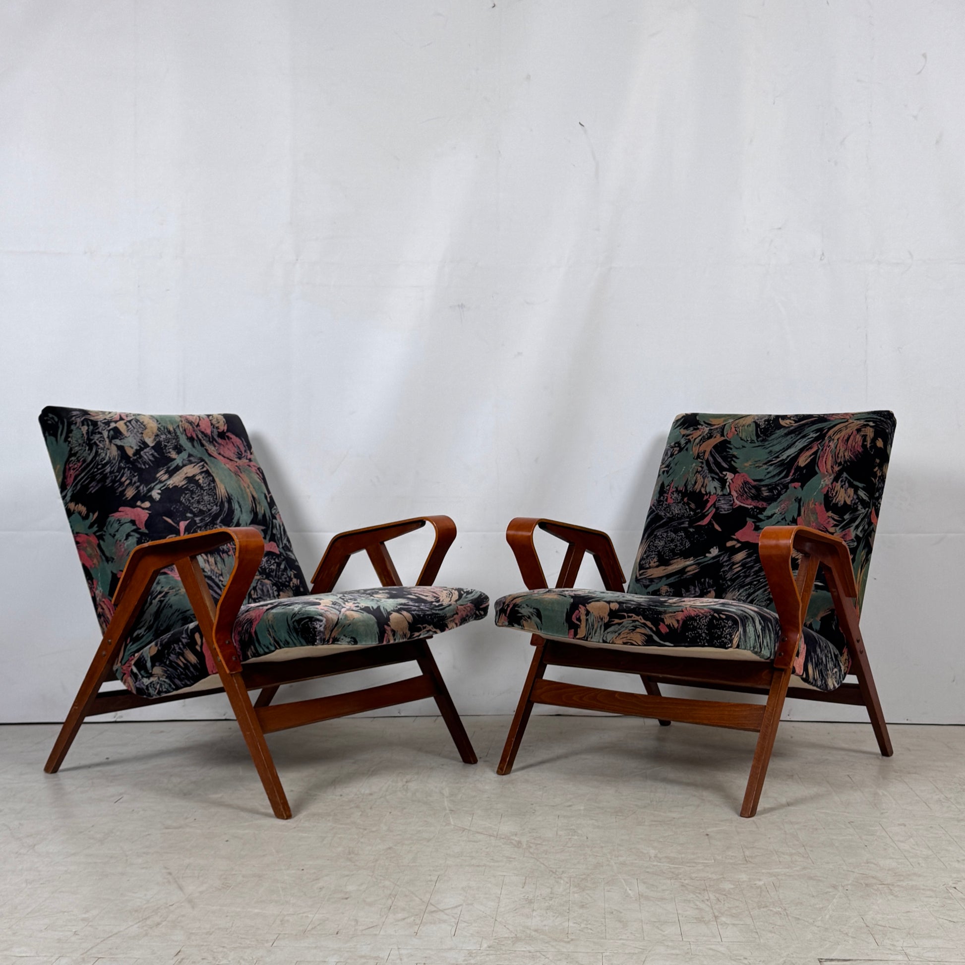 Vintage pair of armchairs by František Jirák for Tatra Nabytok. The upholstery was replaced in the early 2000s, while the wooden parts remain original and stable. The chairs are structurally sound and ready for use.