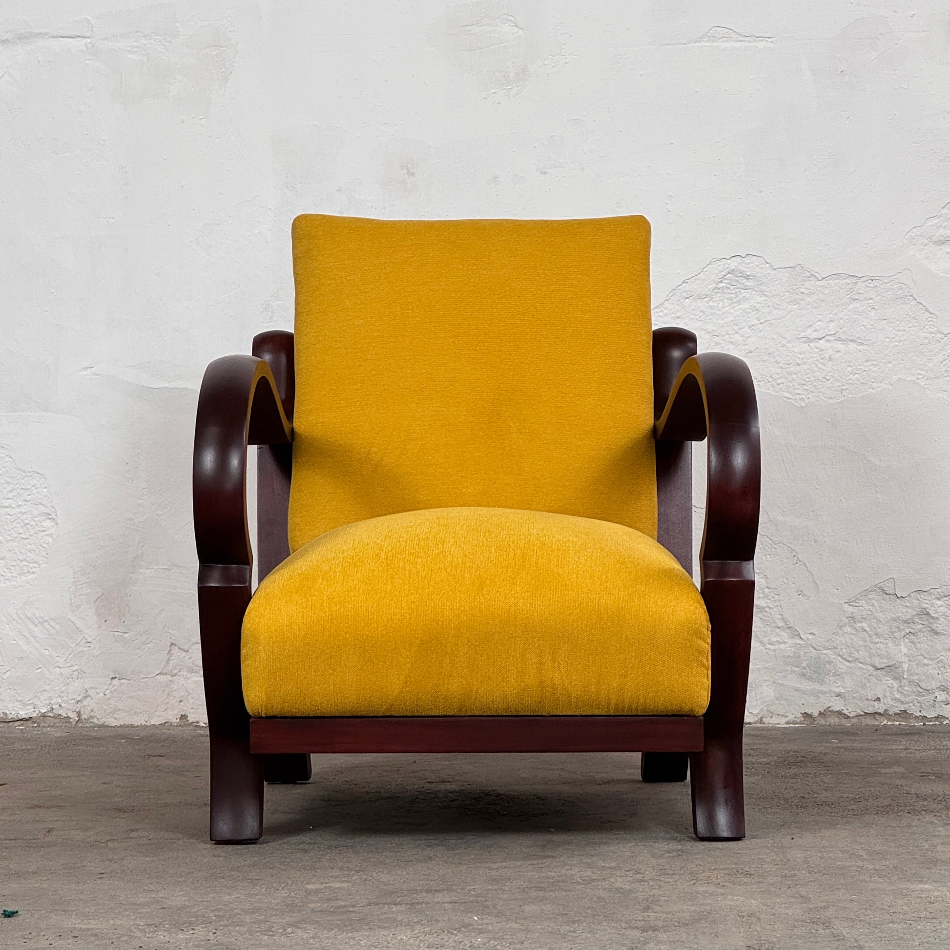 The design bridges the gap between pre-war elegance and mid-century functionalism, featuring a wide, welcoming silhouette and architectural wooden supports.