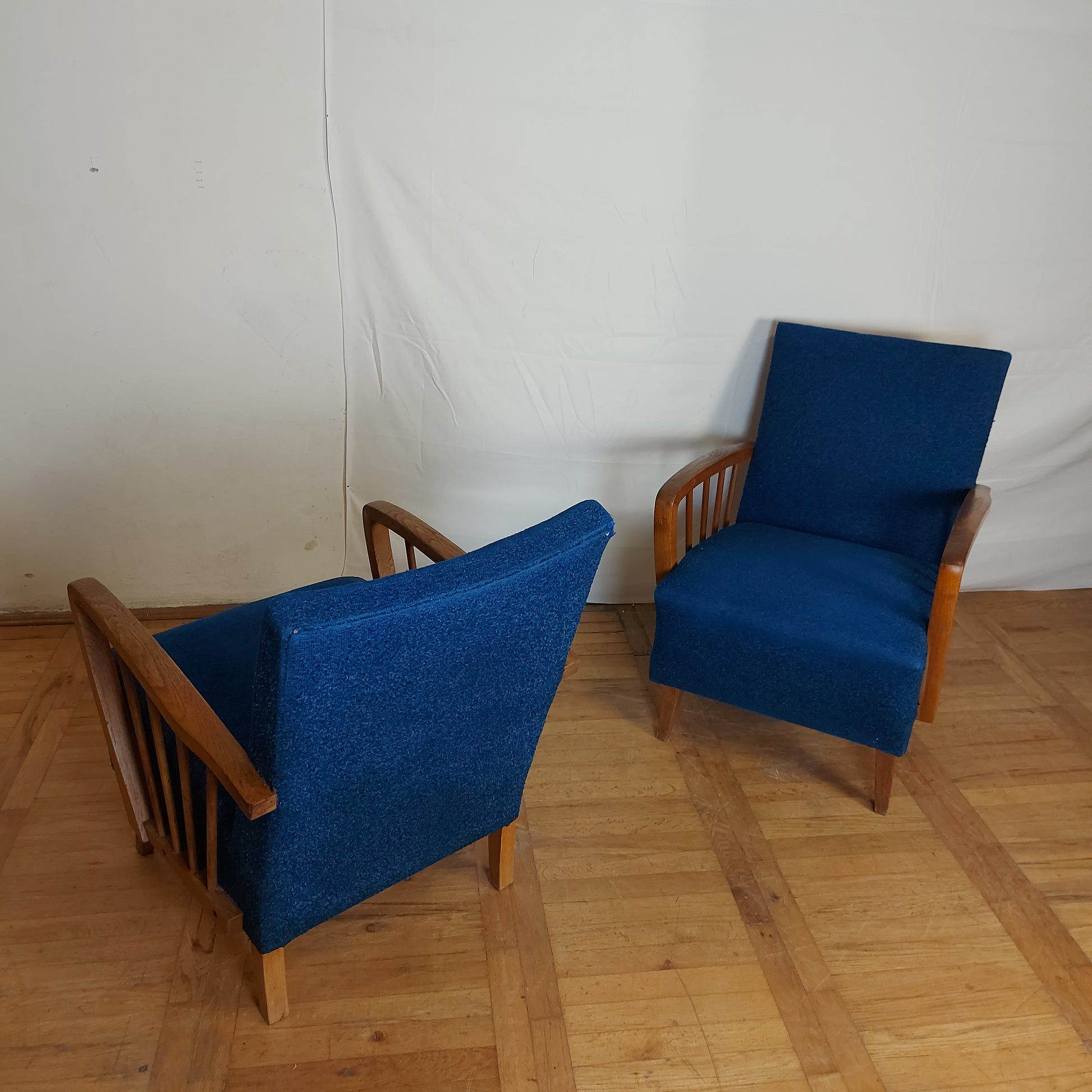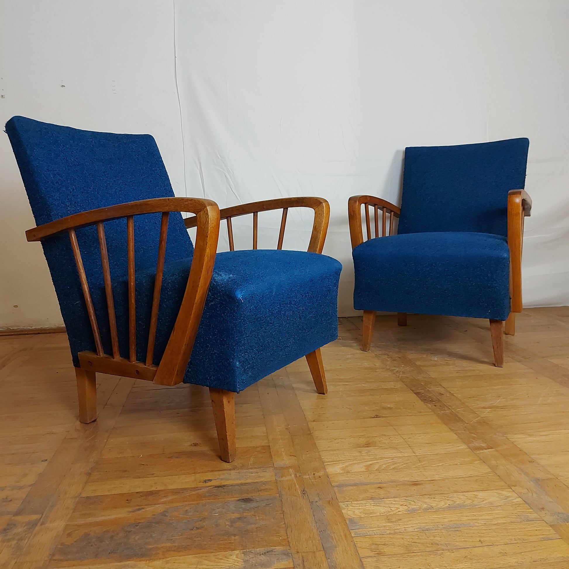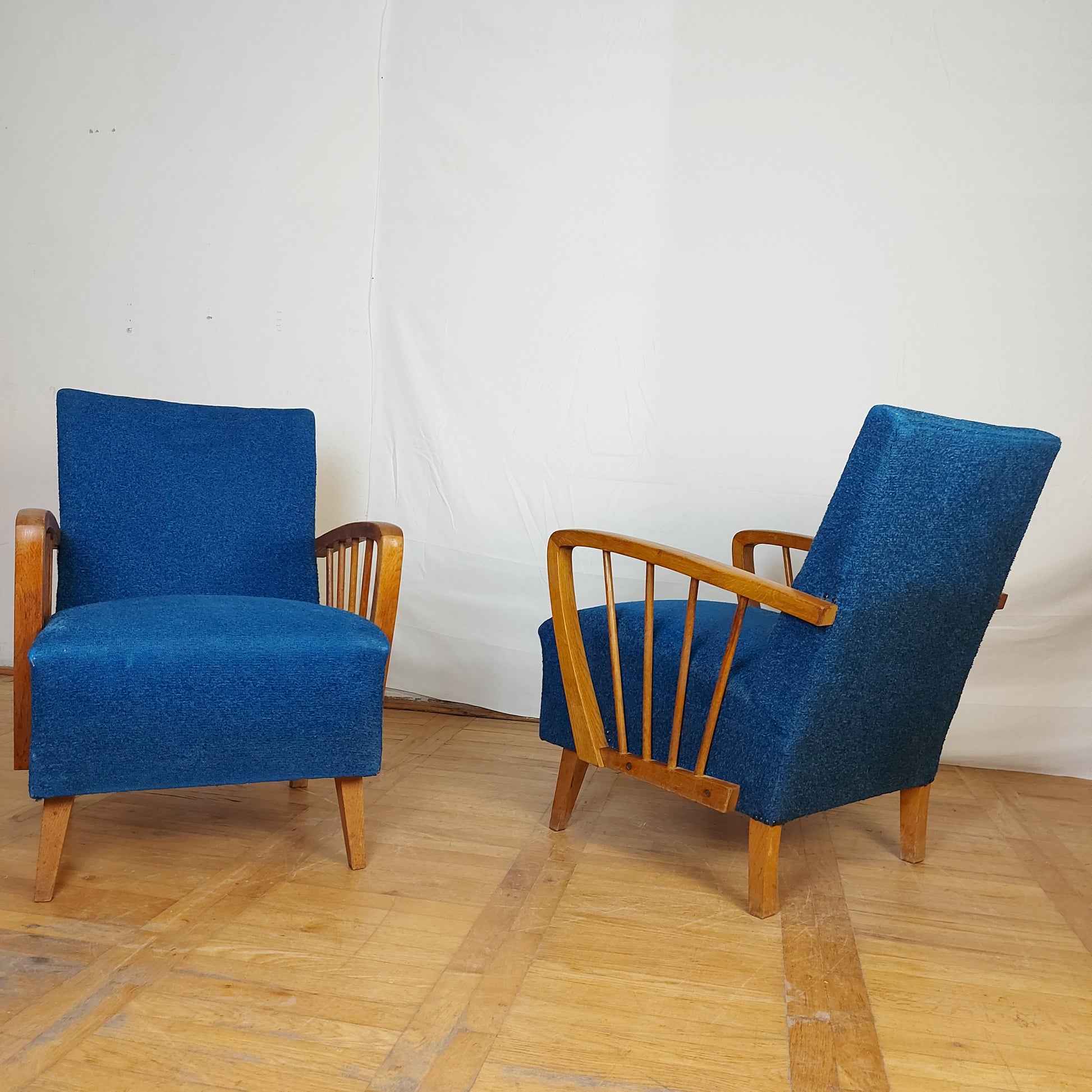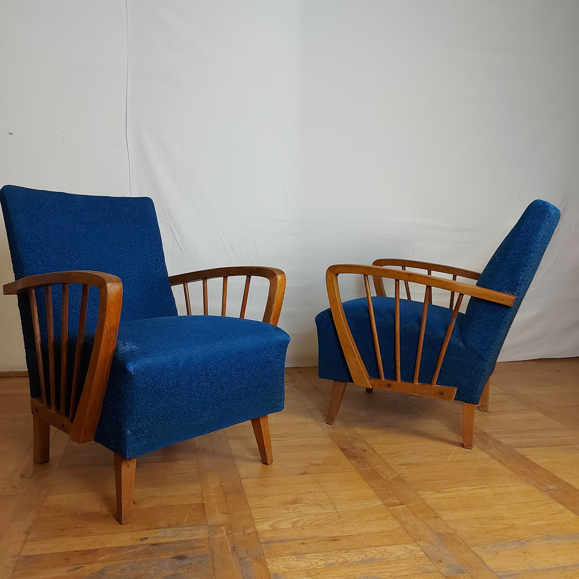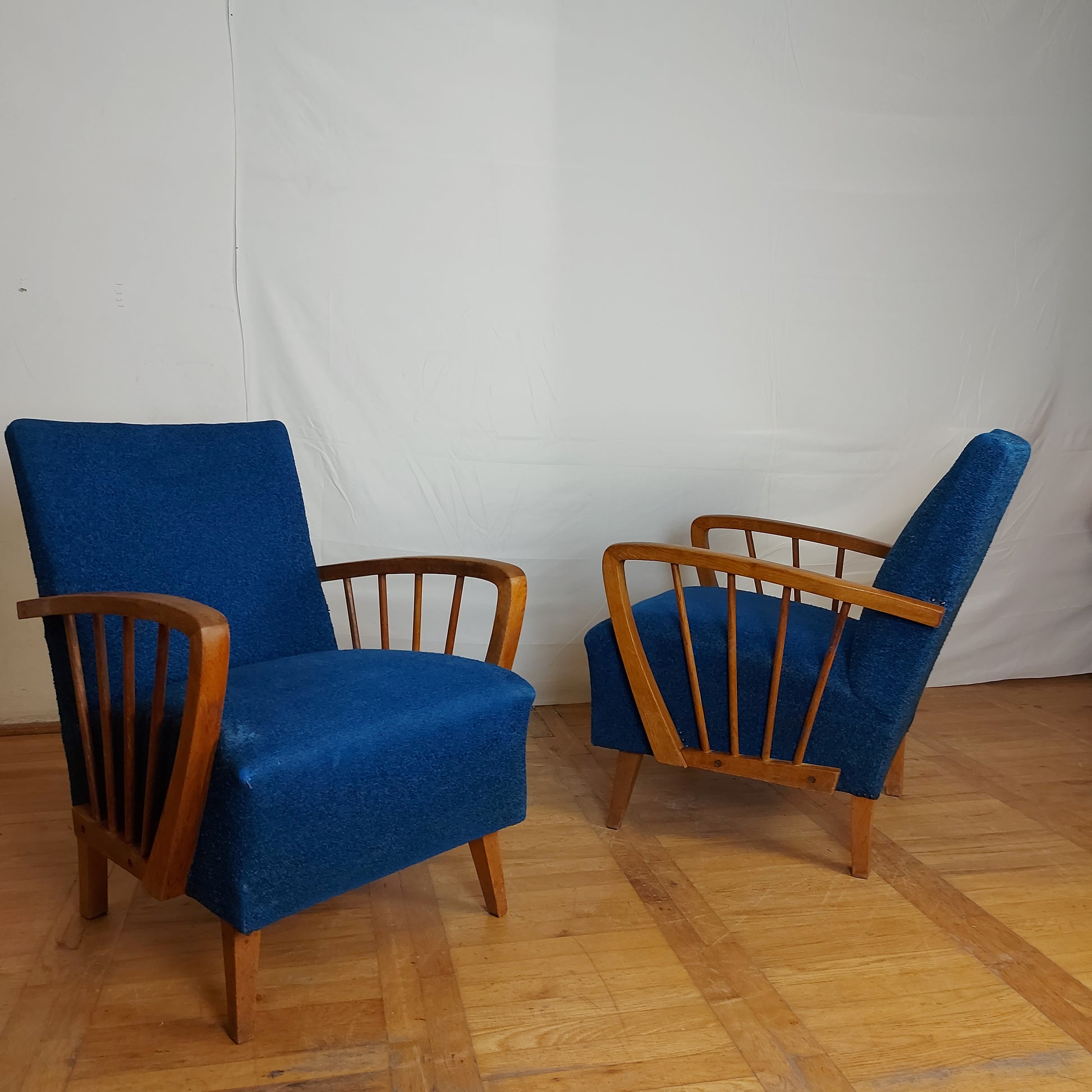 Made of oak wood in DDR (East Germany) in 1960s. These armchairs have a stabil structure, good springs and original upholstery. You may consider changing the fabric, but this is also nice and have lively color.