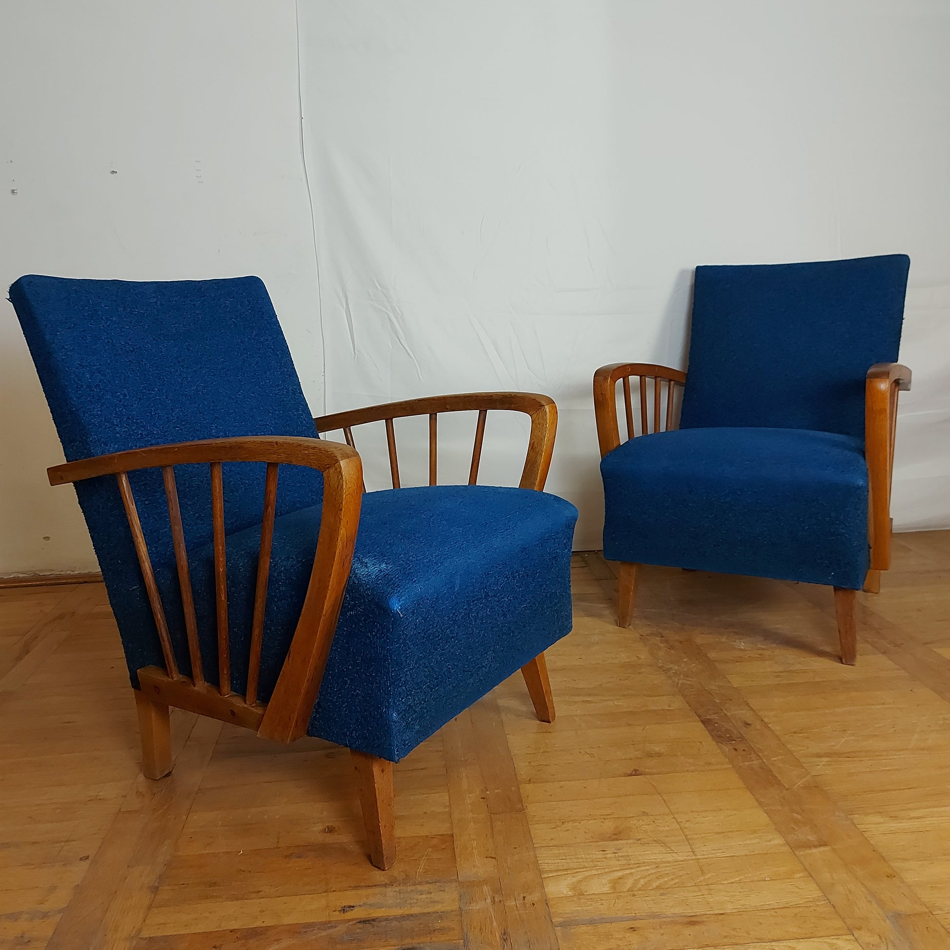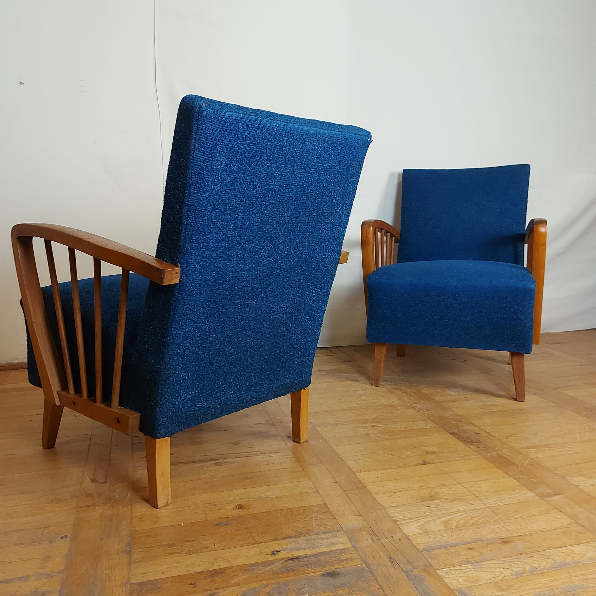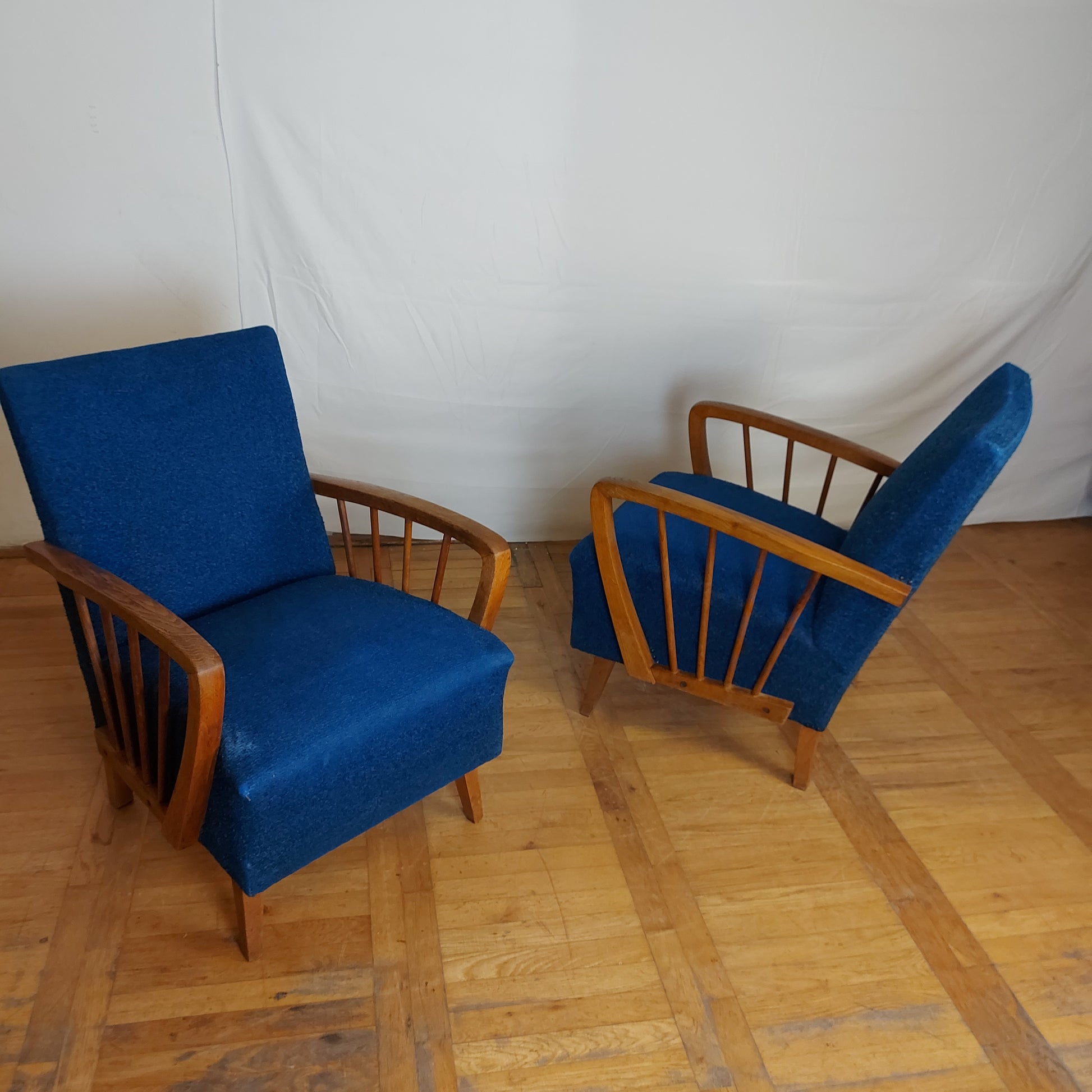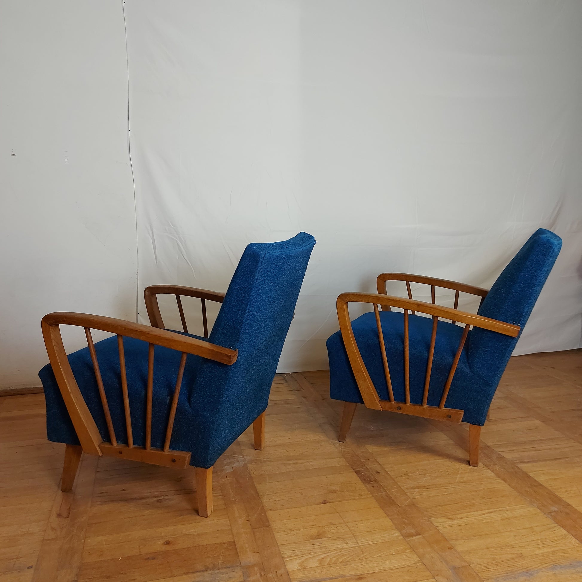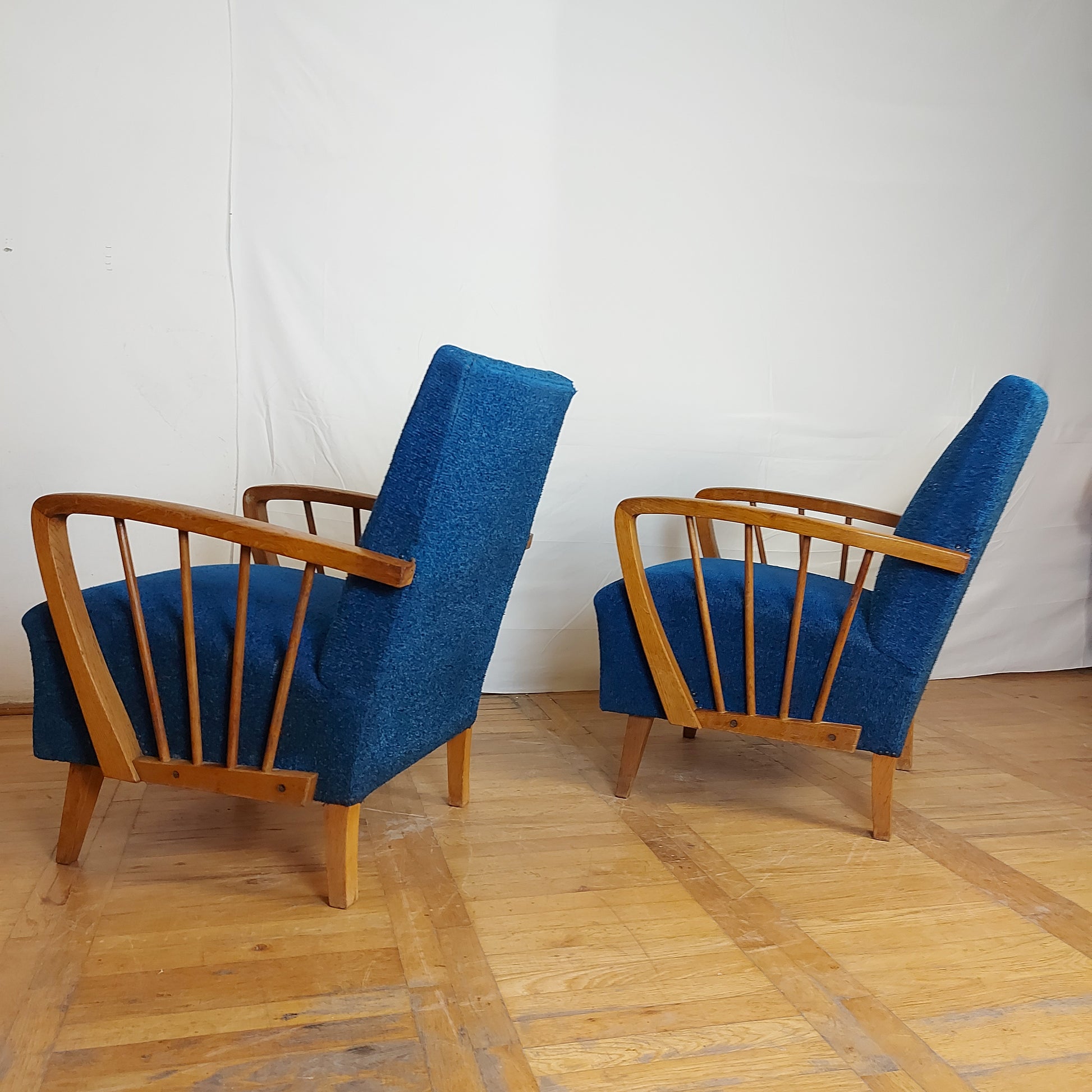 Made of oak wood in DDR (East Germany) in 1960s. These armchairs have a stabil structure, good springs and original upholstery. You may consider changing the fabric, but this is also nice and have lively color.