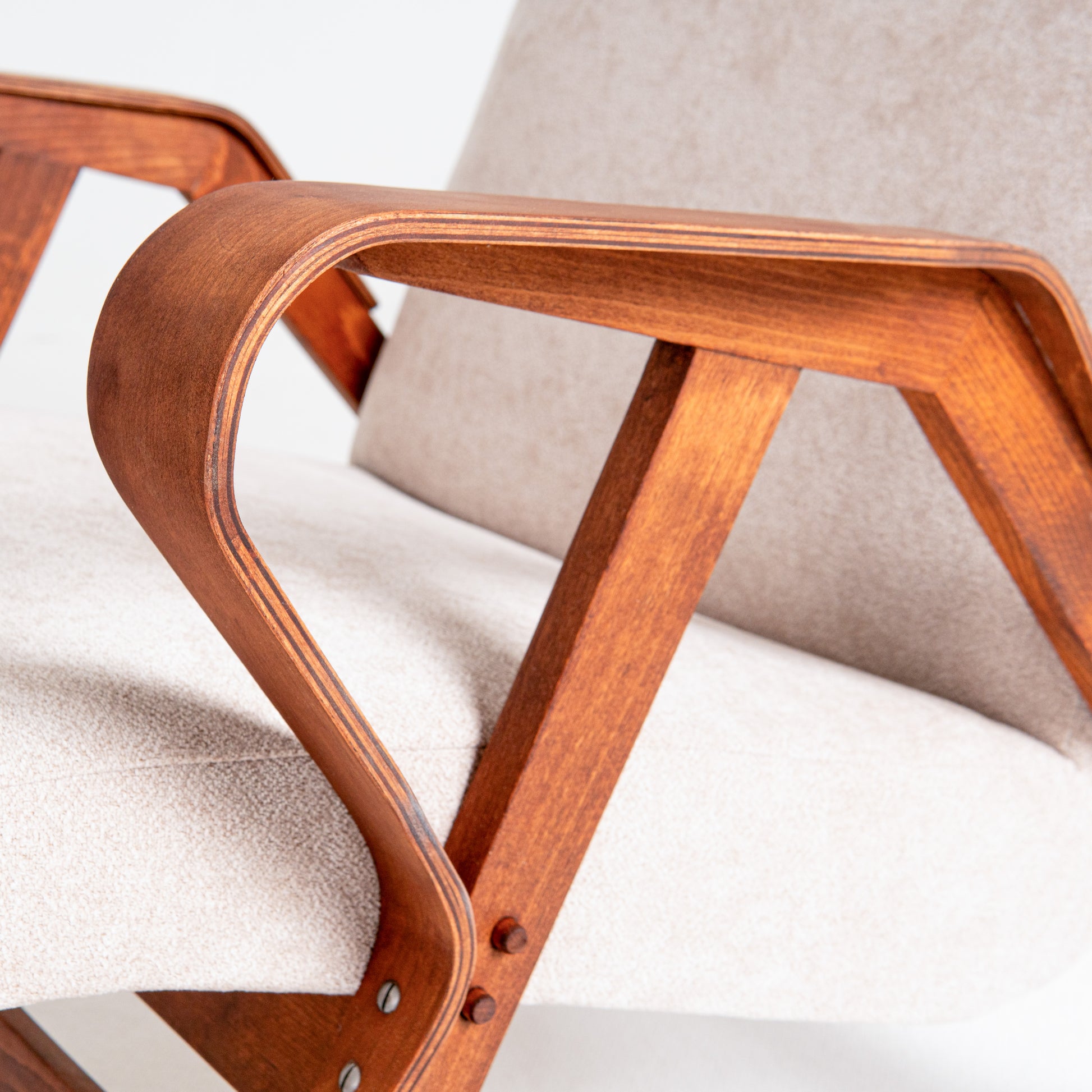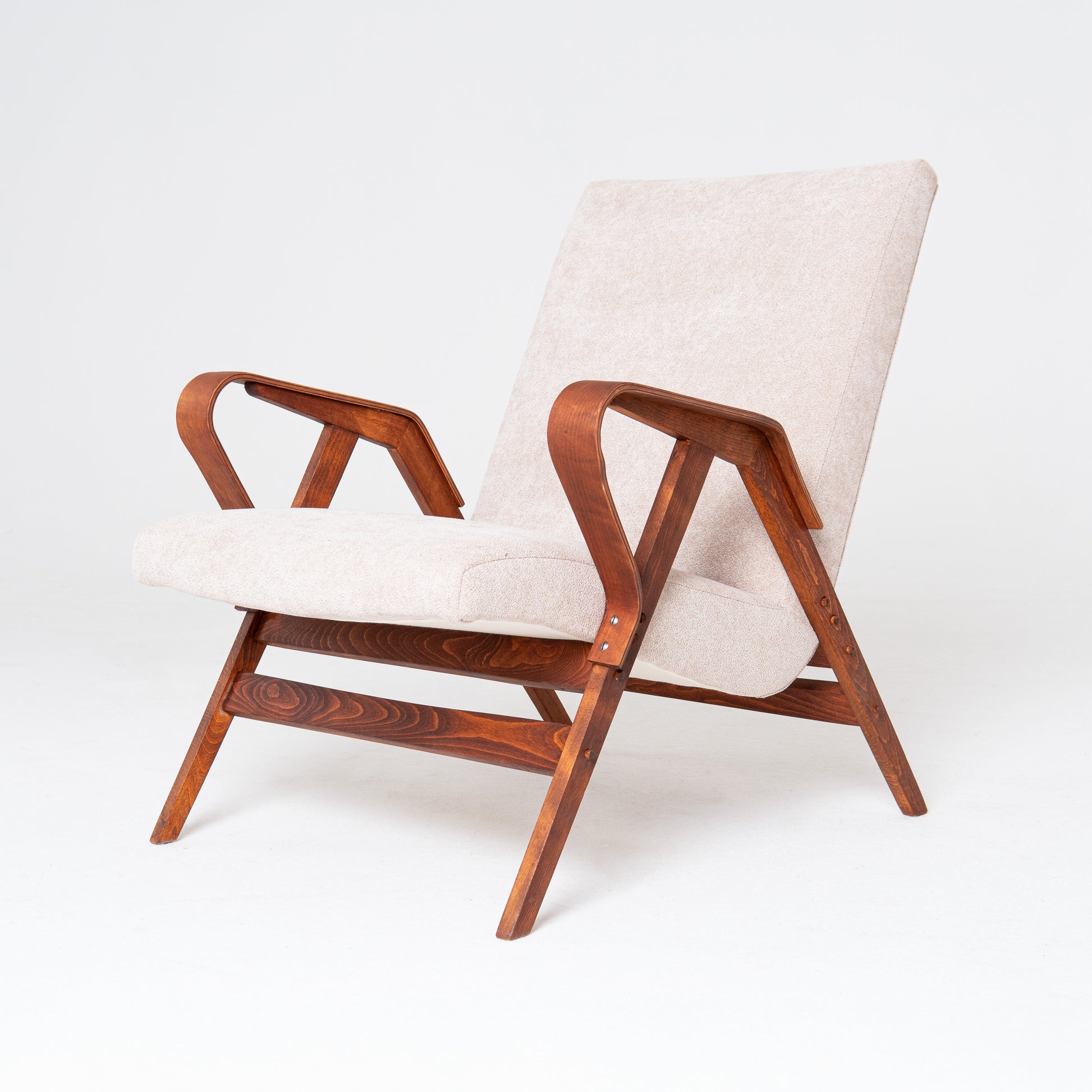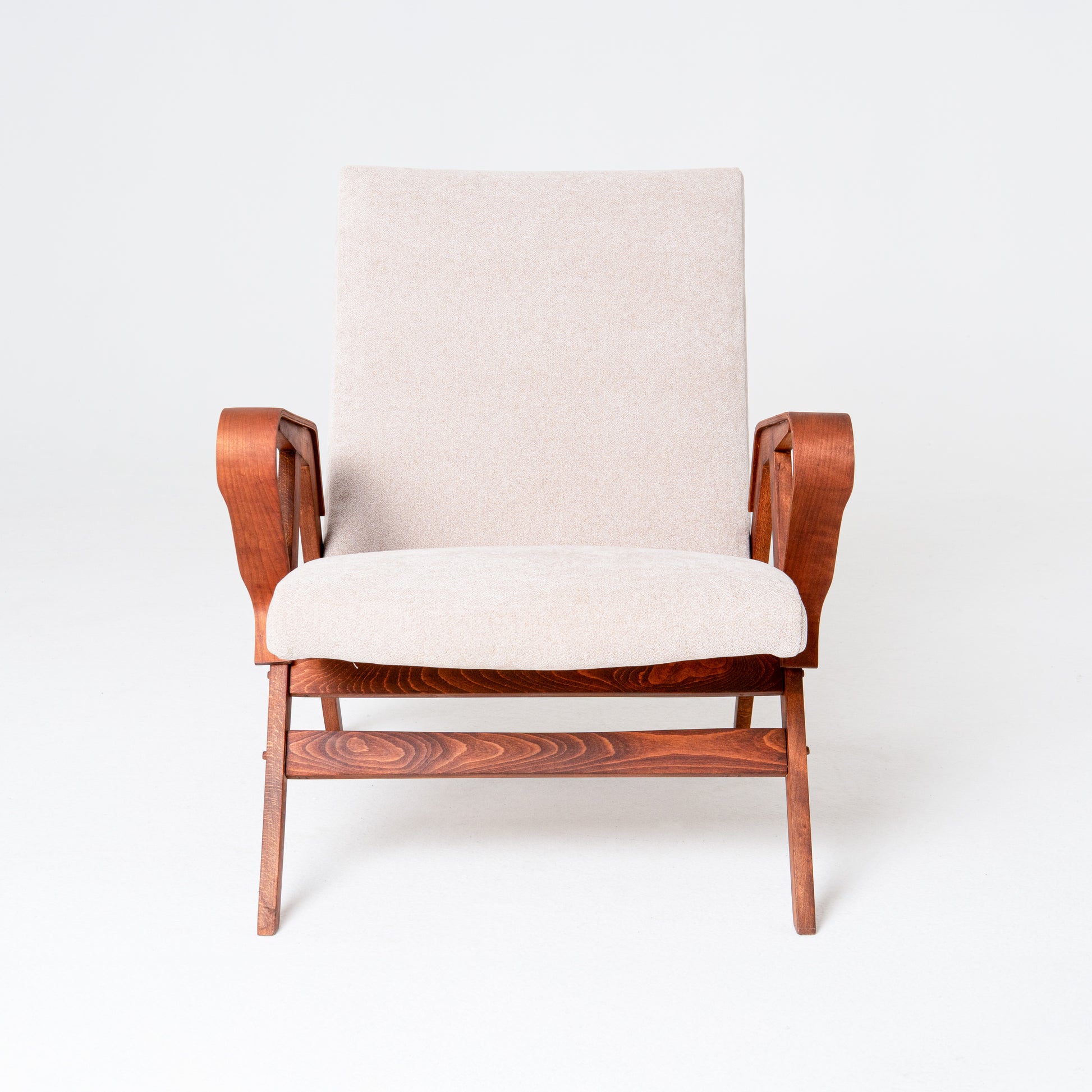 A beautifully refurbished set comprising two iconic armchairs and a matching ottoman, designed by František JiráK for Tatra Nábytok in the 1960s. These pieces exemplify Czechoslovak mid-century modern design, combining comfort with sculptural form. Fully restored, they feature renewed upholstery and refinished woodwork—ready to complement any vintage or contemporary interior.