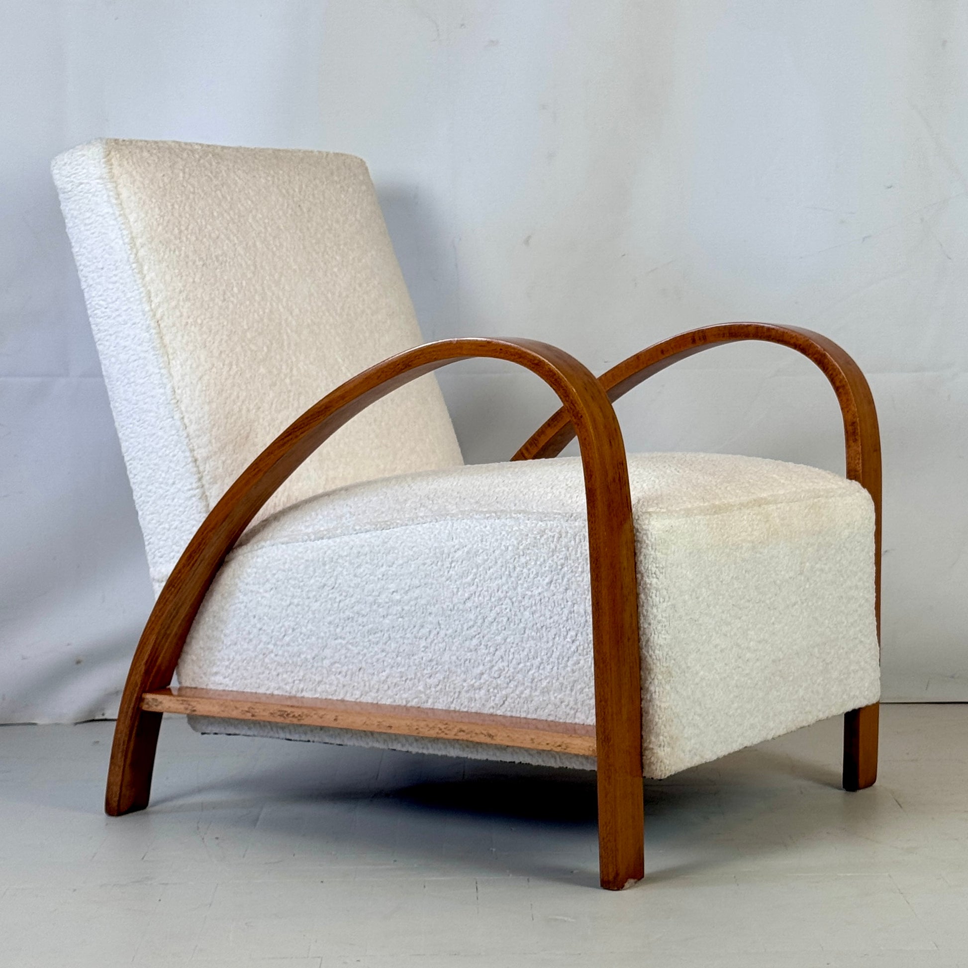 A stunning pair of French Art Deco armchairs from the 1930s, featuring elegant bent wooden arms and luxurious white bouclé upholstery. These chairs have been fully restored, combining classic style with renewed comfort, making them a timeless addition to any interior.