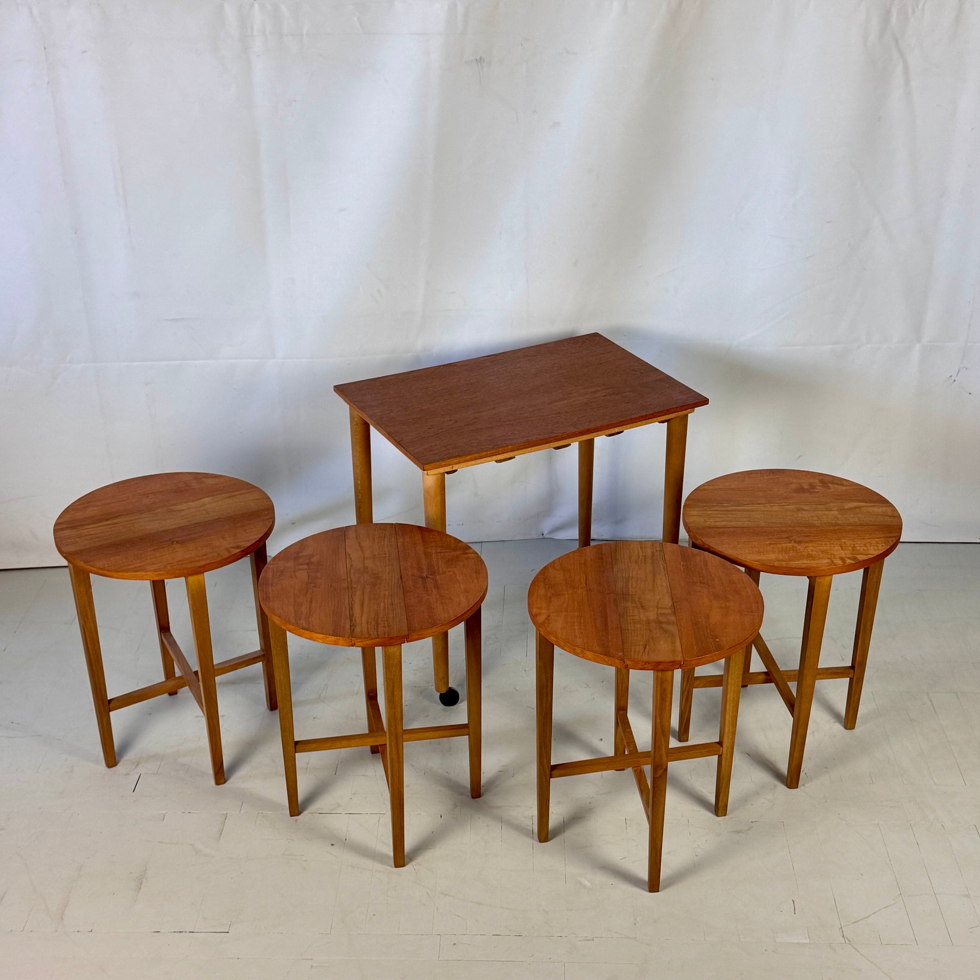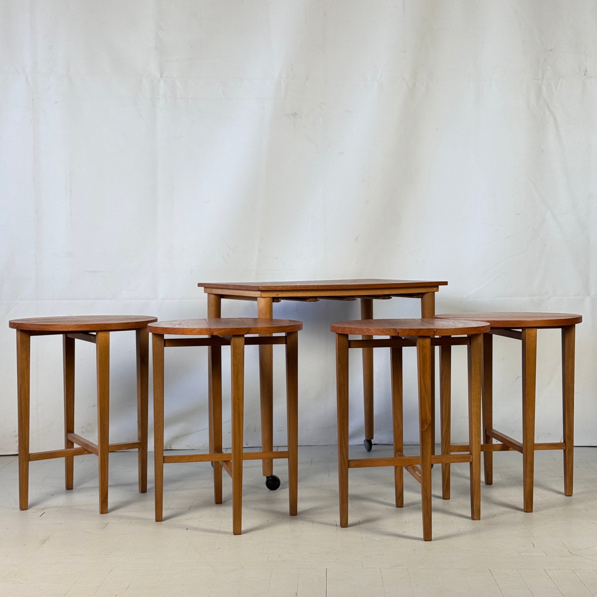 Mid-century British teak nest of tables designed by Paul Hundevad, consisting of one large coffee table on wheels with four smaller tables nested inside. Clean lines and classic 1960s design make this set both functional and stylish — perfect as a centerpiece or versatile living room solution.