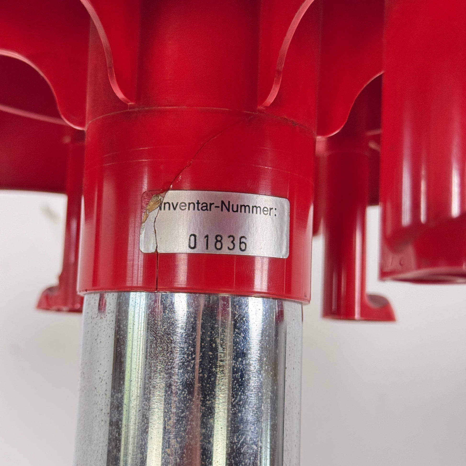 Iconic red coat hanger designed by Roberto Lucchi and Paolo Orlandini for Velca Legnano, Milan in the 1970s. The piece is in solid condition, though it had a few breaks in the past that were fixed by the previous owner (see photos). A striking example of Italian mid-century design, perfect as a functional art piece for your entryway or studio.