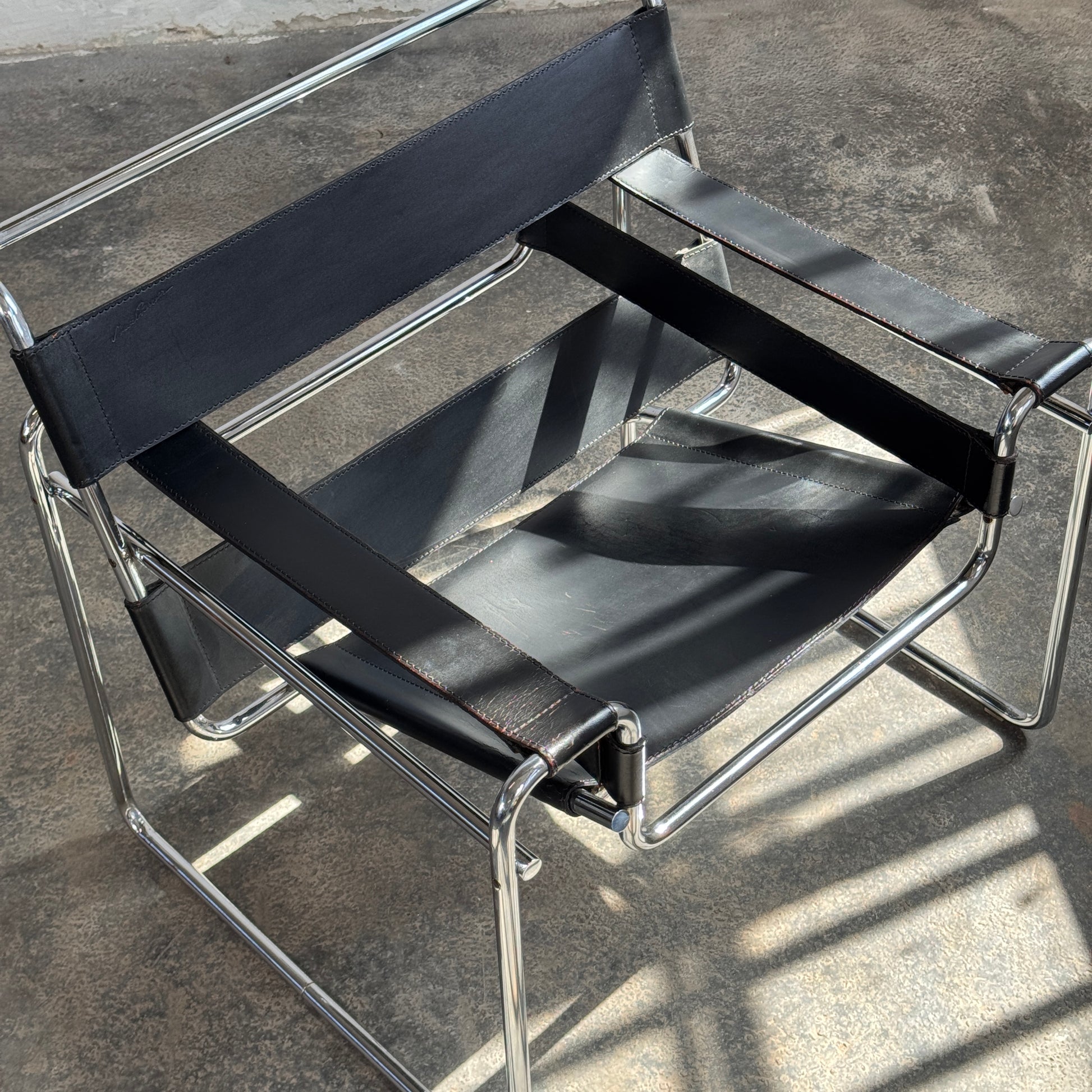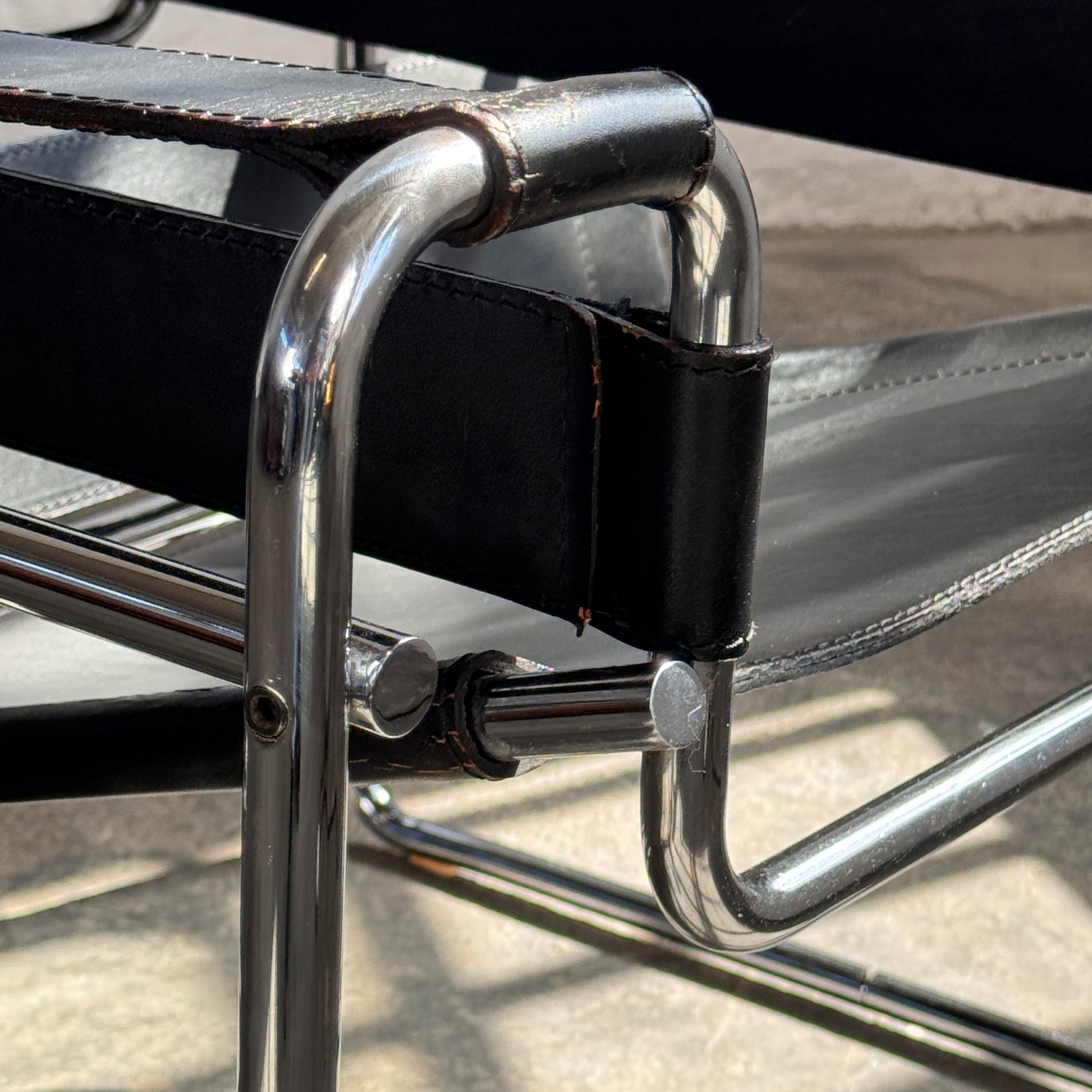 Leather: The chairs feature original thick black leather slings. The leather has developed a beautiful patina with signs of use visible on the seats and contact points, adding to the chairs' authentic character.