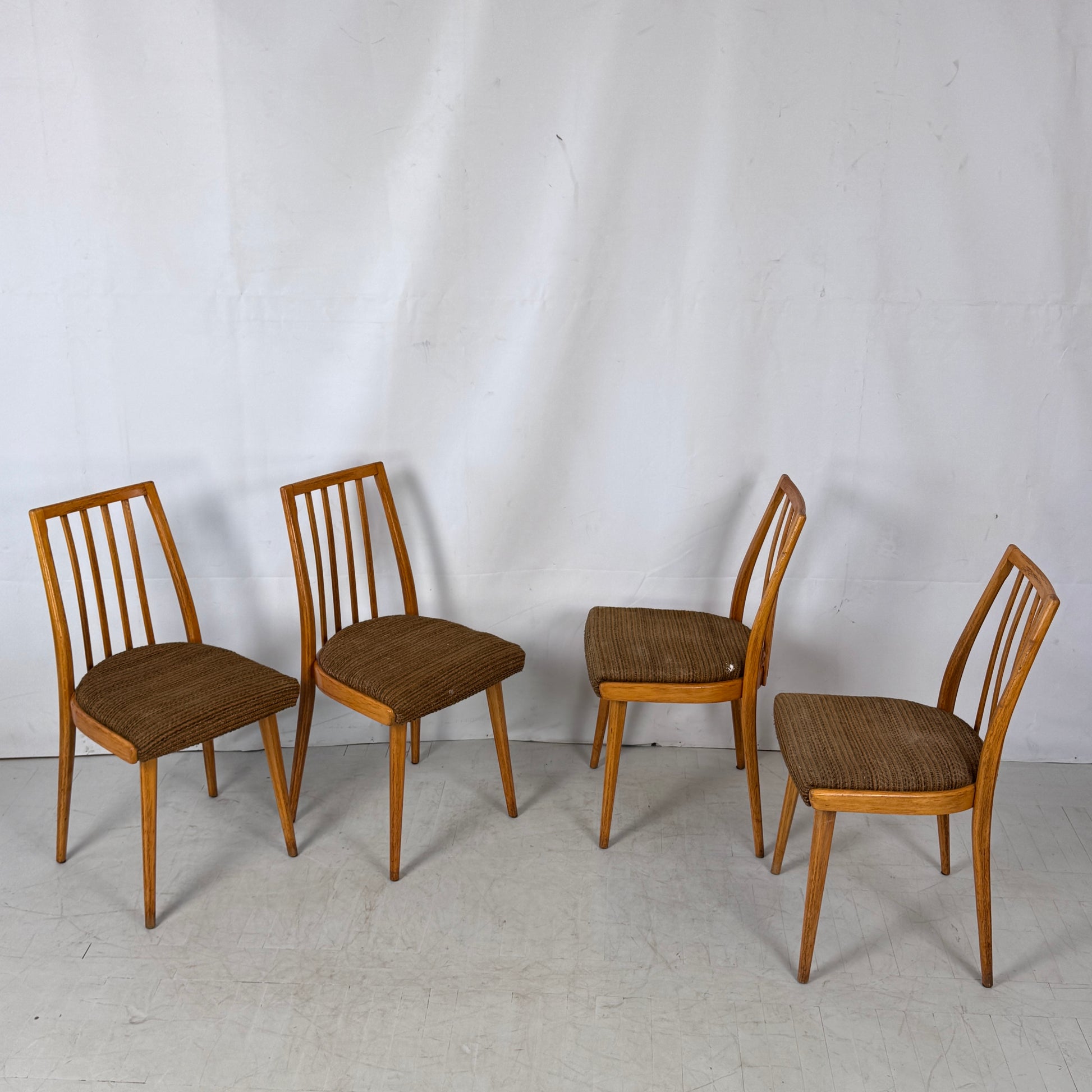 Set of vintage Czechoslovakian dining chairs from the 1960s, featuring elegant minimalist lines and a sturdy wooden frame. The chairs are in strong vintage condition, showing light signs of use consistent with age. Perfect for everyday dining or a mid-century-inspired interior.