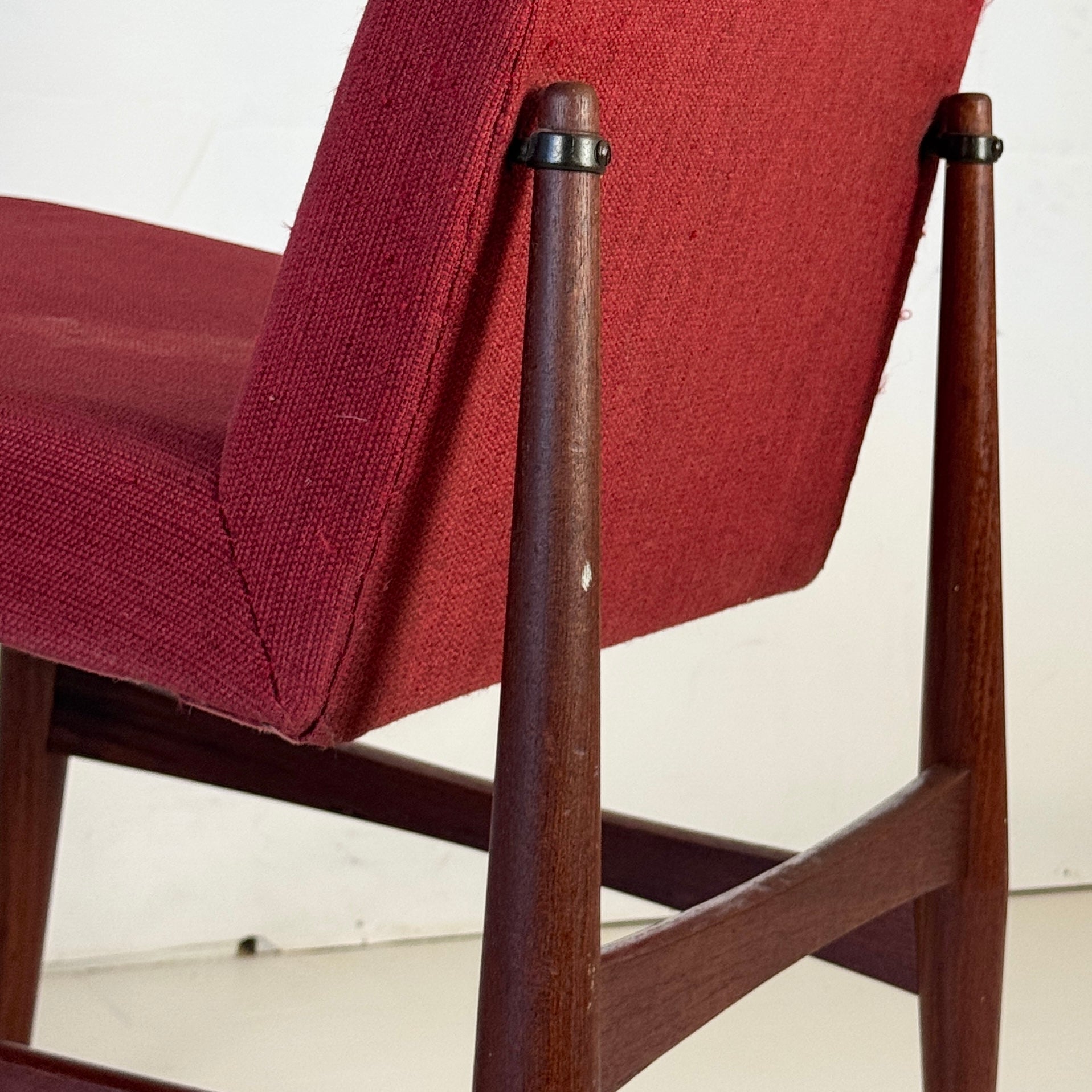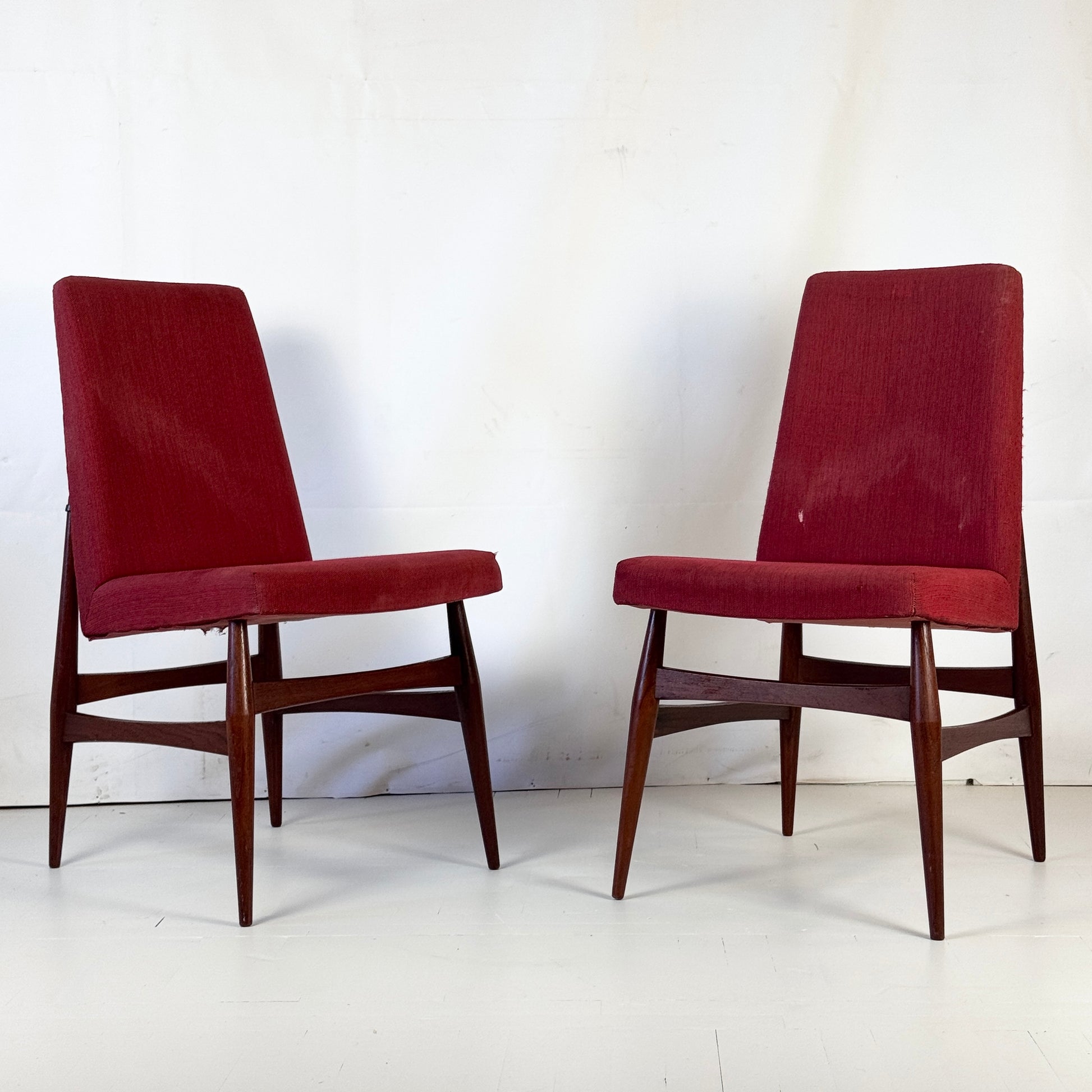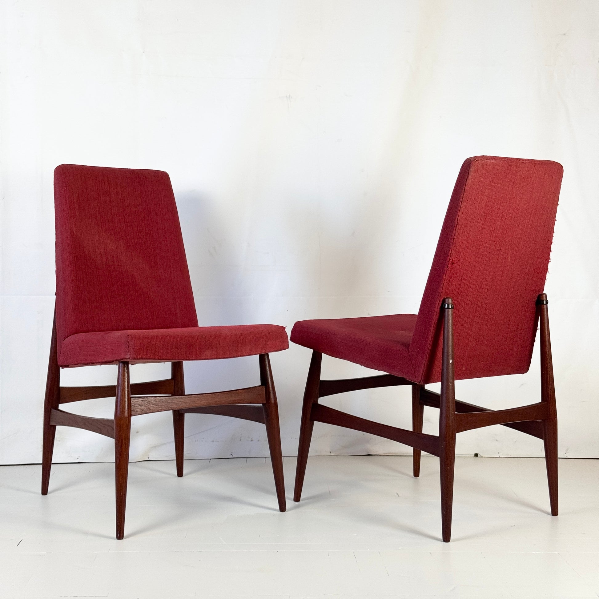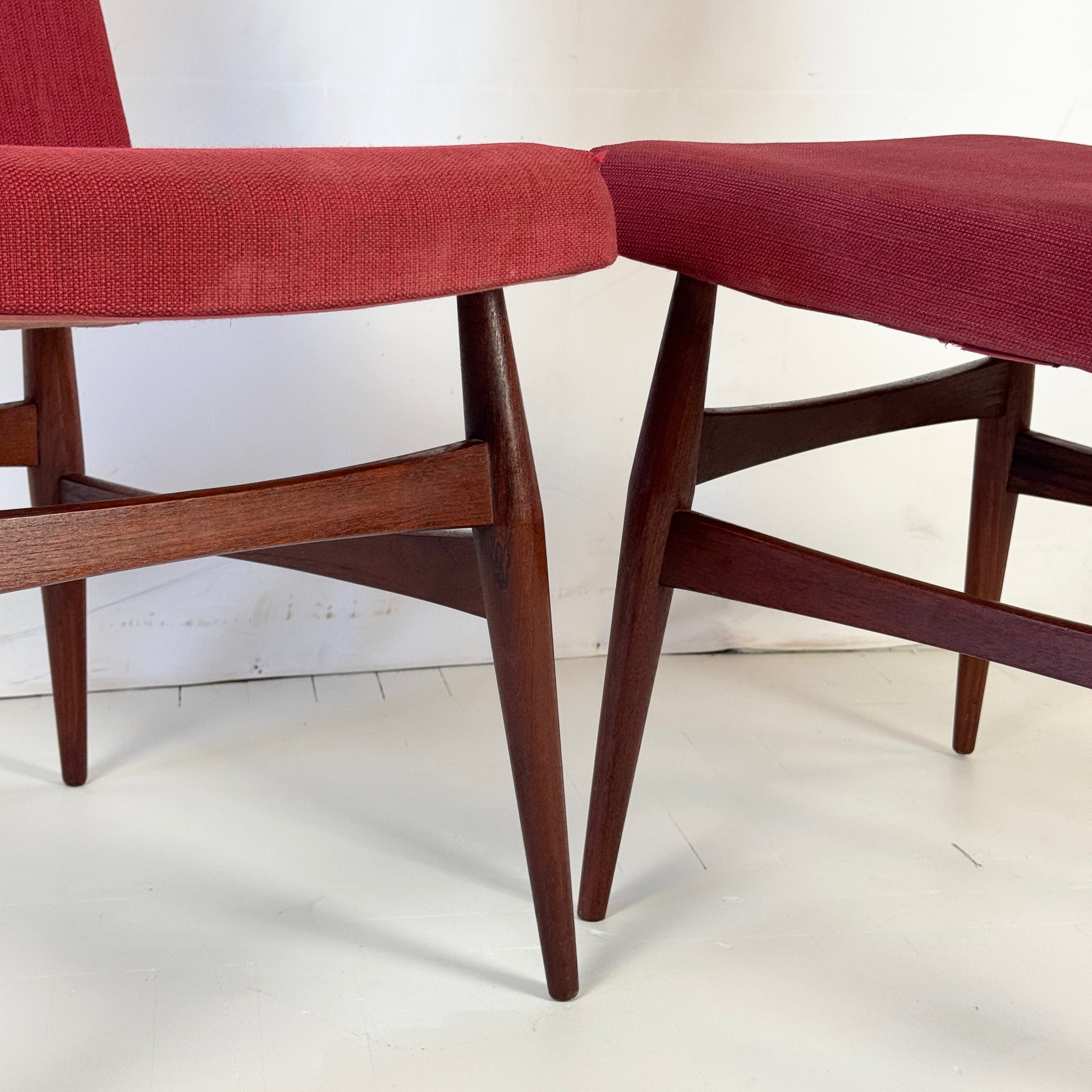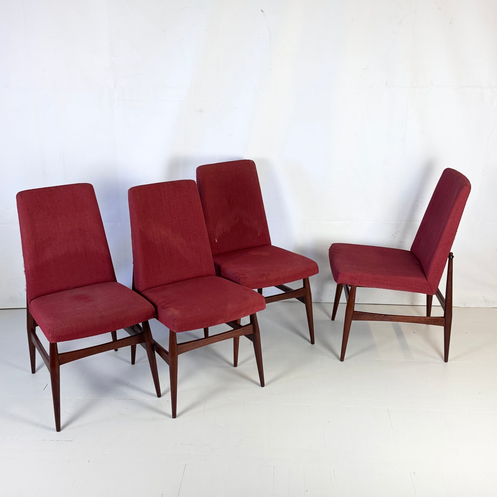 Set of 4 Danish mid-century dining chairs from the 1960s, crafted from teak with a stable, solid structure. These chairs feature a unique small ring detail on the back legs—an elegant and rare touch of craftsmanship. The upholstery is original and shows wear; reupholstery is recommended to bring them back to full comfort and aesthetic potential. Priced as a set.