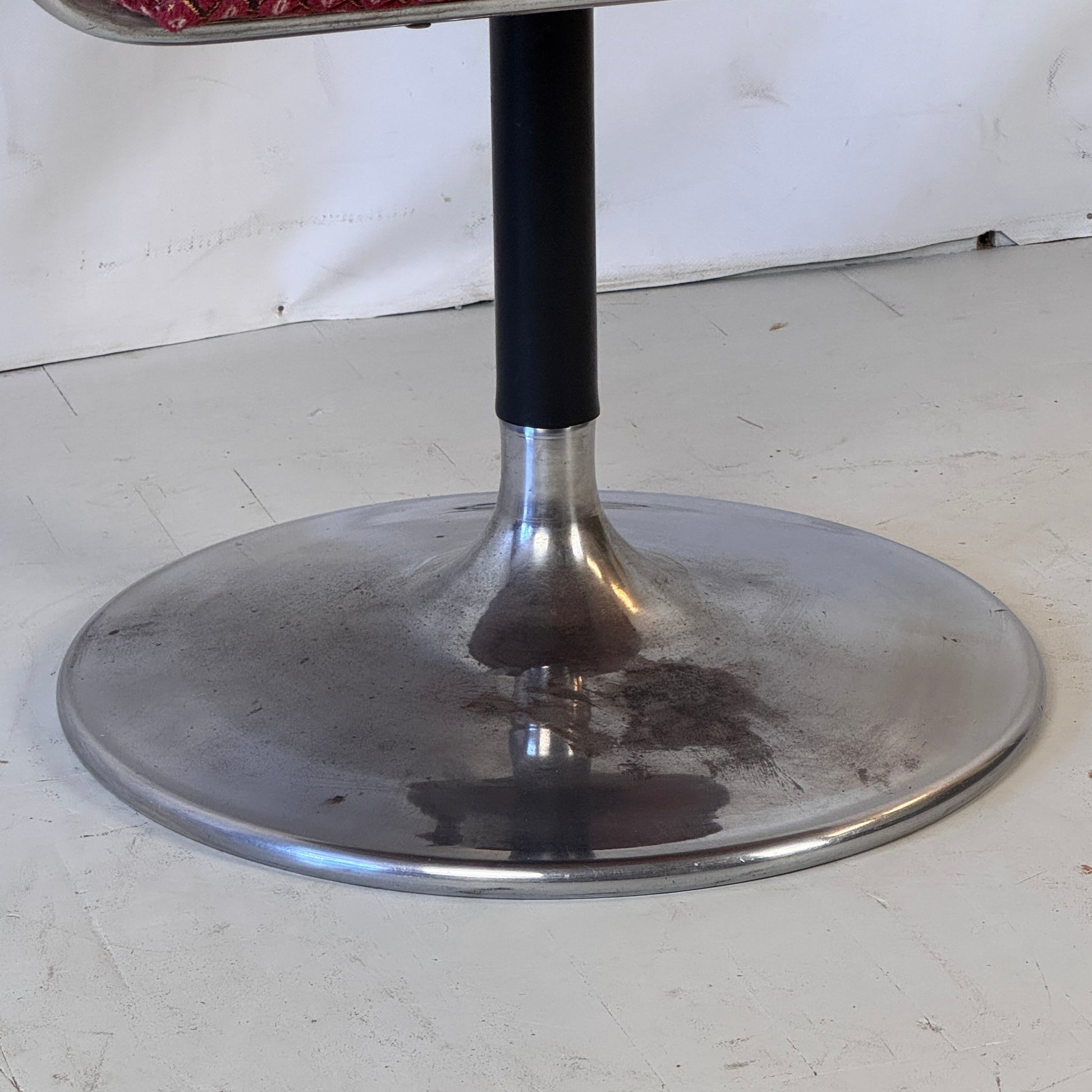 Unique Space Age armchair from the 1960s, featuring a sleek steel swivel base and bold futuristic form. The chair remains in its original vintage condition, showing light signs of use consistent with age.
