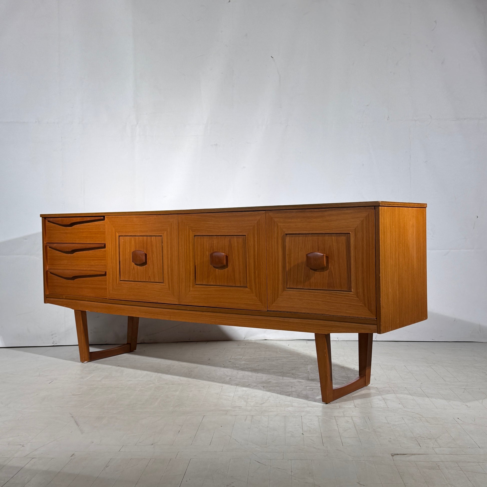 Elegant British Stonehill “Stateroom” sideboard from the 1970s, crafted from beautifully grained teak with clean lines and sculpted handles. This piece embodies the refined simplicity of mid-century British design while offering generous storage with drawers and compartments.