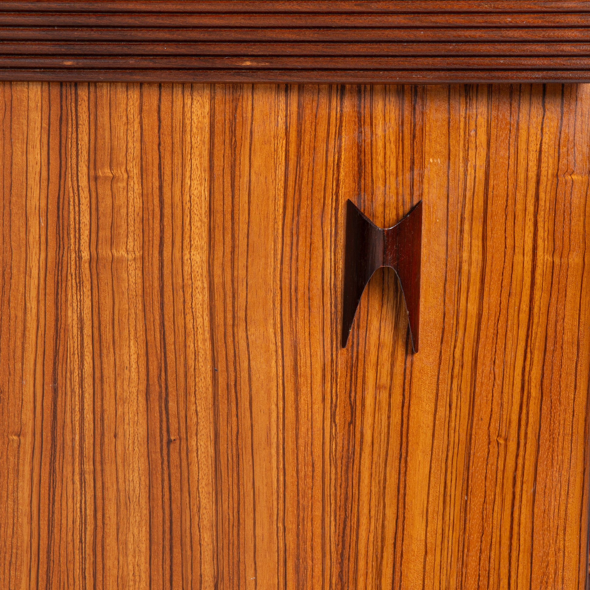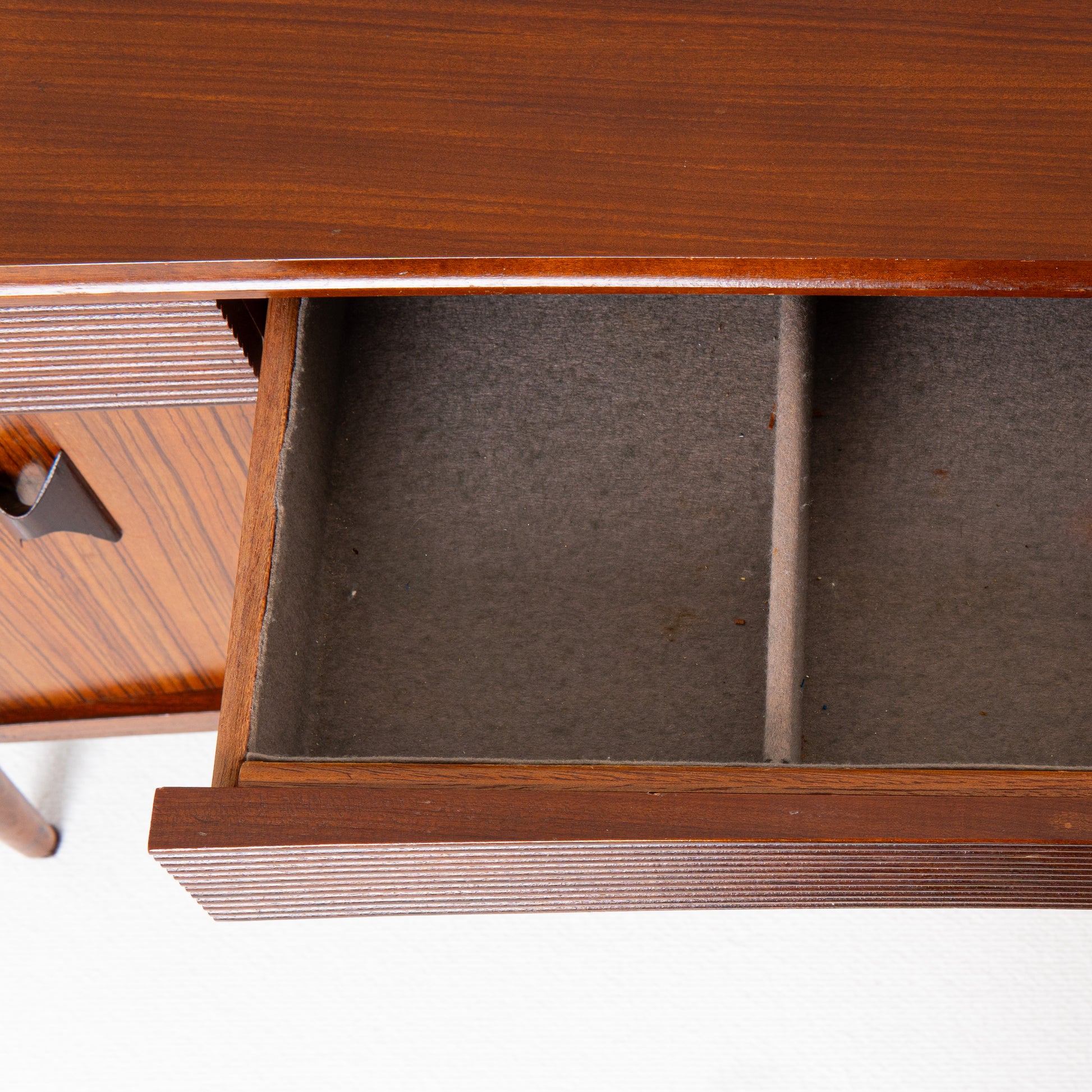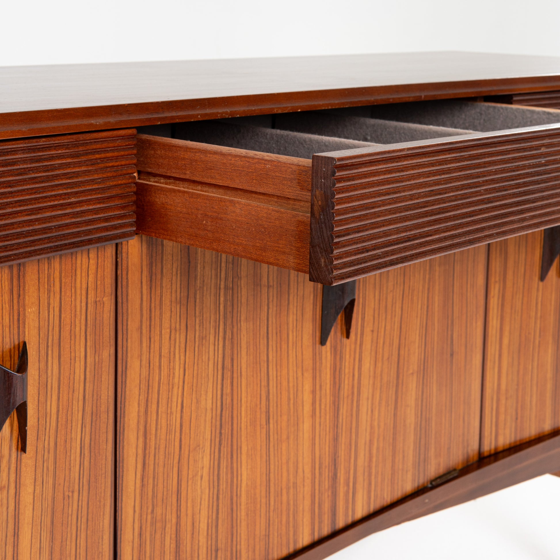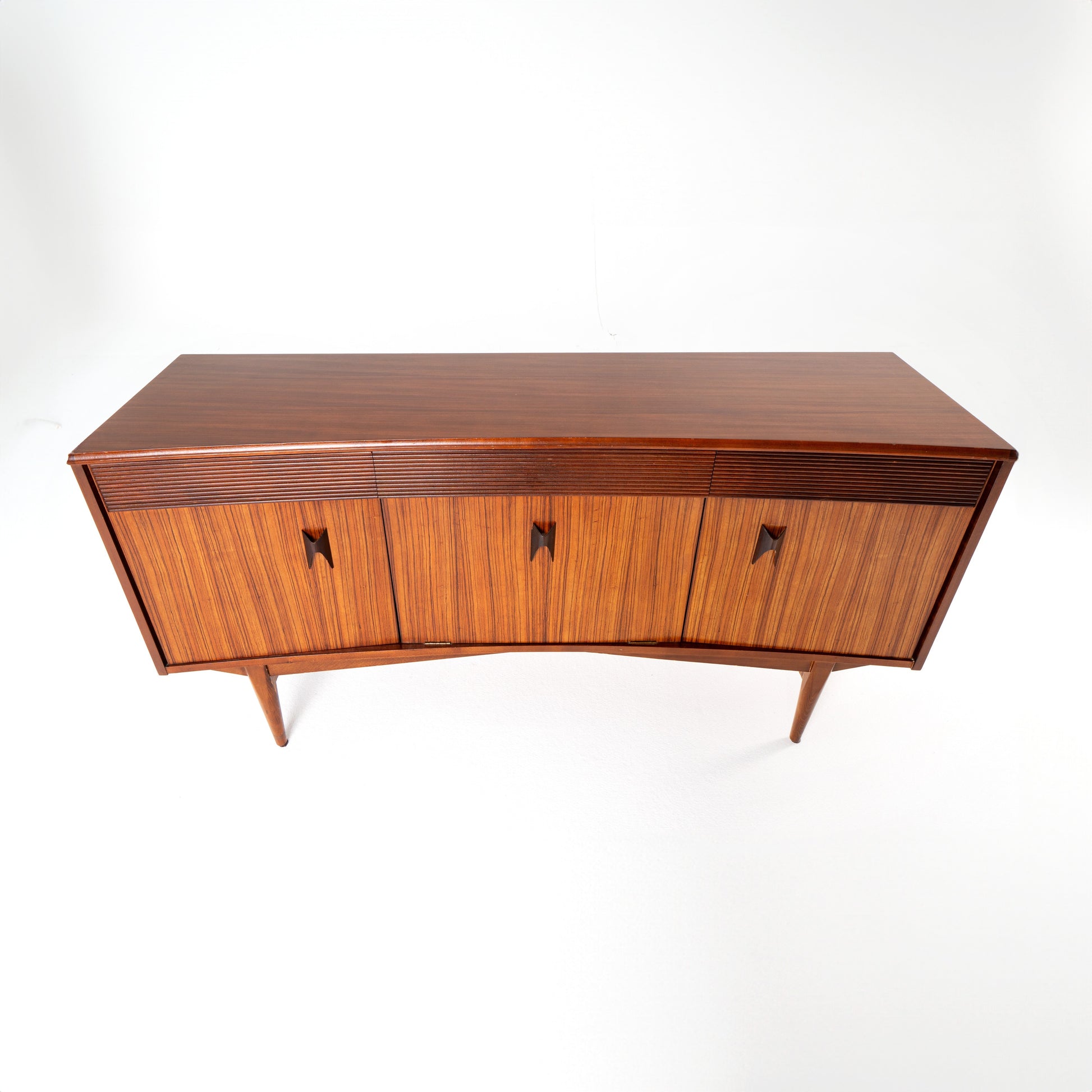 This is a British made Elliots of Newbury sideboard made of teak wood in 1960s. It is is very nice condition with only few minor signs of use. Its curved front makes it unique. Has one drawer and 3 lower compartments with very nice rosewood handles.