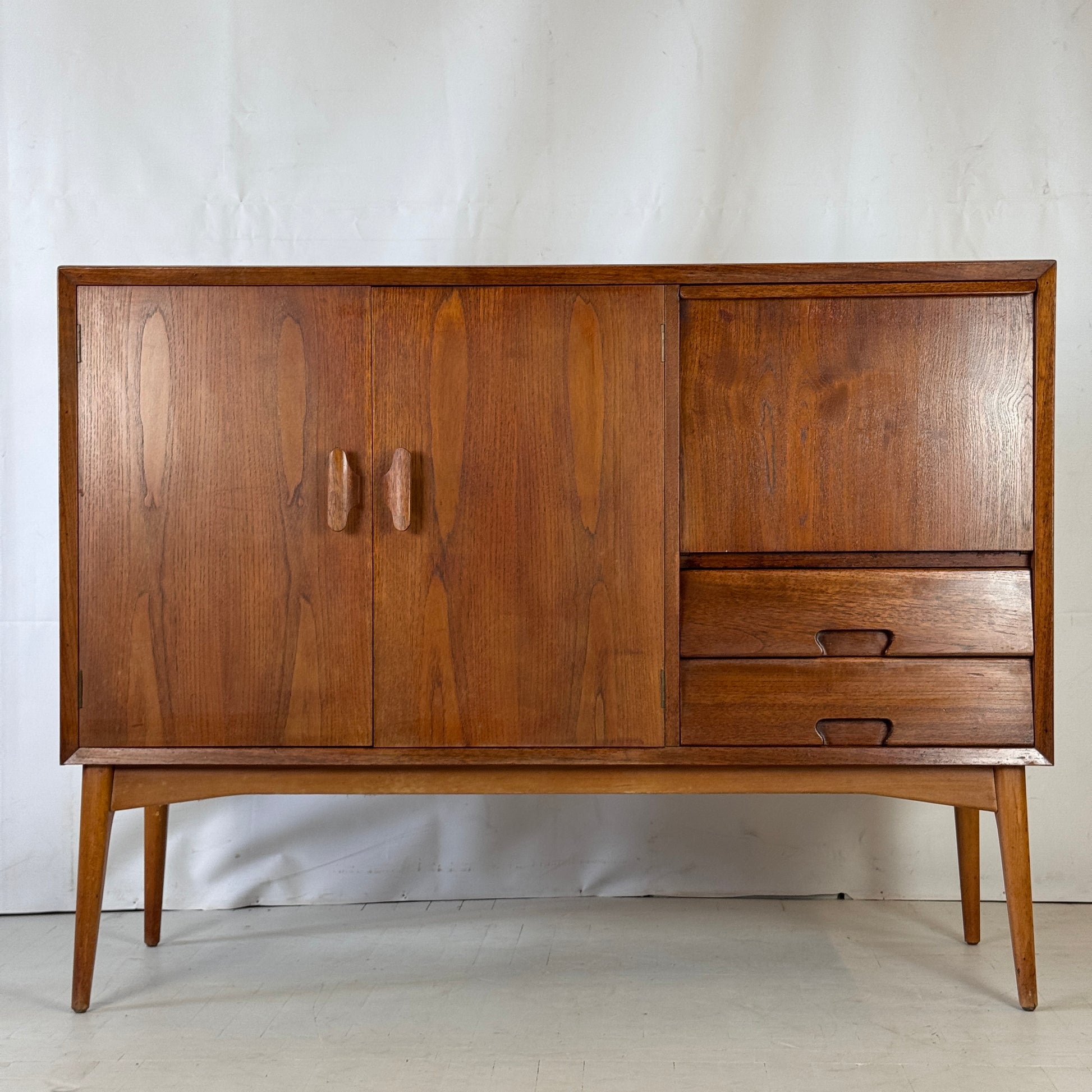Mid-century teak sideboard designed by Andrew Milne for Everest, a Long Eaton-based British cabinet maker, in the 1960s. This beautifully handcrafted piece features vibrant teak wood, shaped handles, a bar compartment, and practical drawers with built-in handles. Everest’s designs drew inspiration from Scandinavian aesthetics while incorporating bold, organic details, making this cabinet both functional and visually striking.
