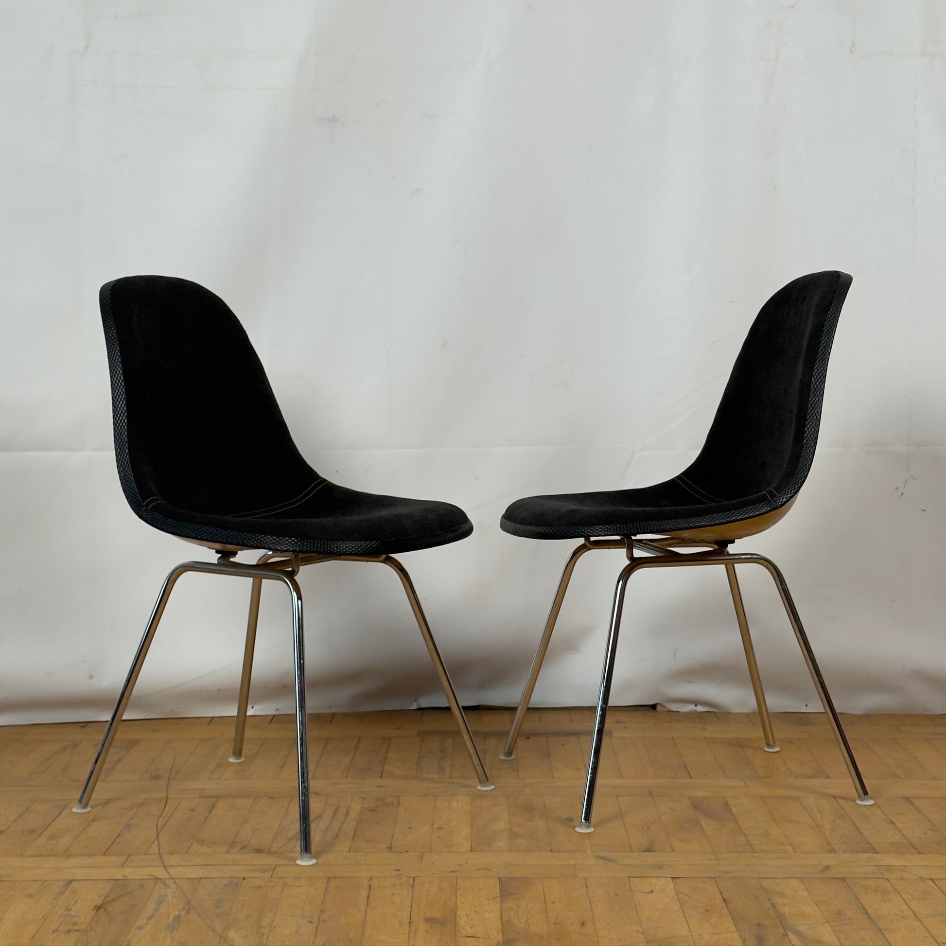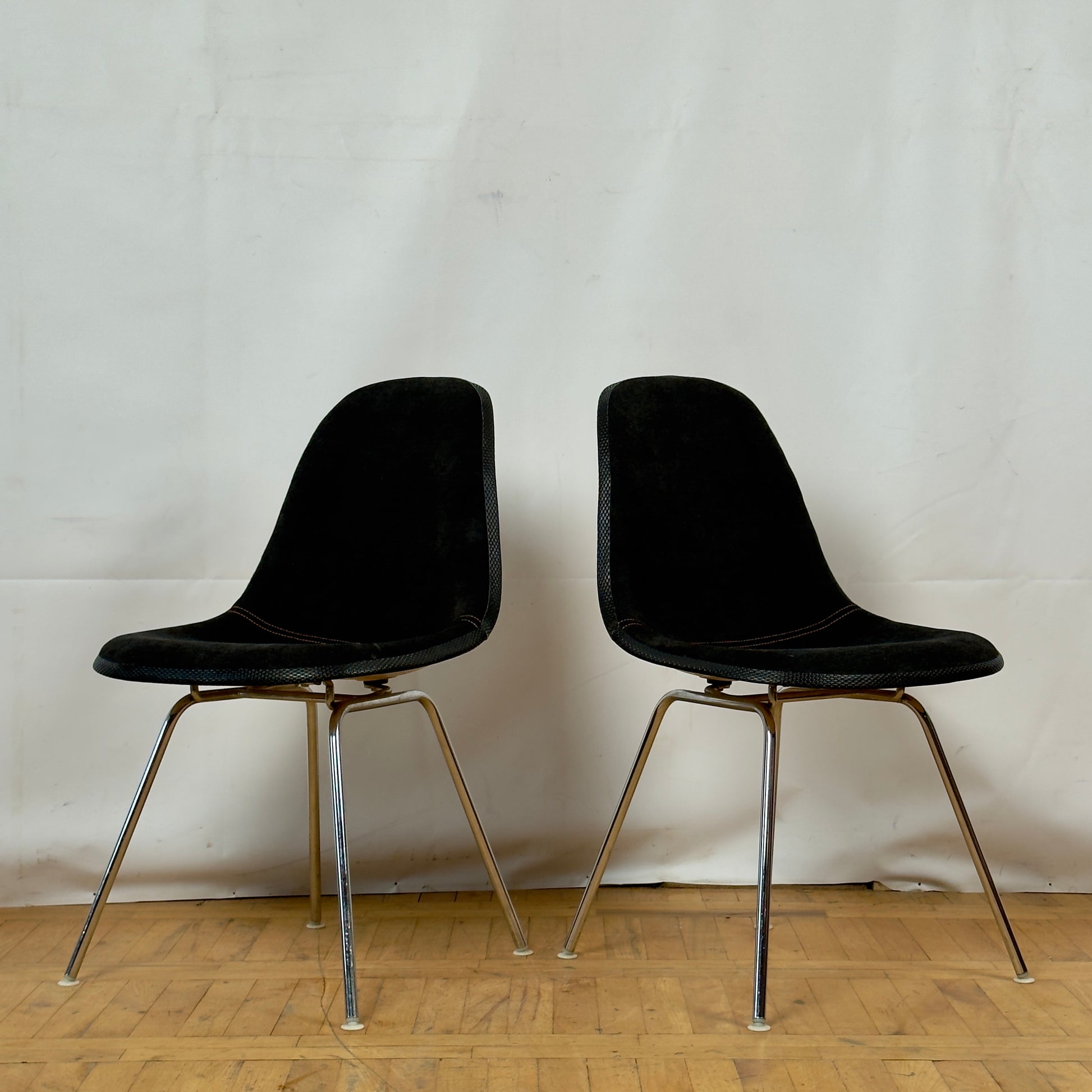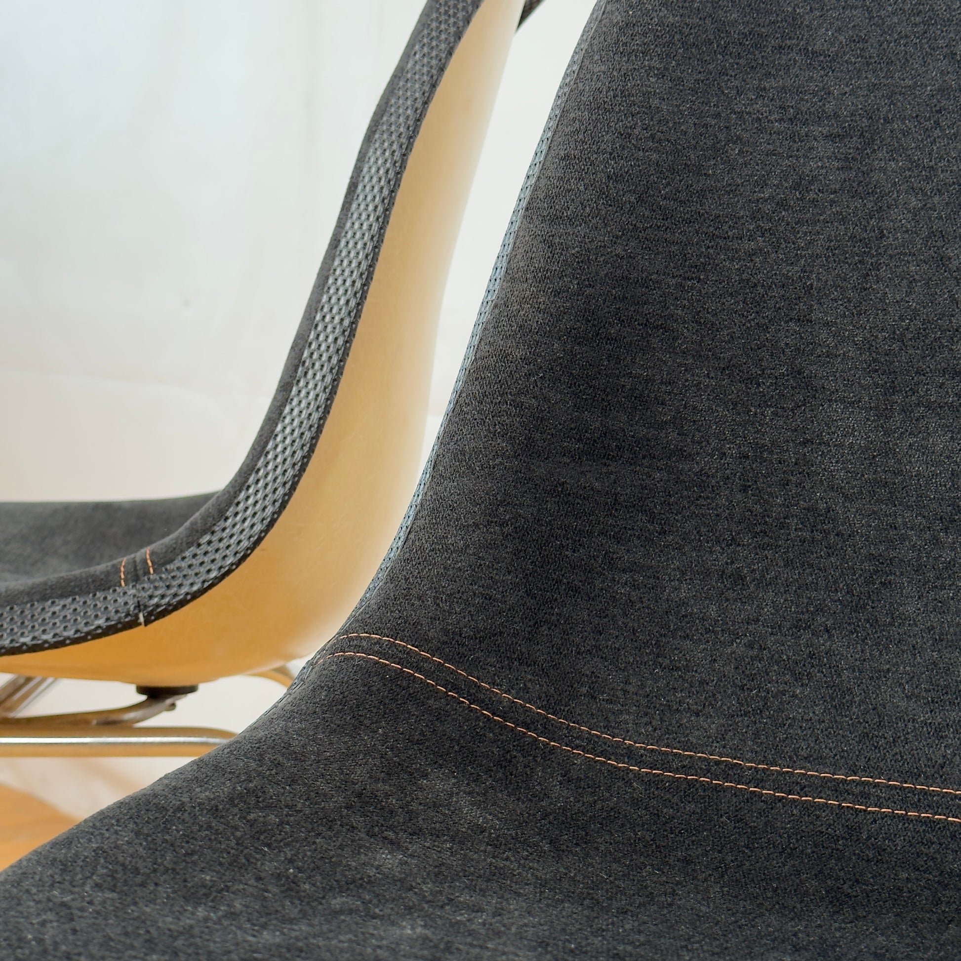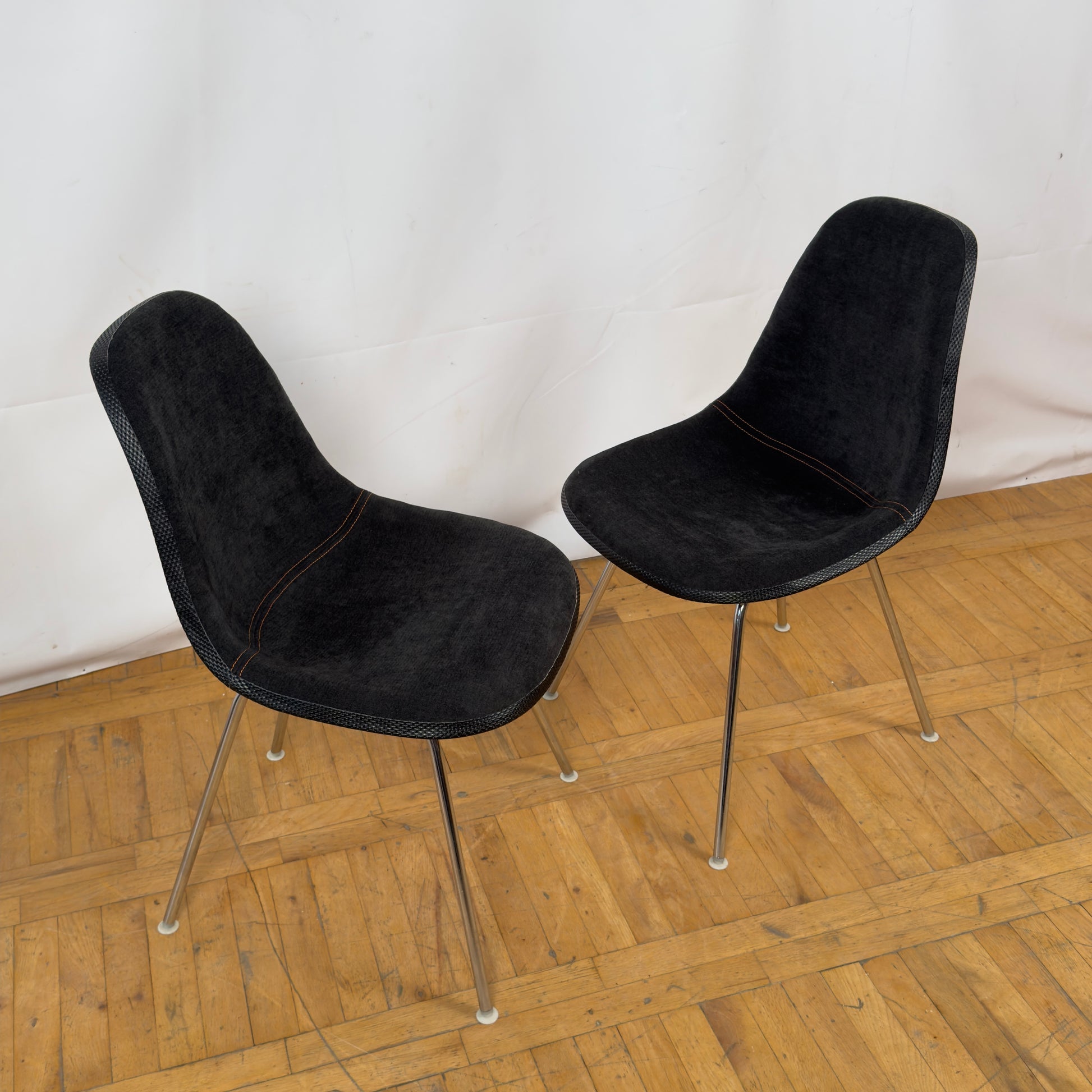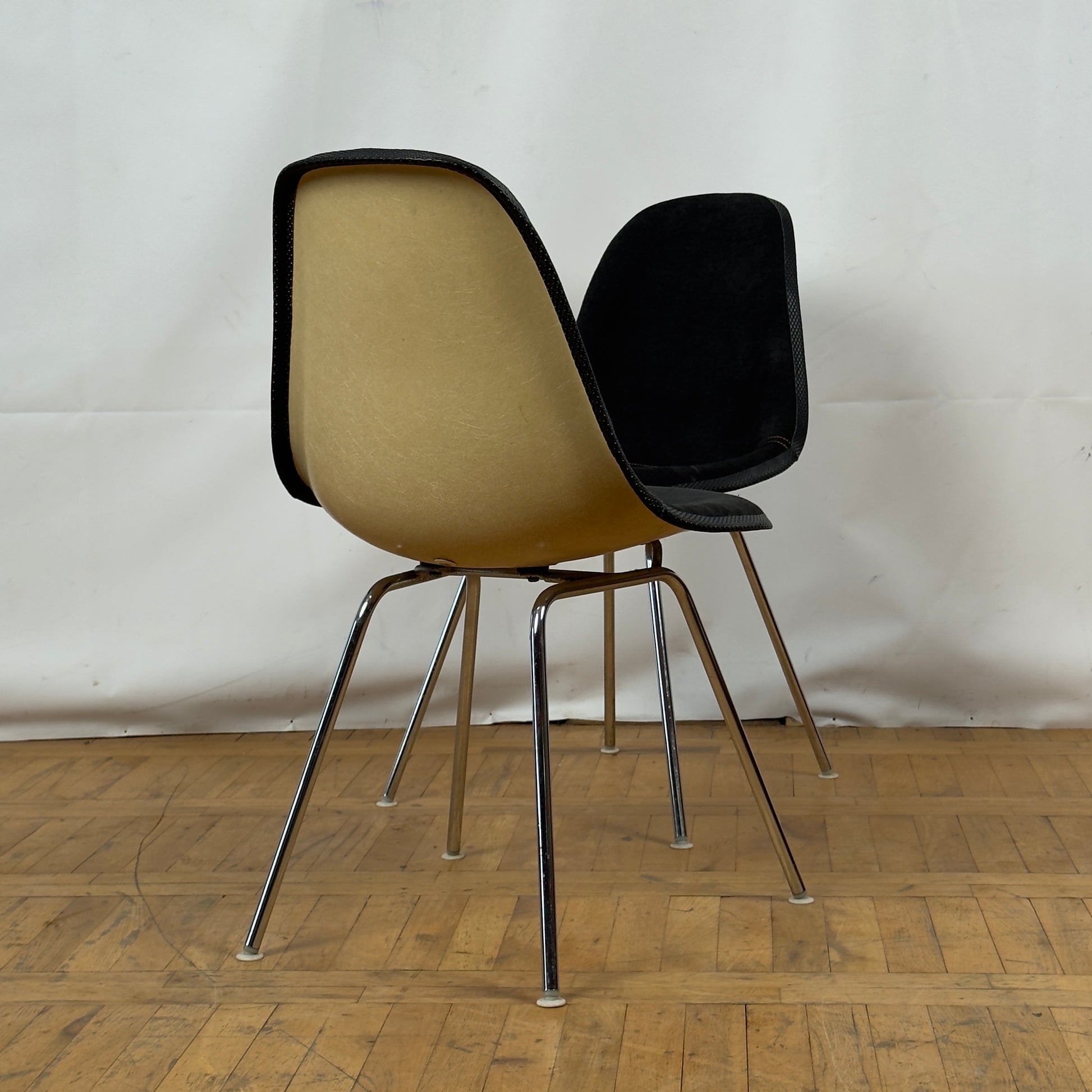An original vintage Herman Miller DSX fiberglass side chair designed by Ray & Charles Eames in 1971. This authentic bucket seat features its classic fiberglass shell, newly upholstered in black textile for a fresh, modern look while retaining its timeless mid-century style. Perfect as a dining chair, desk chair, or statement piece for any contemporary interior.