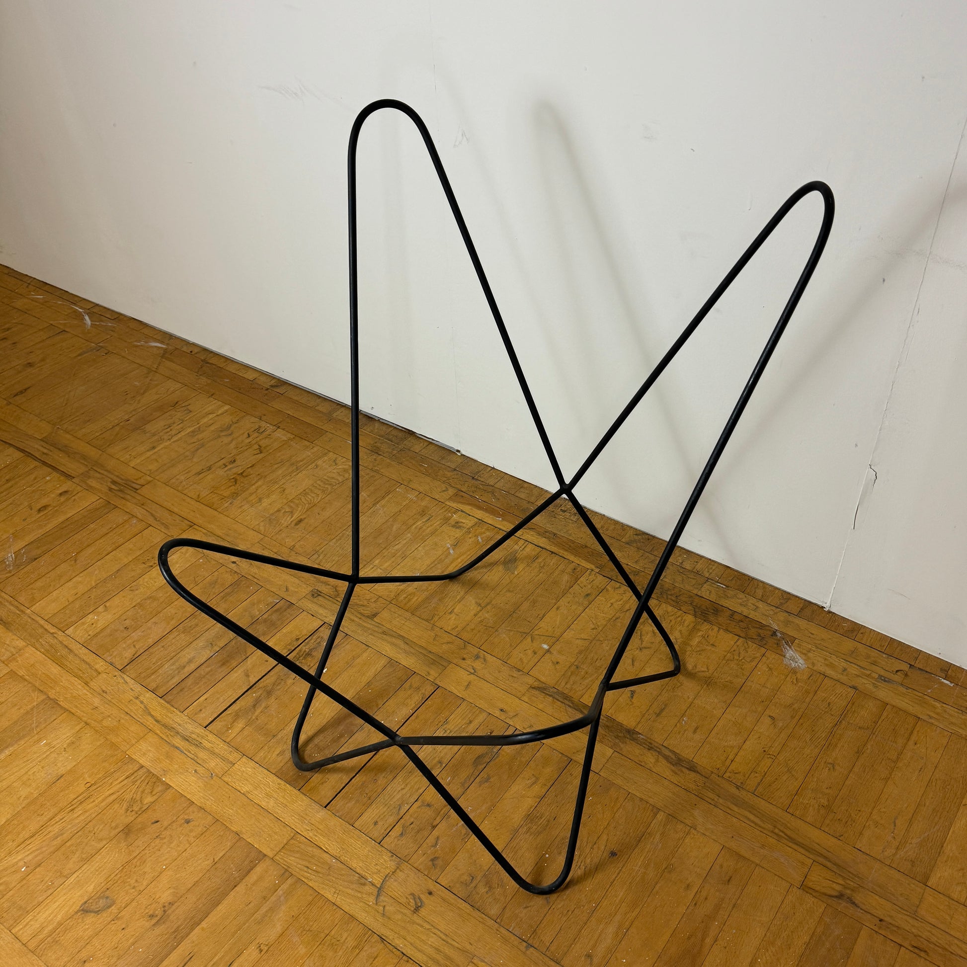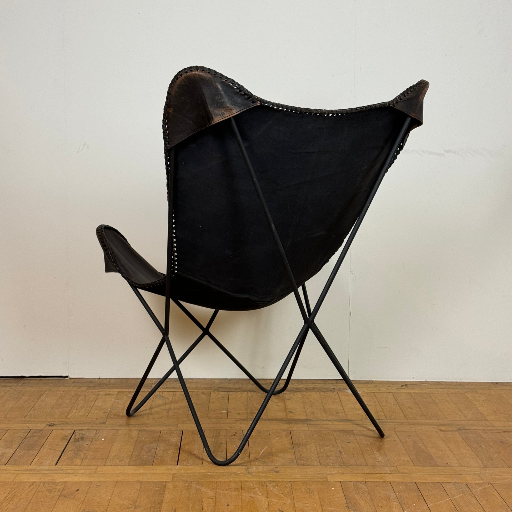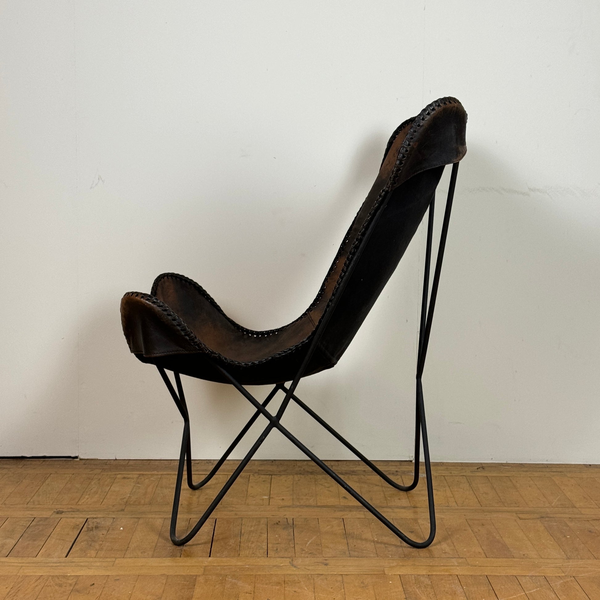 Vintage butterfly chair from the 1990s, featuring a black-painted steel frame and a genuine leather sling. This iconic design offers a practical, lightweight structure with exceptional comfort—perfect for both indoor and outdoor spaces with a modern, relaxed vibe.